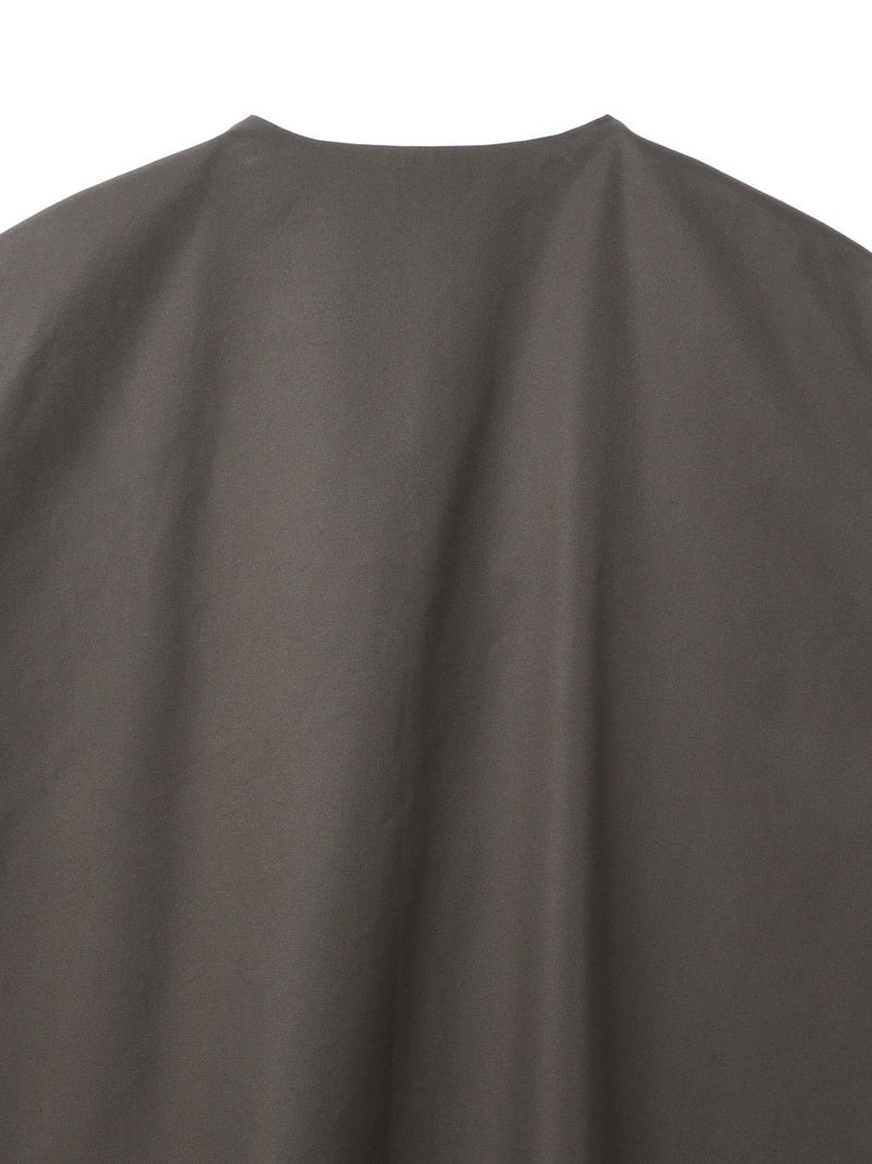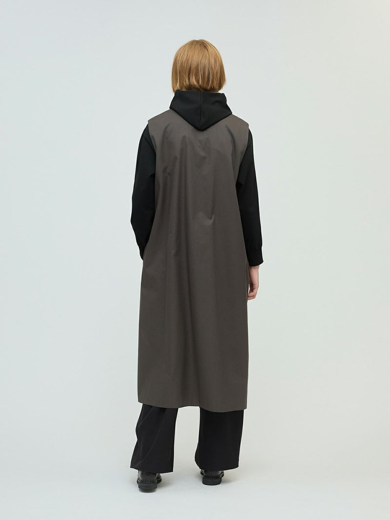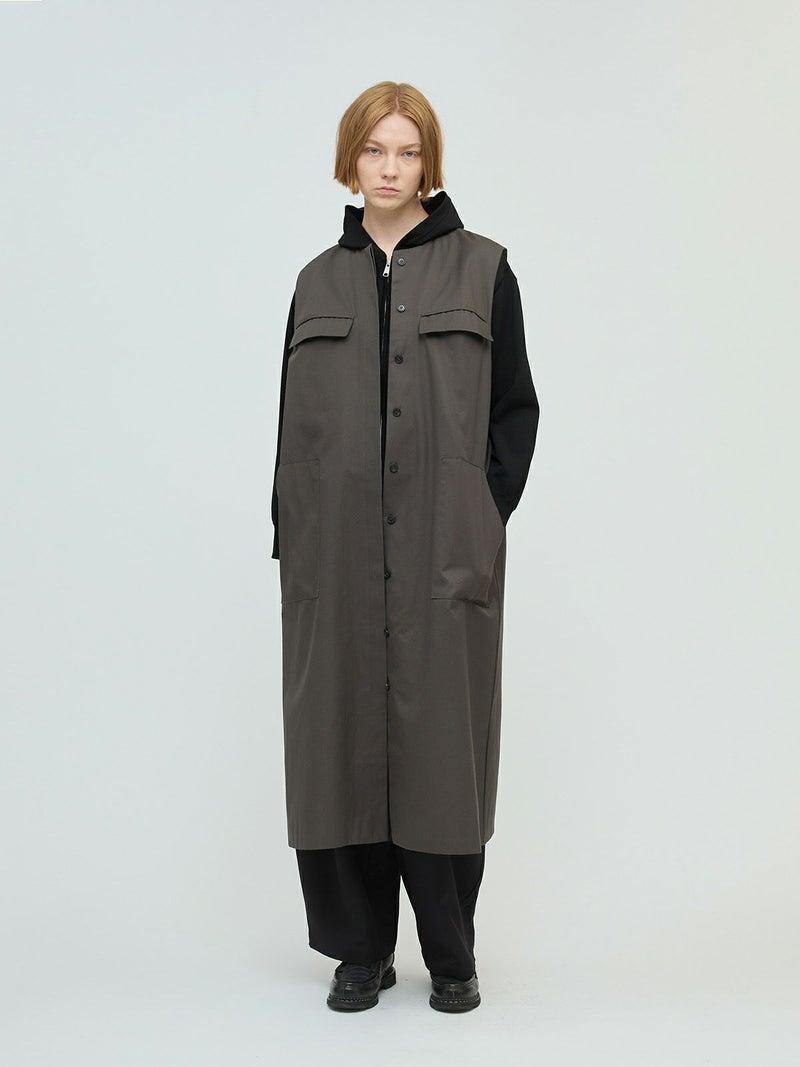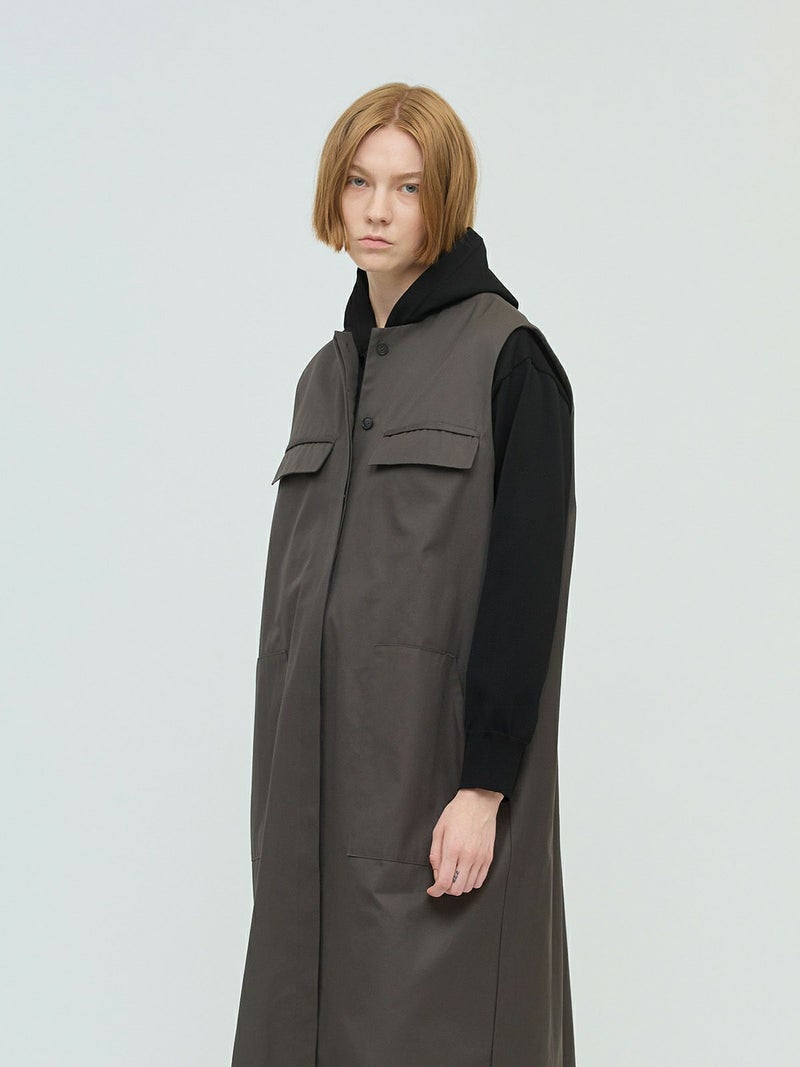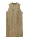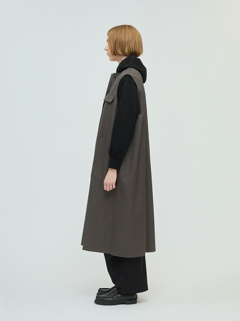 メンズライクなワーク調のデザインが特徴のポケット付クルーネックロングジレ。ジャケットの袖を落としたようなデザインを表現しました。長めの丈にしており、ワンピースでもジレとしても着こなしができる1枚です。フロントは比翼仕立てにしているのでよりすっきりとしています。しっかりとしたハリのある生地感で胸に蓋付ポケットが二つ、手がすっぽりと入る大き目のポケットが付いています。長めの丈ですが、小柄な方にも着こなせるロングジレです。