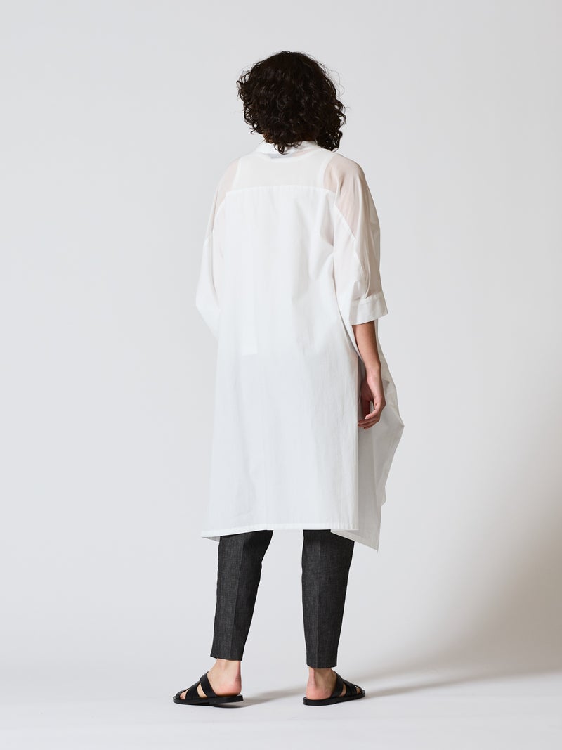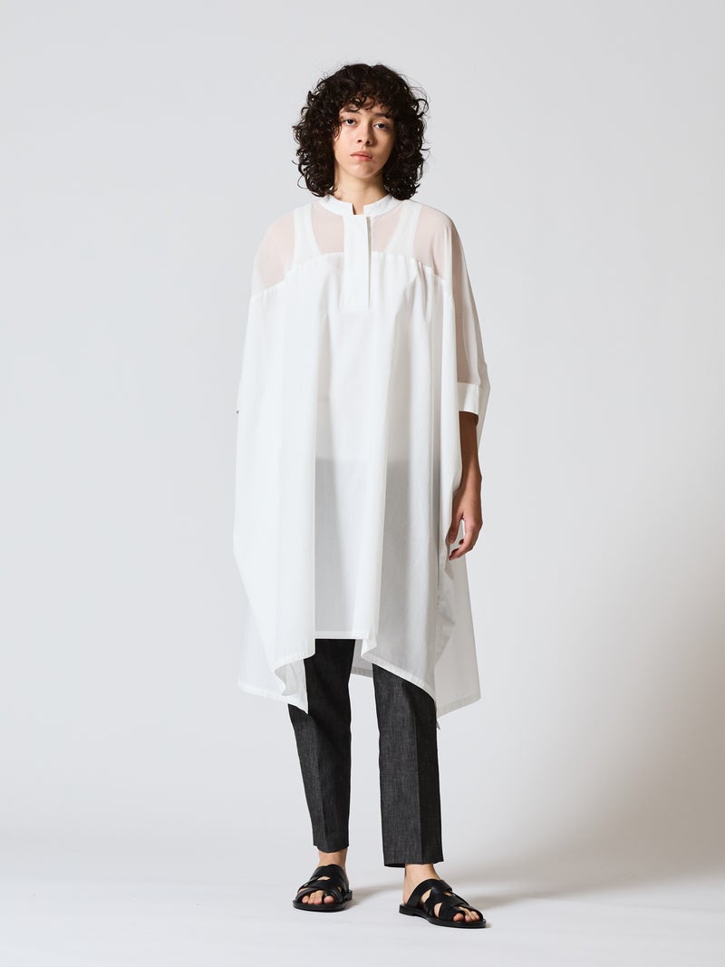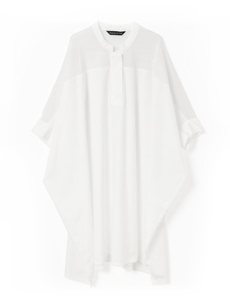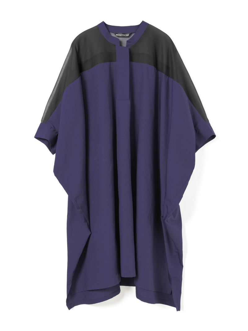 mizuiro ind定番アイテムでもあるシアーショルダーワンピースが新色を追加し再入荷しました。透け感を上品にミックスしたデザインが特徴的で、肩のヨーク部分をシアー素材で仕上げた魅力的な1枚。袖口や身幅にゆとりがあり、夏も涼しく着用していただけます。首元はすっきりとしており、サイドに落ち感のでるシルエットは優雅に動きのあるデザイン仕上げた印象的なワンピースです。ボトムとの相性がよく重ね着がお勧め。清楚でベーシックな雰囲気の4色のカラー展開に加え今季はパープルを追加しました。新鮮さも加わったおすすめの1枚です。2-230134/シアーショルダースタンドカラーワイドシャツも展開。