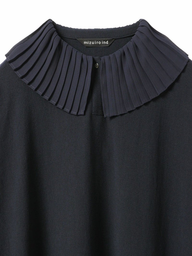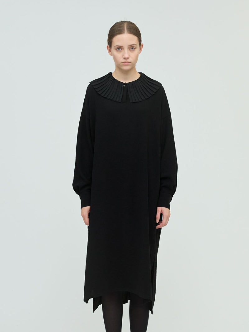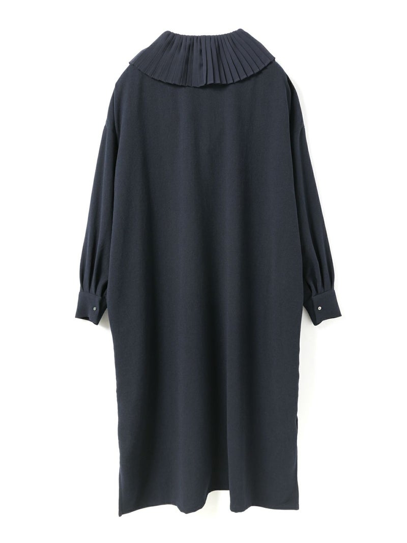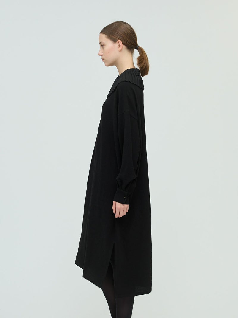 プリーツカラーの襟元が印象的なプリーツカラーワンピースです。モードな着こなしもエレガントな雰囲気も持ち合わせた上品な1枚です。襟元は隠れボタンのポロシャツタイプで着脱のしやすいデザイン。若干の前後差が付いておりサイドスリットが入っています。すっきりとしたワントーンのシックなデザインなので、オケージョン対応にもお勧め。プリーツカラーを出して重ね着をすると華やかな印象になり素敵です。同シリーズ3-230085/プリーツカラーシャツプルオーバーも展開。