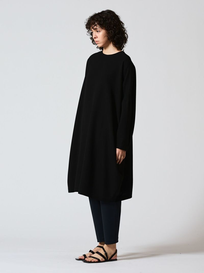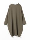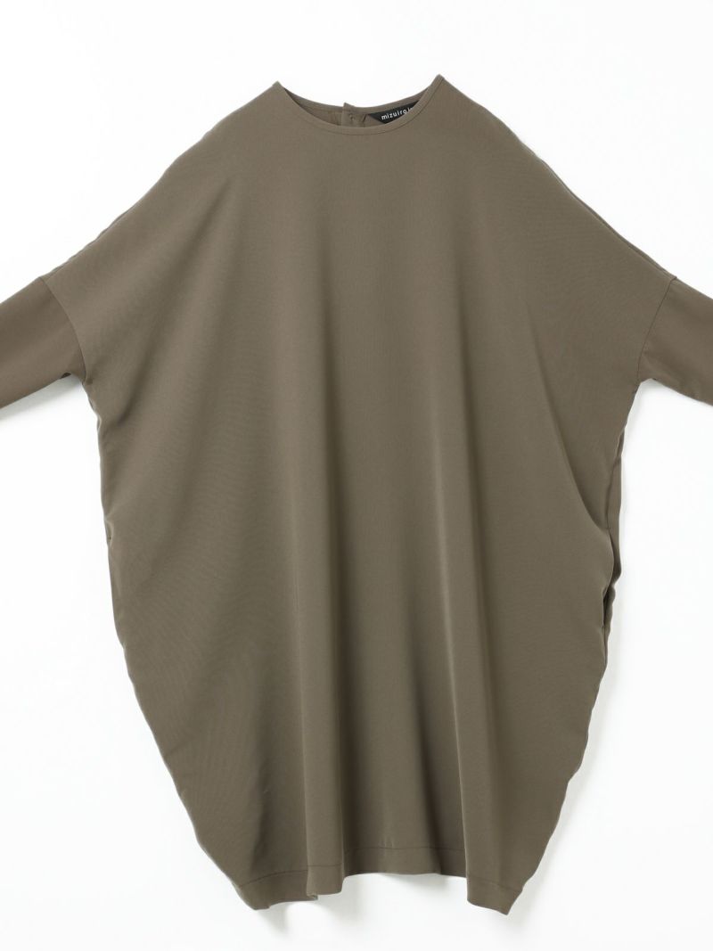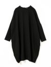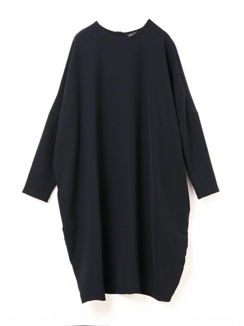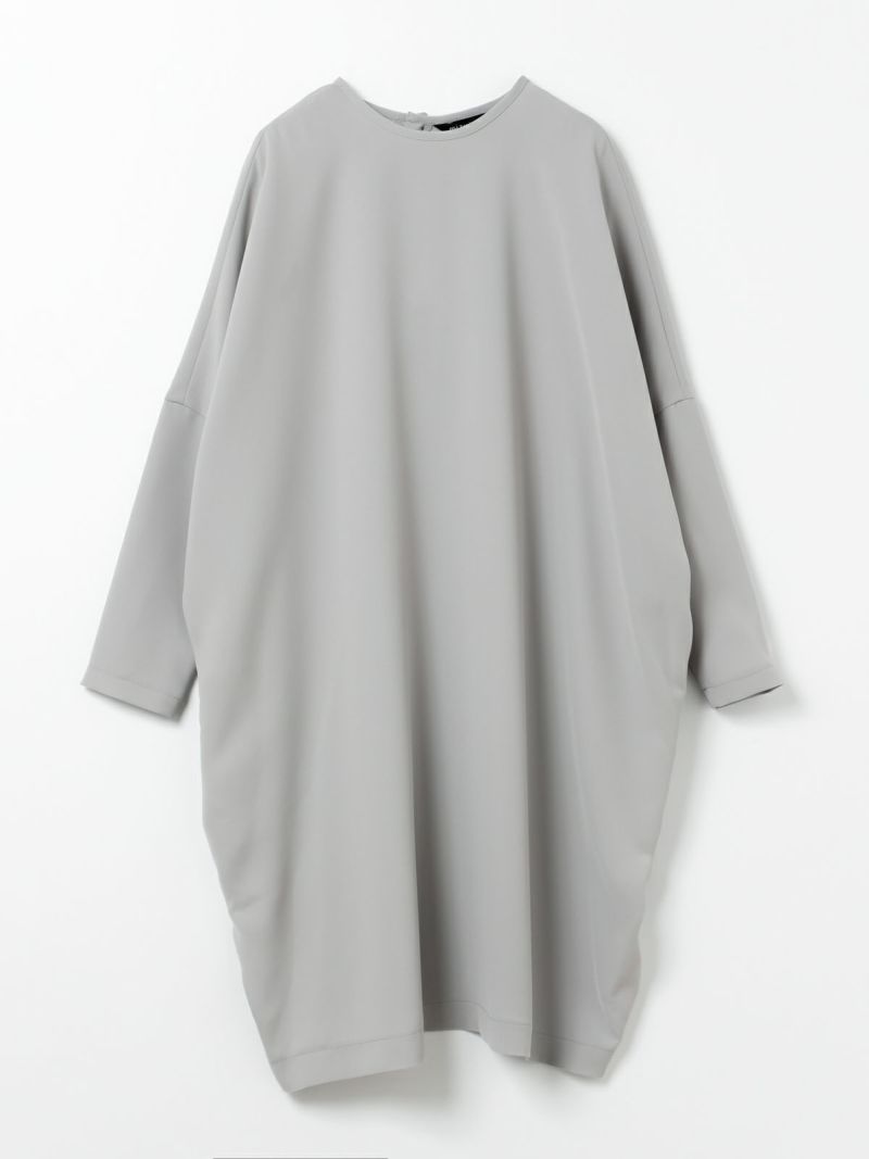 ダブルクロスのしわになりにくい生地を使用したコクーンワイドワンピースです。mizuiro indらしい滑らかな動きのあるシルエットが魅力的。首の詰まったスッキリ感のあるデザインはワイドなコクーンシルエットとのバランスのとれたデザインを表現。1枚で着用してもレギンスやスカートなどボトムを合わせたコーディネートもお勧めです。バックネック部分にボタンが付いた着脱しやすいデザインです。