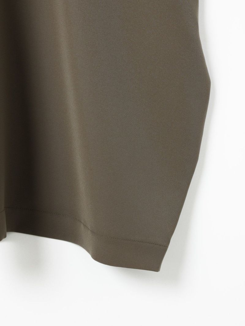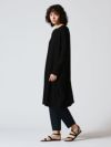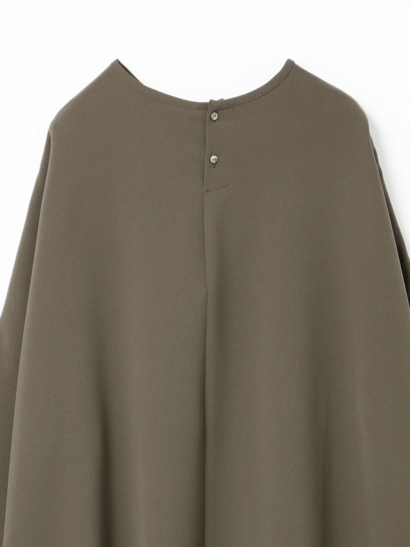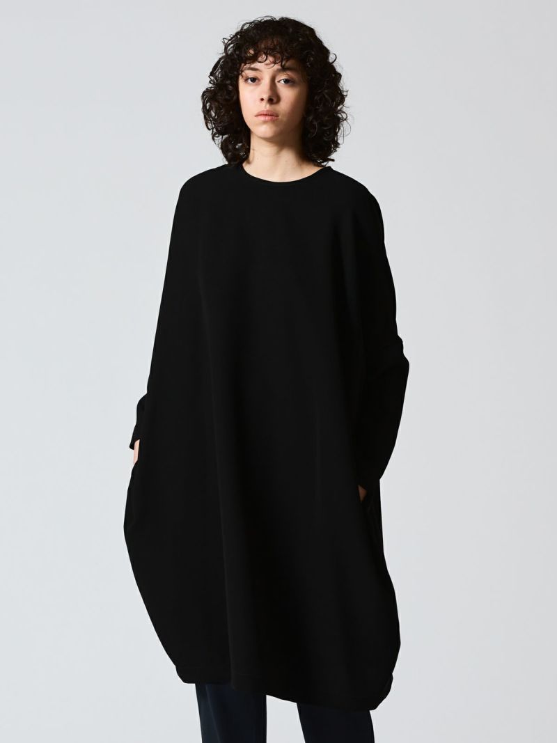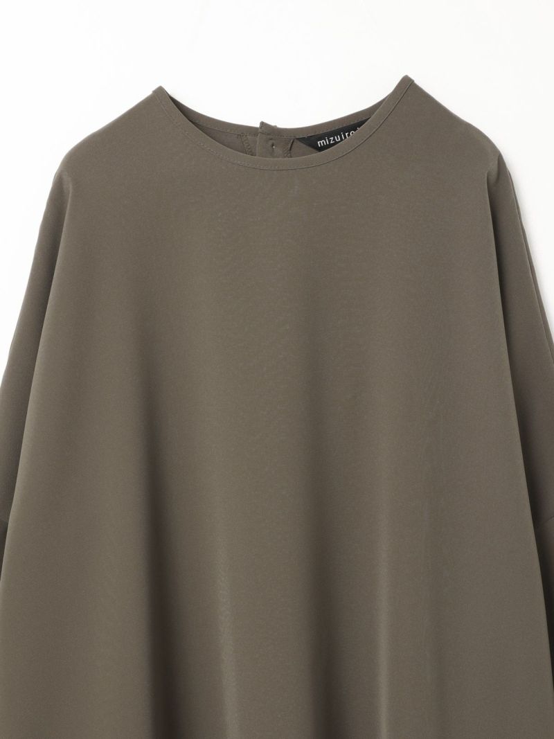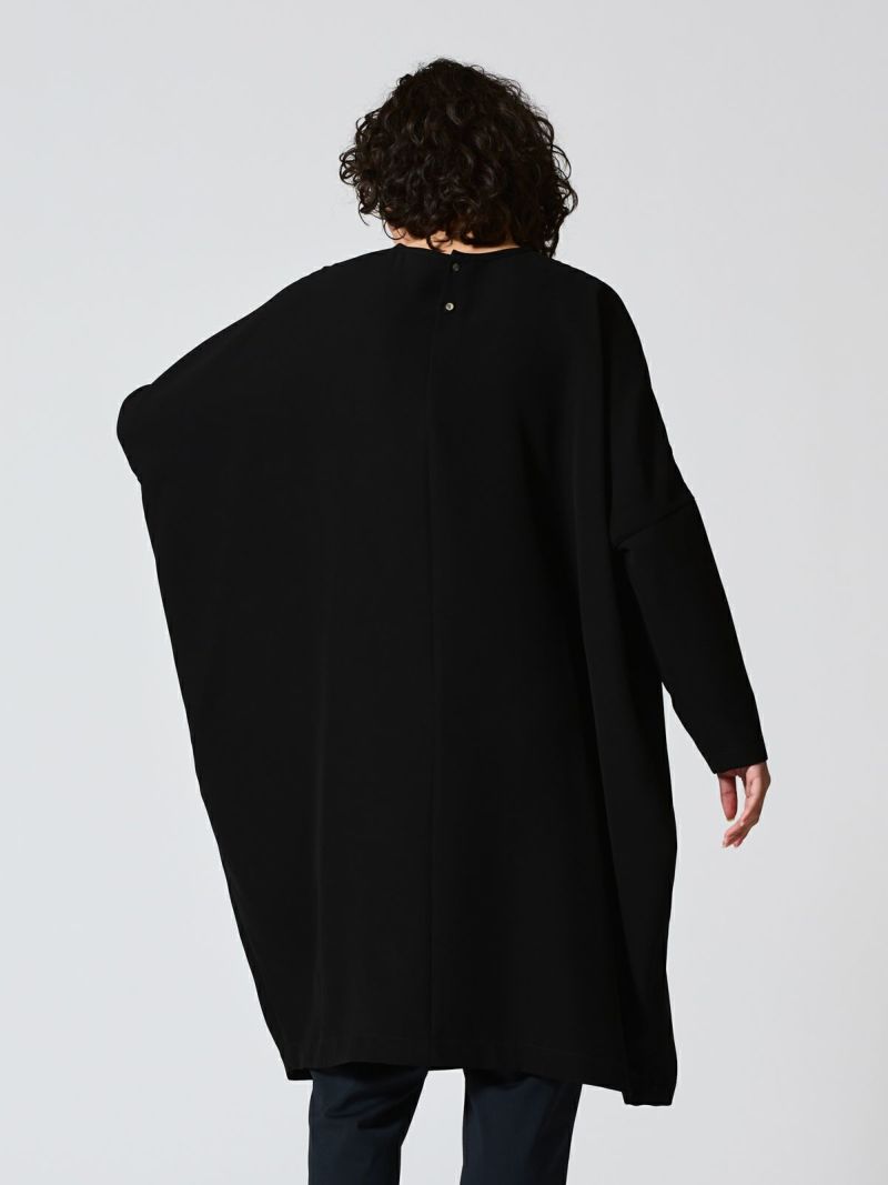 ダブルクロスのしわになりにくい生地を使用したコクーンワイドワンピースです。mizuiro indらしい滑らかな動きのあるシルエットが魅力的。首の詰まったスッキリ感のあるデザインはワイドなコクーンシルエットとのバランスのとれたデザインを表現。1枚で着用してもレギンスやスカートなどボトムを合わせたコーディネートもお勧めです。バックネック部分にボタンが付いた着脱しやすいデザインです。