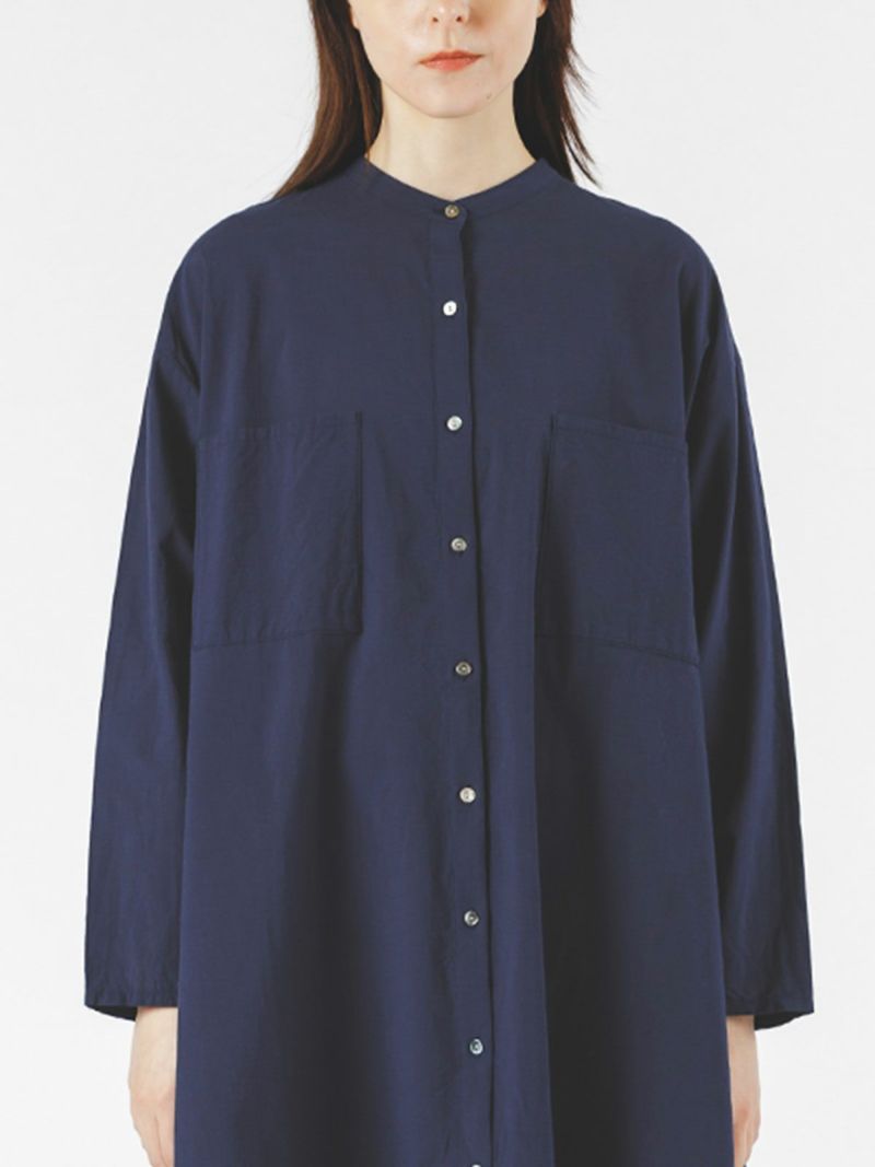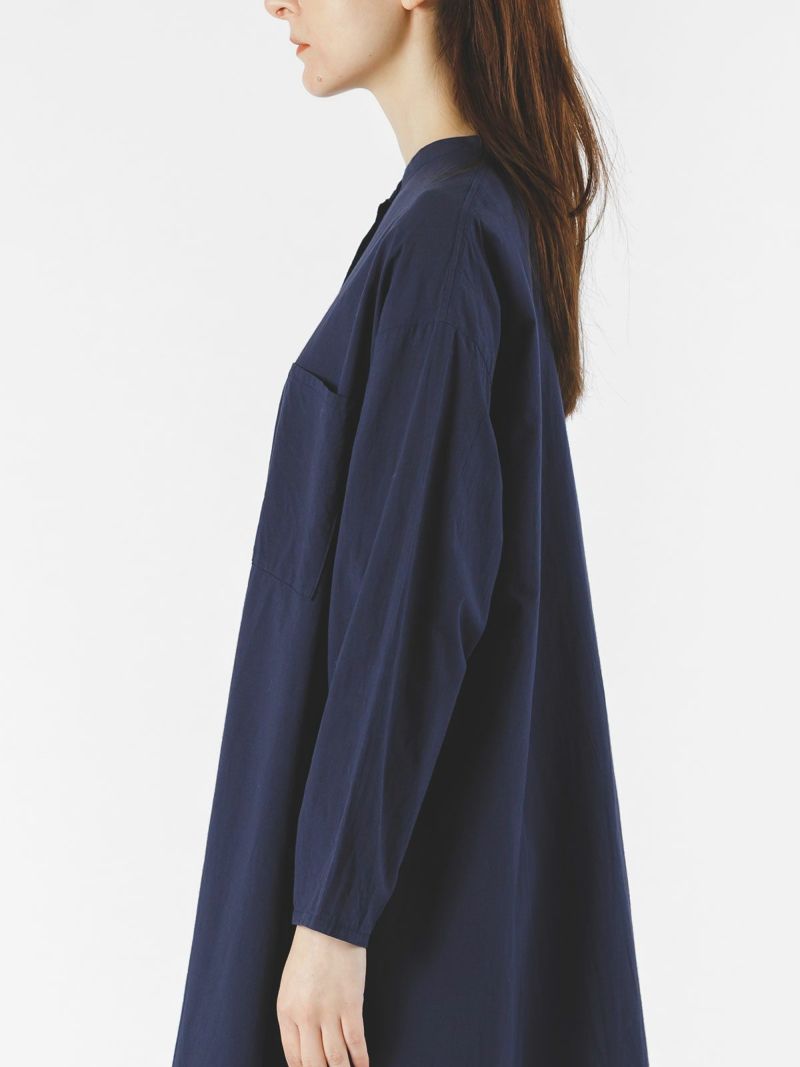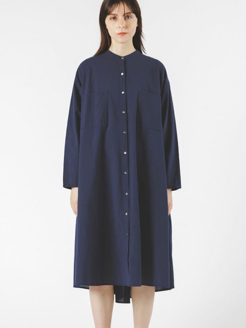 mizuiro indの定番型ワンピース、60ローンの素材を使用したポケット付バンドカラーロングワンピースです。大きな胸のポケットが特長。スッキリ感のバンドカラーの襟元から膝下までのフレアラインがキレイなシルエットで、背中にタックを施した動きのあるシルエットを表現しました。レイヤードアイテムとしてもお勧めの1枚です。着心地のよいコットン生地で、気温の変化によって中に重ね着ができ、上からカーディガンを合わせたりと、長く愛用して頂けるワンピースです。