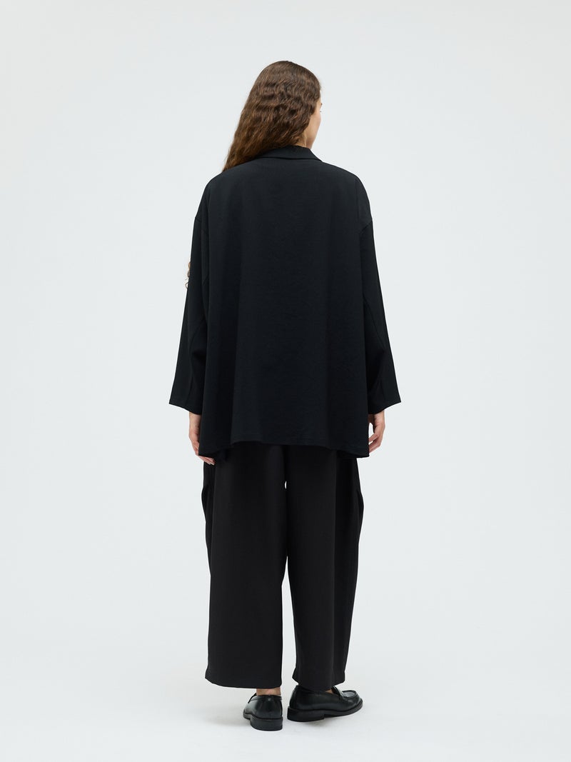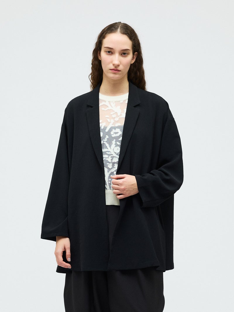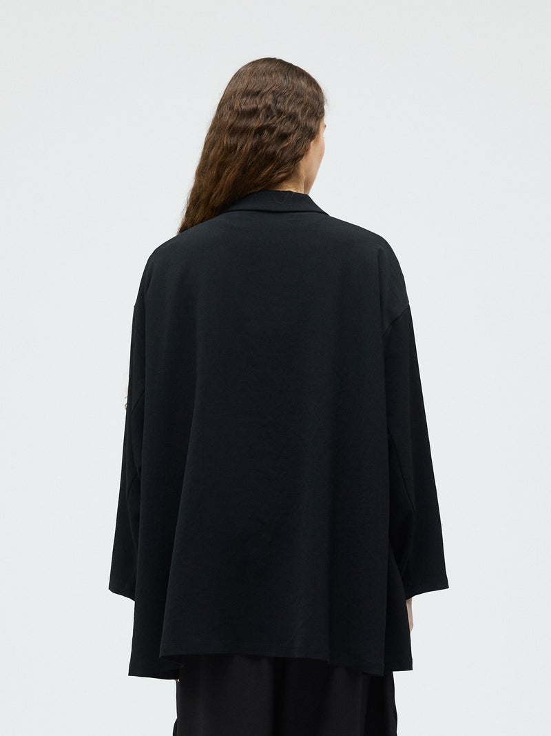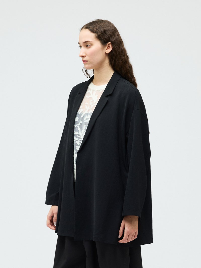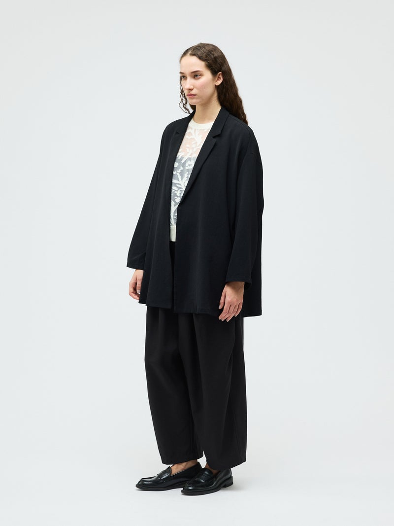 mizuiro ind定番のデザインで、ドライツイルワッシャー素材で仕上げたテーラードシャツジャケットが再入荷しました。早い段階から人気があり、濃いカラーを中心にオケージョンアイテムとして、普段使いもでき活躍していただいています。さらっとした肌触りが特徴。ボタンはなくすっきりとしたヒップの隠れる少し長めのデザインを表現。上品に広がりのあるフレアラインが印象的でしなやかに動きのあるシルエットを演出します。