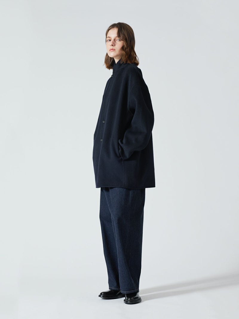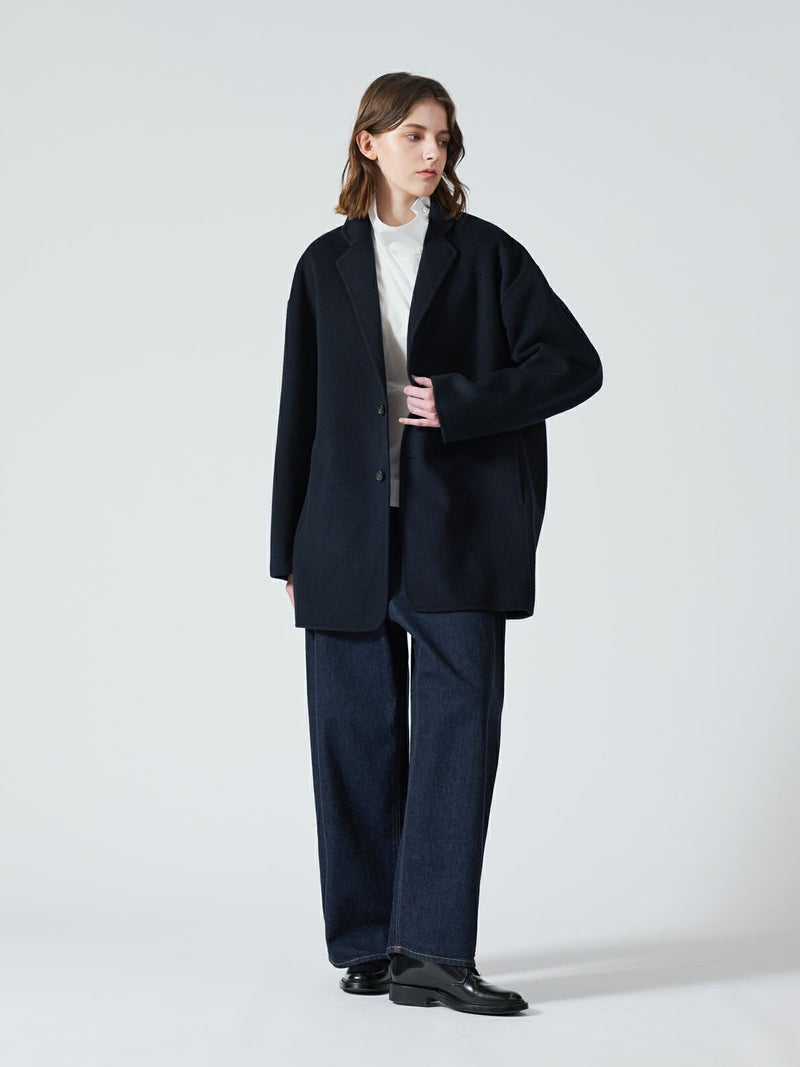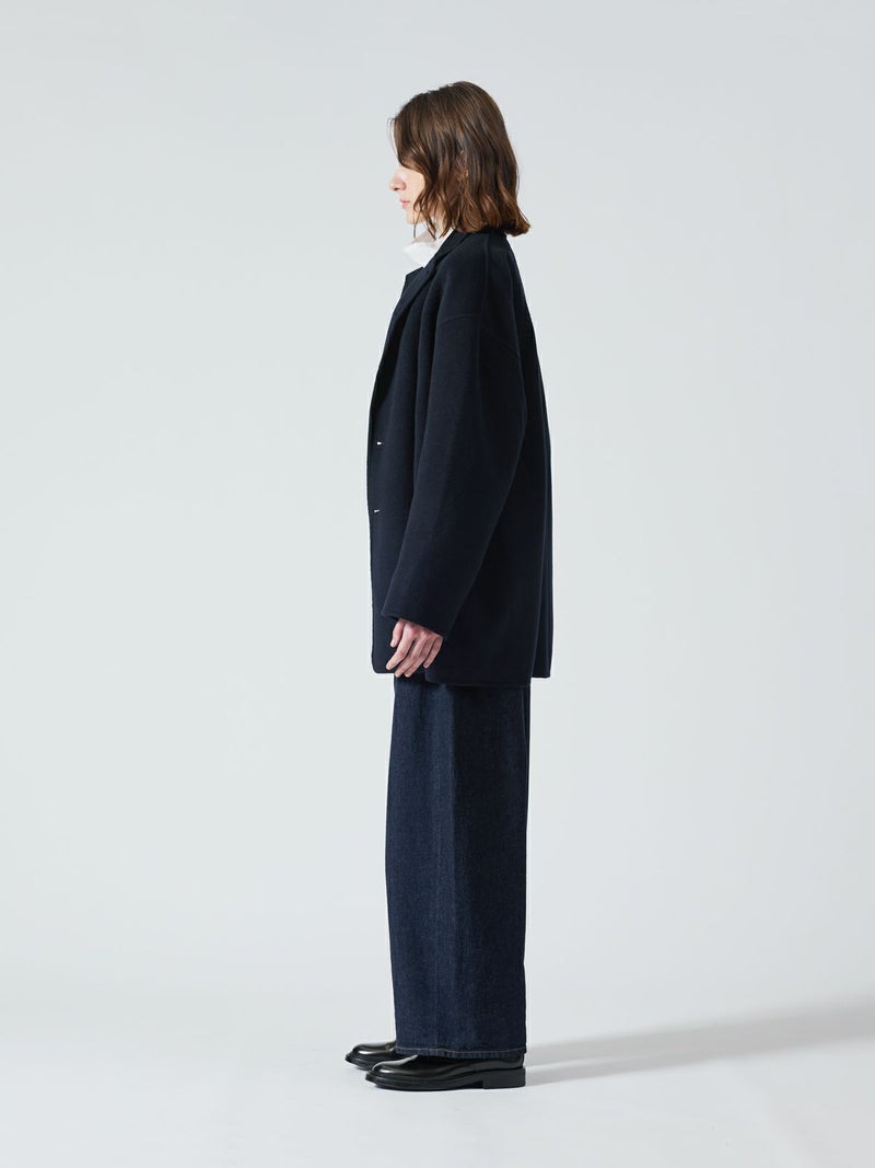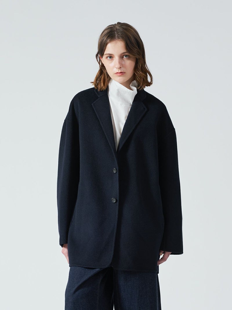 リバーフェイス素材を使用したウールテーラードジャケットです。mizuiro ind人気のアウターで、一枚仕立てでも軽さと保温性の高さが魅力。ビッグサイズでメンズライクに仕上げたサイズ感で、ヒップをしっかりと隠れるほどの丈やストレートのかっこいいシルエットを表現。深めのテーラードなのでフロントをオープンにしても素敵です。中にも着こみやすいサイズ感となっています。襟を立てても素敵で寒さ対策としてもお勧め。ネイビーとブラックの2色に絞ったトラッドなアウターで長く愛用していただける1枚です。