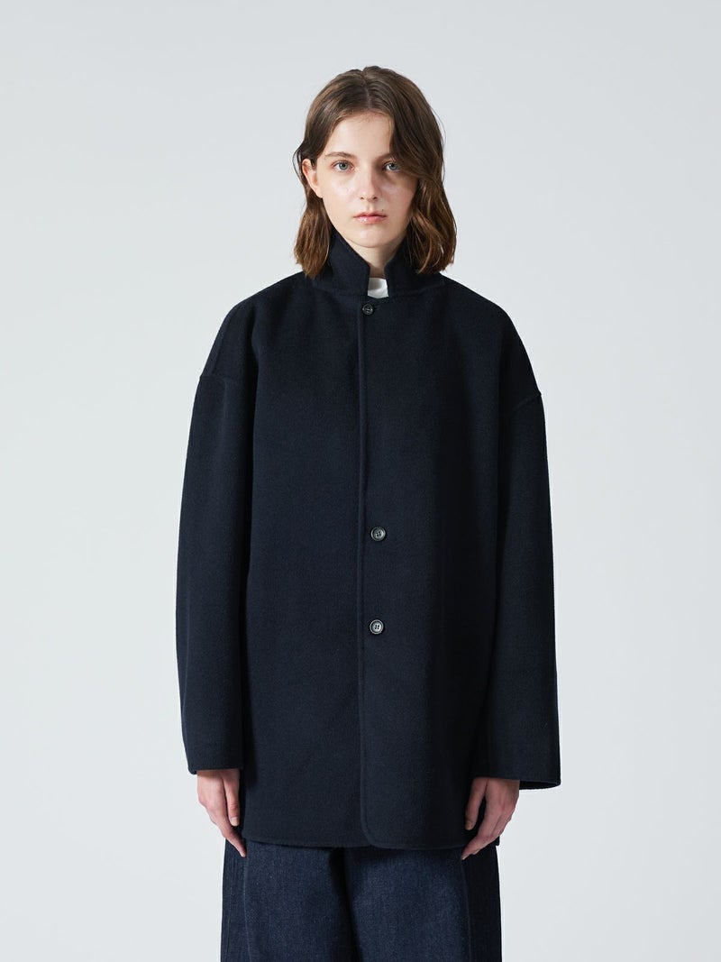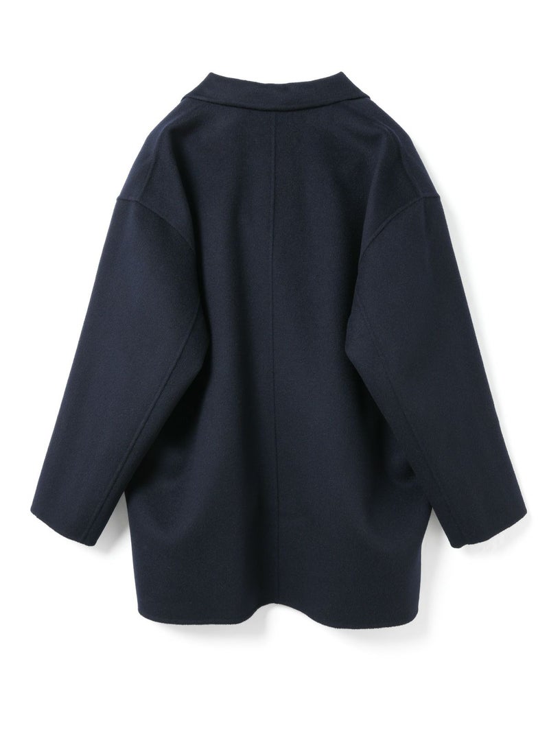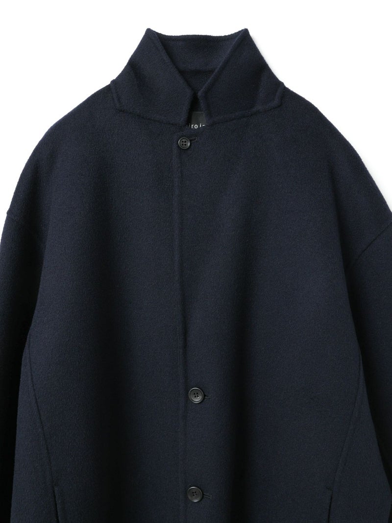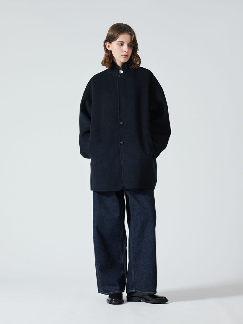 リバーフェイス素材を使用したウールテーラードジャケットです。mizuiro ind人気のアウターで、一枚仕立てでも軽さと保温性の高さが魅力。ビッグサイズでメンズライクに仕上げたサイズ感で、ヒップをしっかりと隠れるほどの丈やストレートのかっこいいシルエットを表現。深めのテーラードなのでフロントをオープンにしても素敵です。中にも着こみやすいサイズ感となっています。襟を立てても素敵で寒さ対策としてもお勧め。ネイビーとブラックの2色に絞ったトラッドなアウターで長く愛用していただける1枚です。