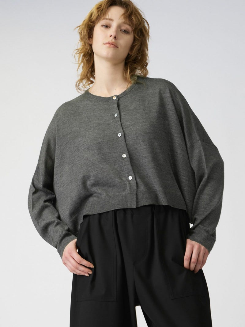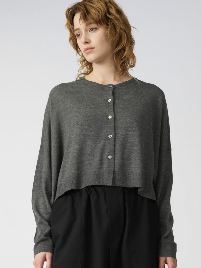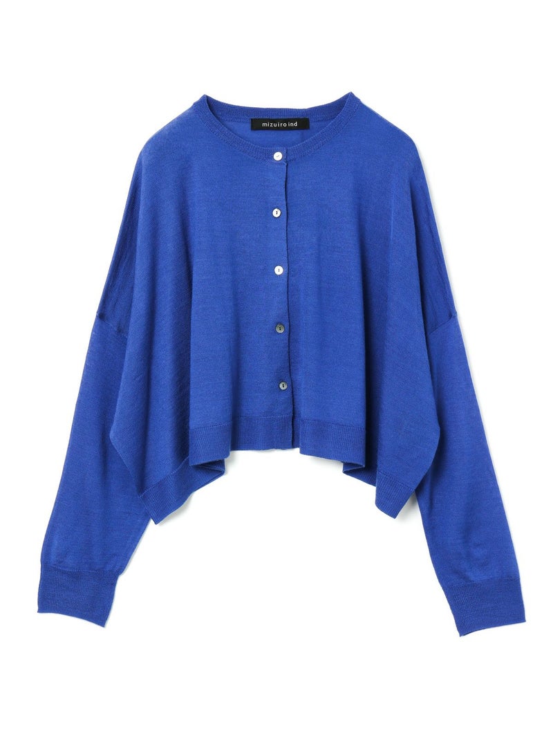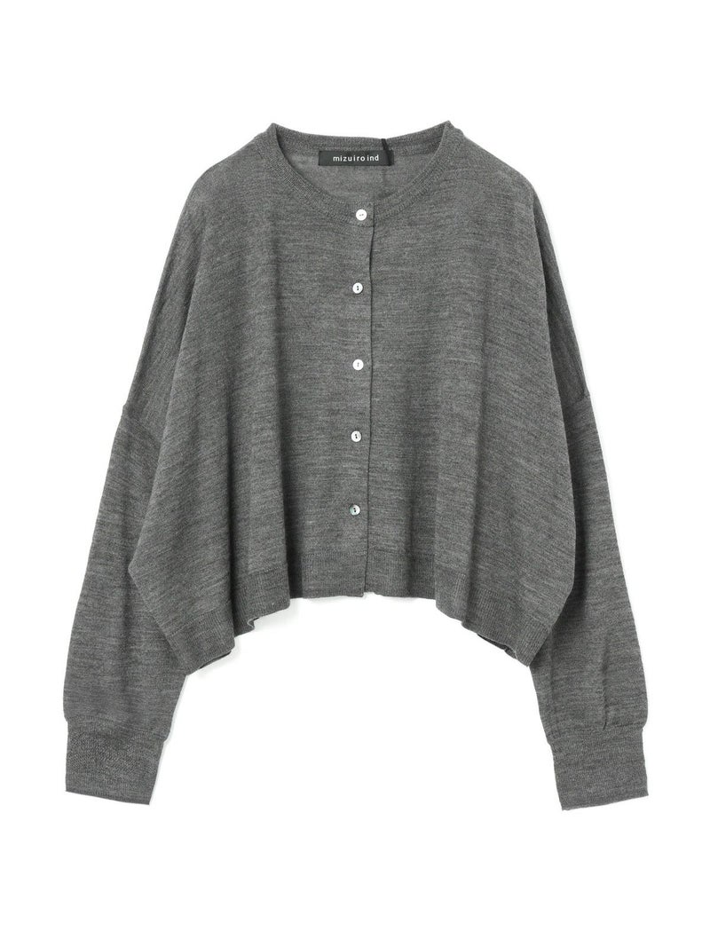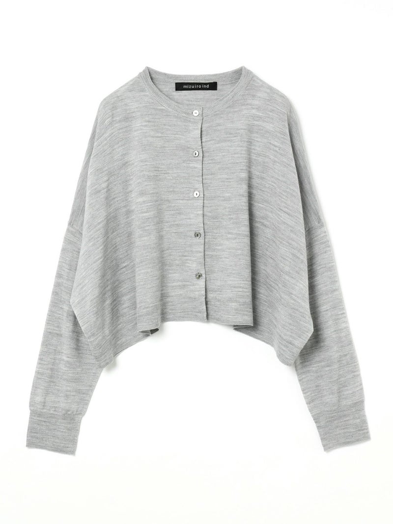 クルーネックのベーシックショートカーディガンの紹介です。幅広の身幅をデザインしたことでサイドに落ち感と動きのあるシルエットを表現しました。ヒップ上のスッキリとした丈感はレイヤードにもお勧め。キレイな色目を使用したシンプルな1枚です。ウール混なので薄手ですが暖かく、気温の変化にも対応していただきやすい羽織アイテムとなっています。シンプルな中にこだわりを感じ取っていただけるカーディガンです。
