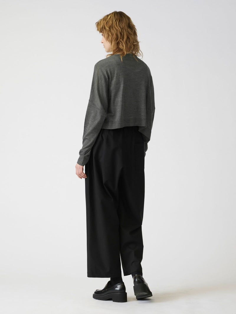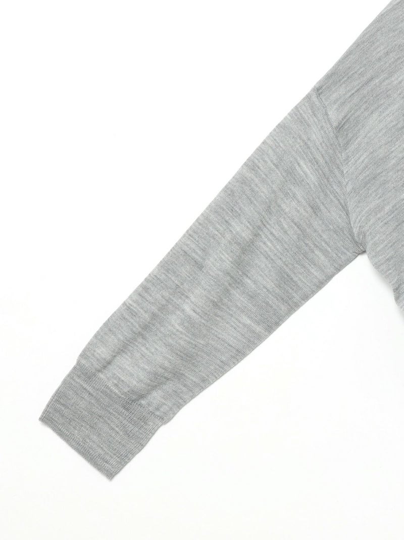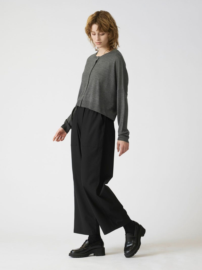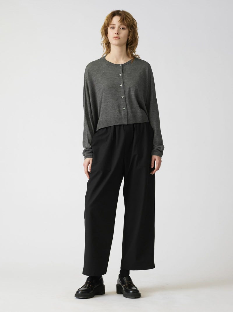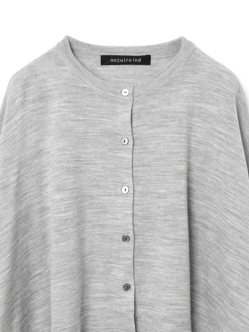クルーネックのベーシックショートカーディガンの紹介です。幅広の身幅をデザインしたことでサイドに落ち感と動きのあるシルエットを表現しました。ヒップ上のスッキリとした丈感はレイヤードにもお勧め。キレイな色目を使用したシンプルな1枚です。ウール混なので薄手ですが暖かく、気温の変化にも対応していただきやすい羽織アイテムとなっています。シンプルな中にこだわりを感じ取っていただけるカーディガンです。