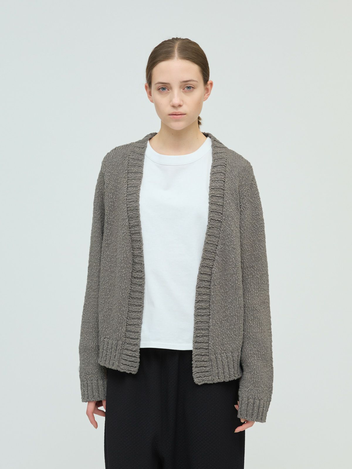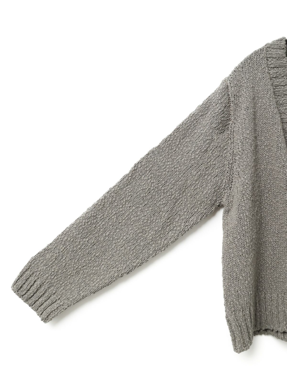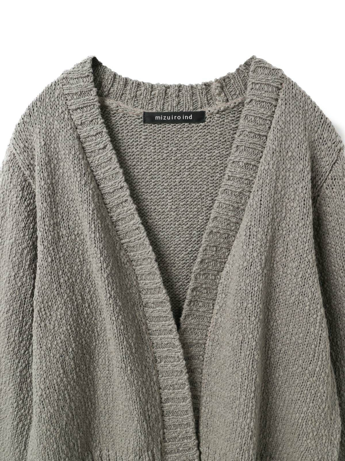 肉厚でスラブ感のあるリリーヤーンVネックカーディガンです。パイル調のスラブ糸の凸凹とした生地感が特徴。ショートでワイドなサイズ感を提案。フロントボタンをなくしサラッと羽織っていただけるカーディガンを表現しました。落ち着きのある優しい色合いも大人の魅力を引き出しています。秋冬のニットシリーズとして同じスラブニットを使用した3-220118/リリーヤーンベストも展開。