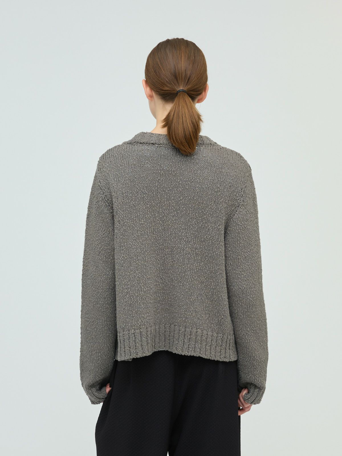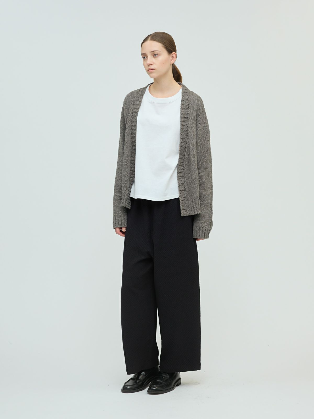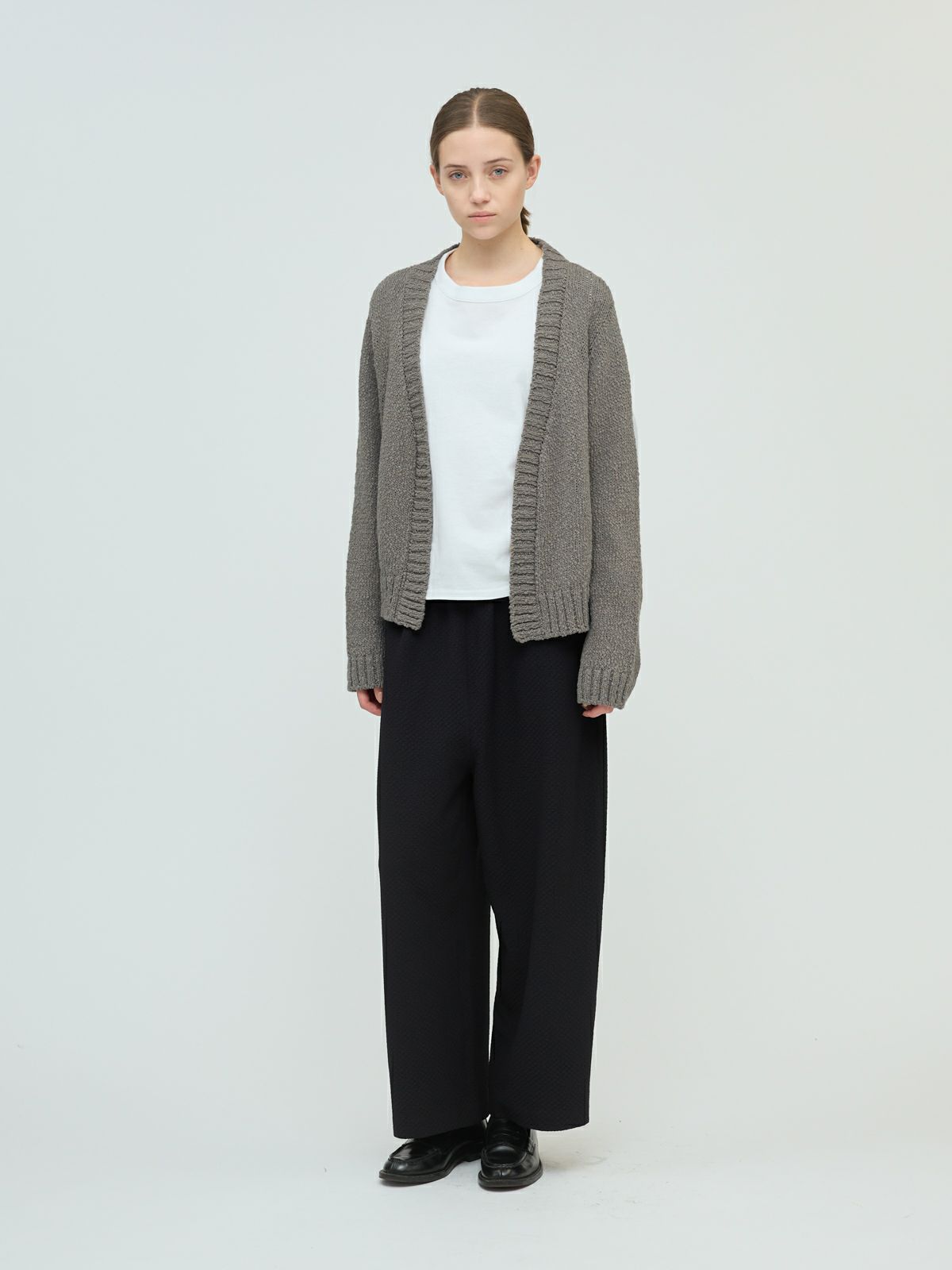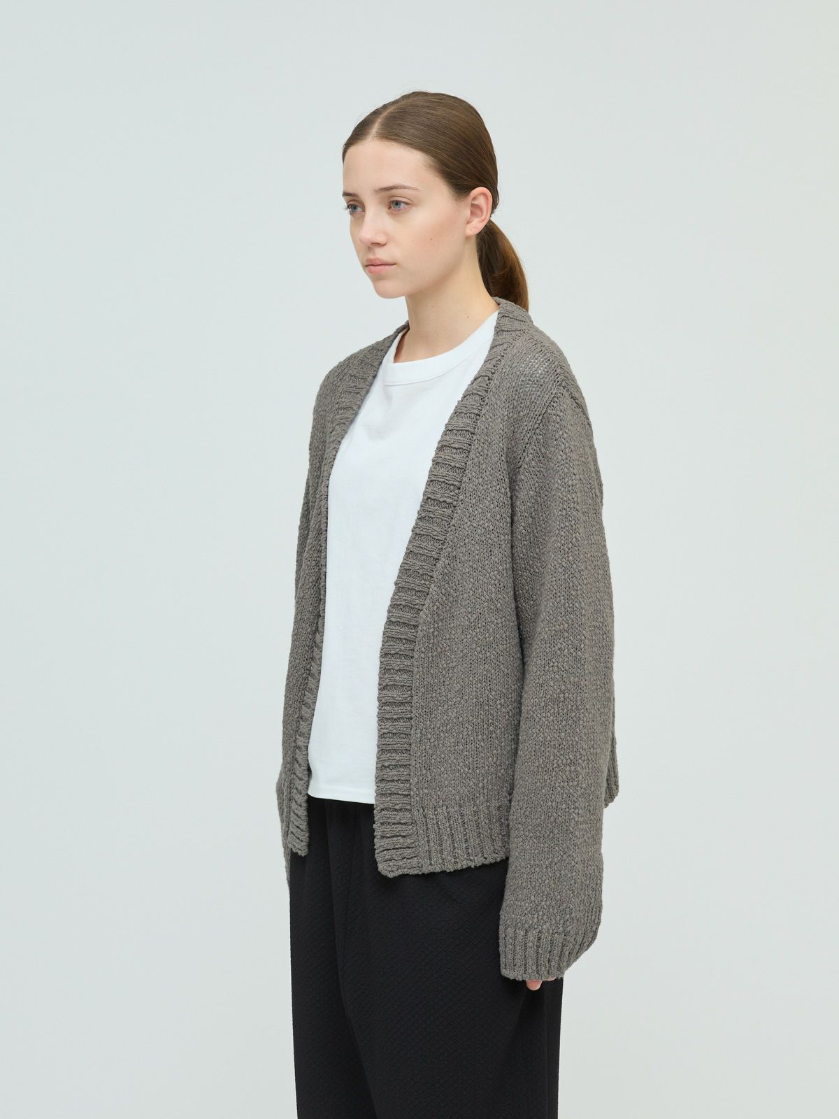 肉厚でスラブ感のあるリリーヤーンVネックカーディガンです。パイル調のスラブ糸の凸凹とした生地感が特徴。ショートでワイドなサイズ感を提案。フロントボタンをなくしサラッと羽織っていただけるカーディガンを表現しました。落ち着きのある優しい色合いも大人の魅力を引き出しています。秋冬のニットシリーズとして同じスラブニットを使用した3-220118/リリーヤーンベストも展開。