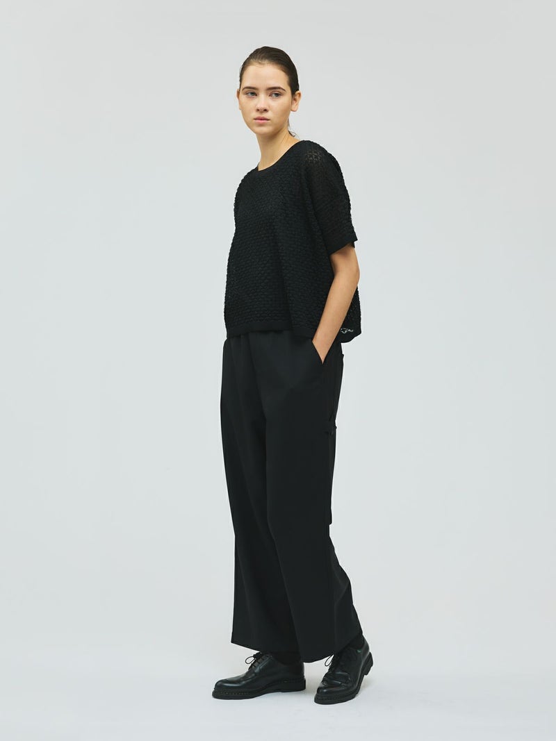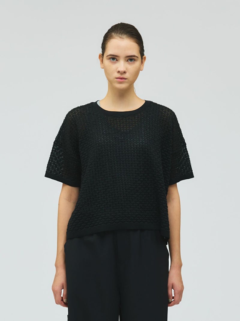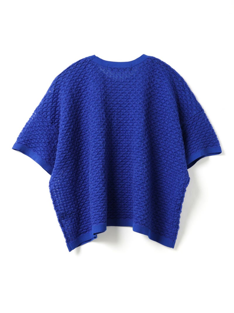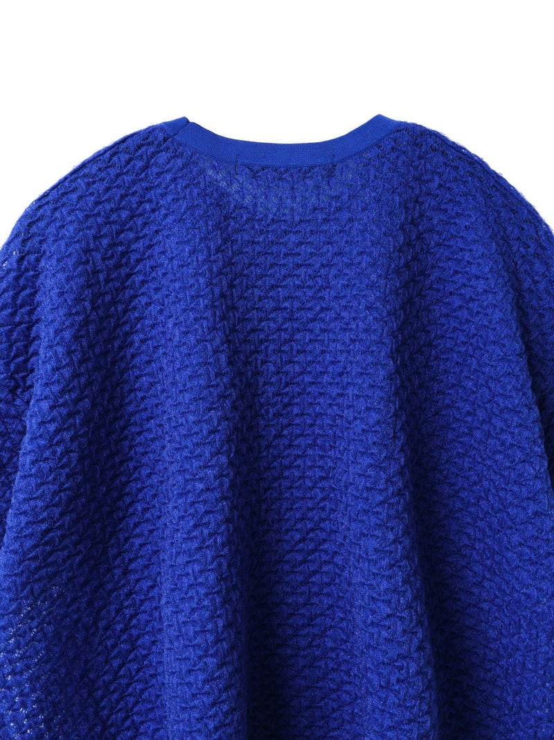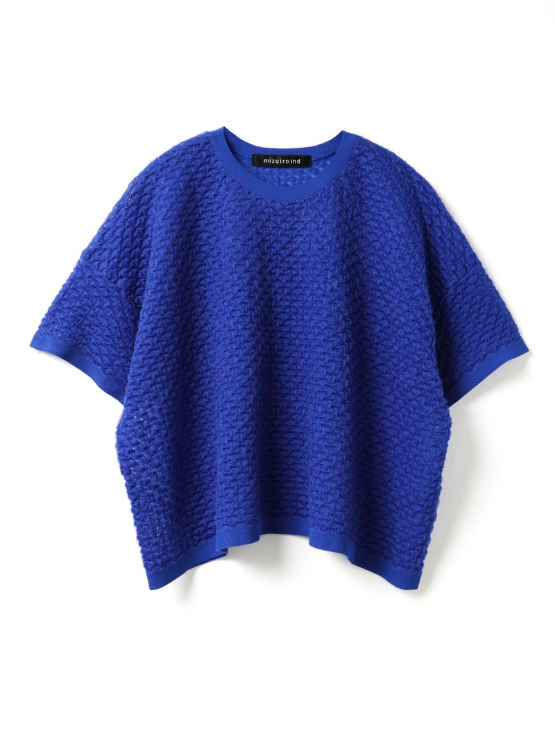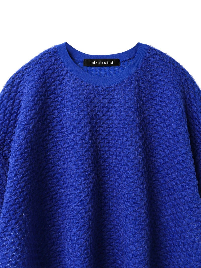 柄編みのハイゲージニットで仕上げたパターンシアーワイドプルオーバーです。合繊のニット生地は表面に立体感がりチュールのような生地感が特徴的。ヒップ上のすっきりとした丈感です。ワイドなシルエットなのでサイドに動きのあるシルエットを表現。ボリュームのあるボトムスとバランスよくコーディネートができます。同シリーズ1-220057/パターンシアーベストも展開。