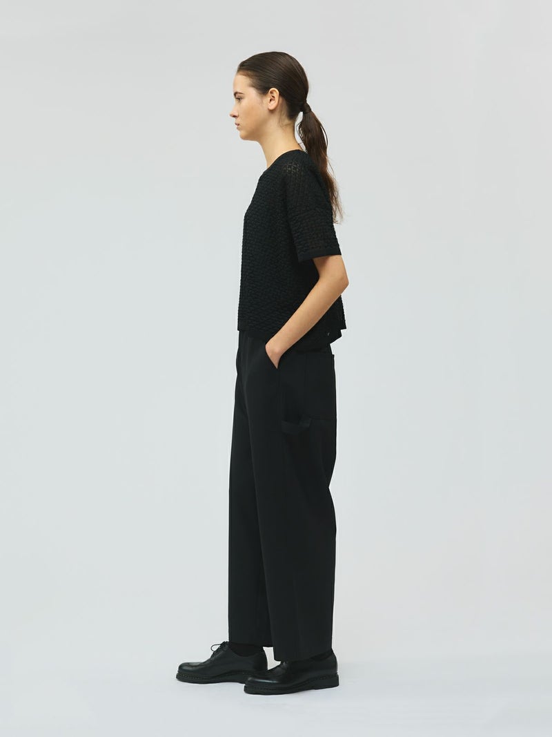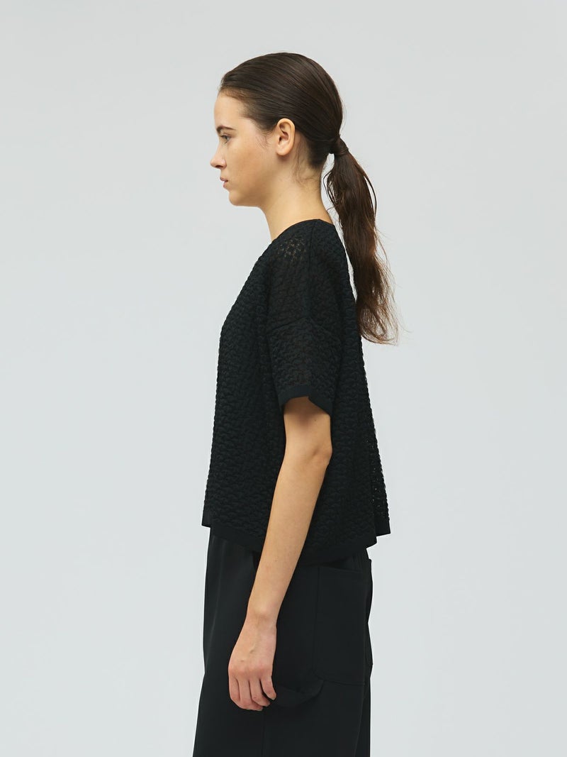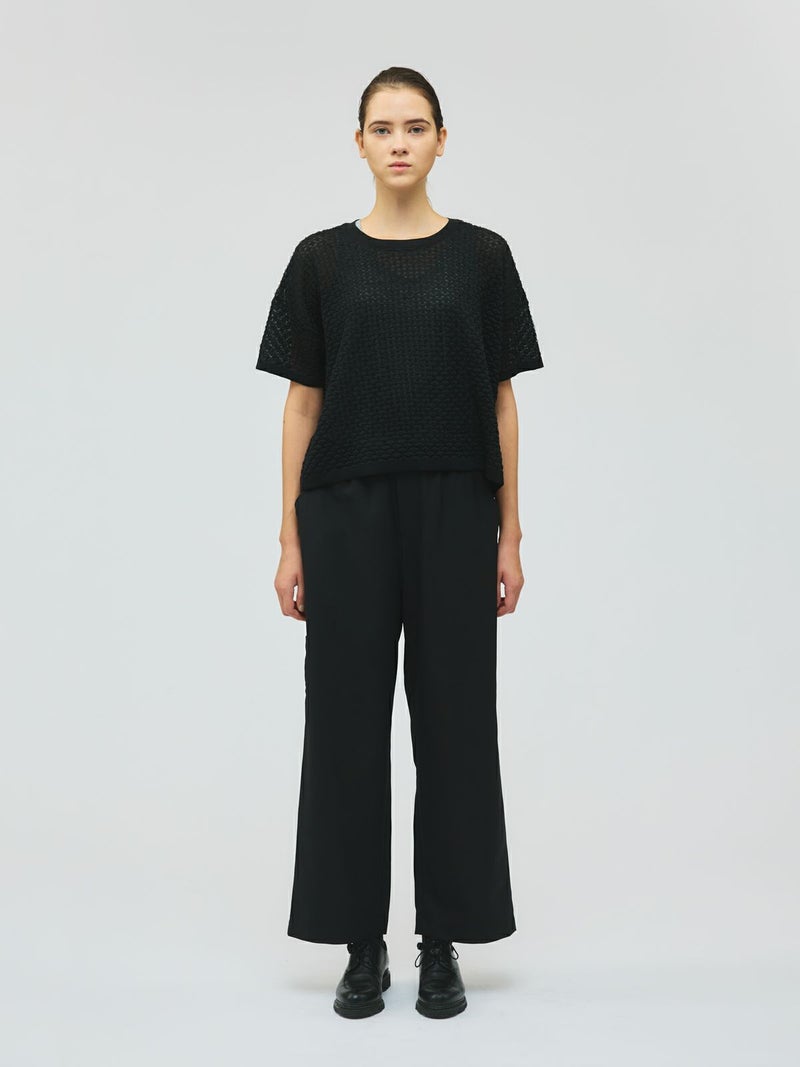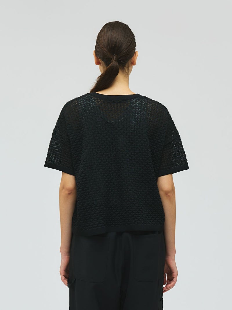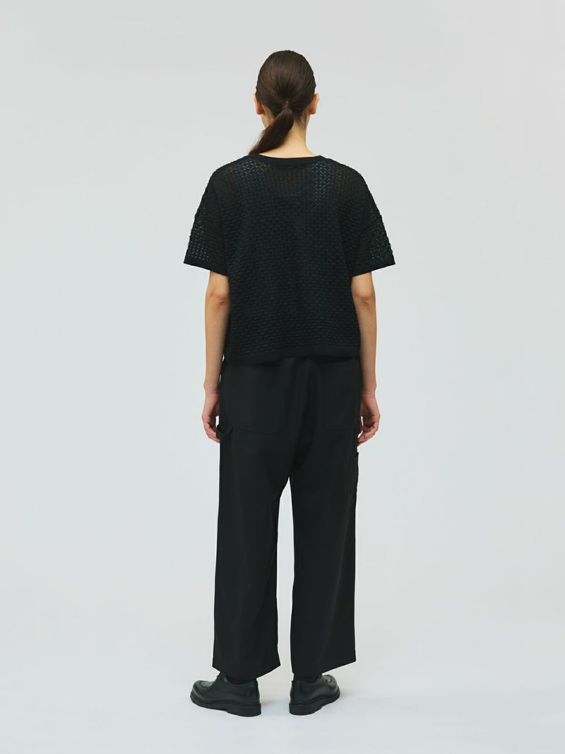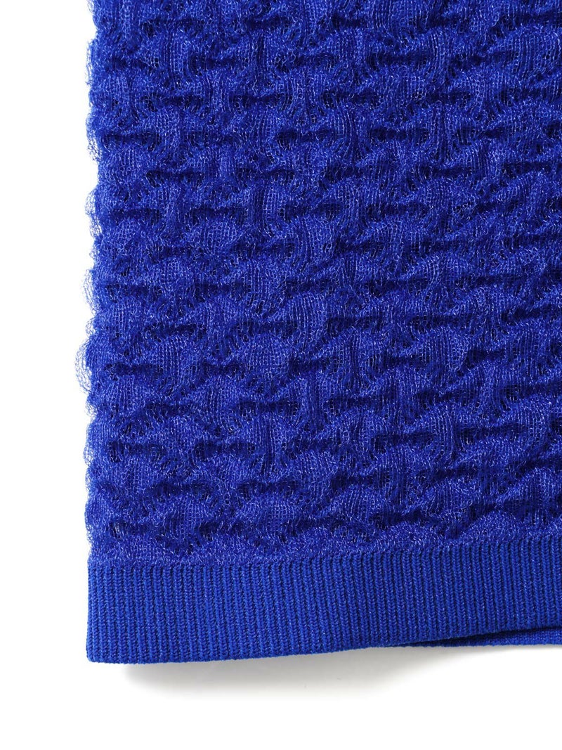 柄編みのハイゲージニットで仕上げたパターンシアーワイドプルオーバーです。合繊のニット生地は表面に立体感がりチュールのような生地感が特徴的。ヒップ上のすっきりとした丈感です。ワイドなシルエットなのでサイドに動きのあるシルエットを表現。ボリュームのあるボトムスとバランスよくコーディネートができます。同シリーズ1-220057/パターンシアーベストも展開。