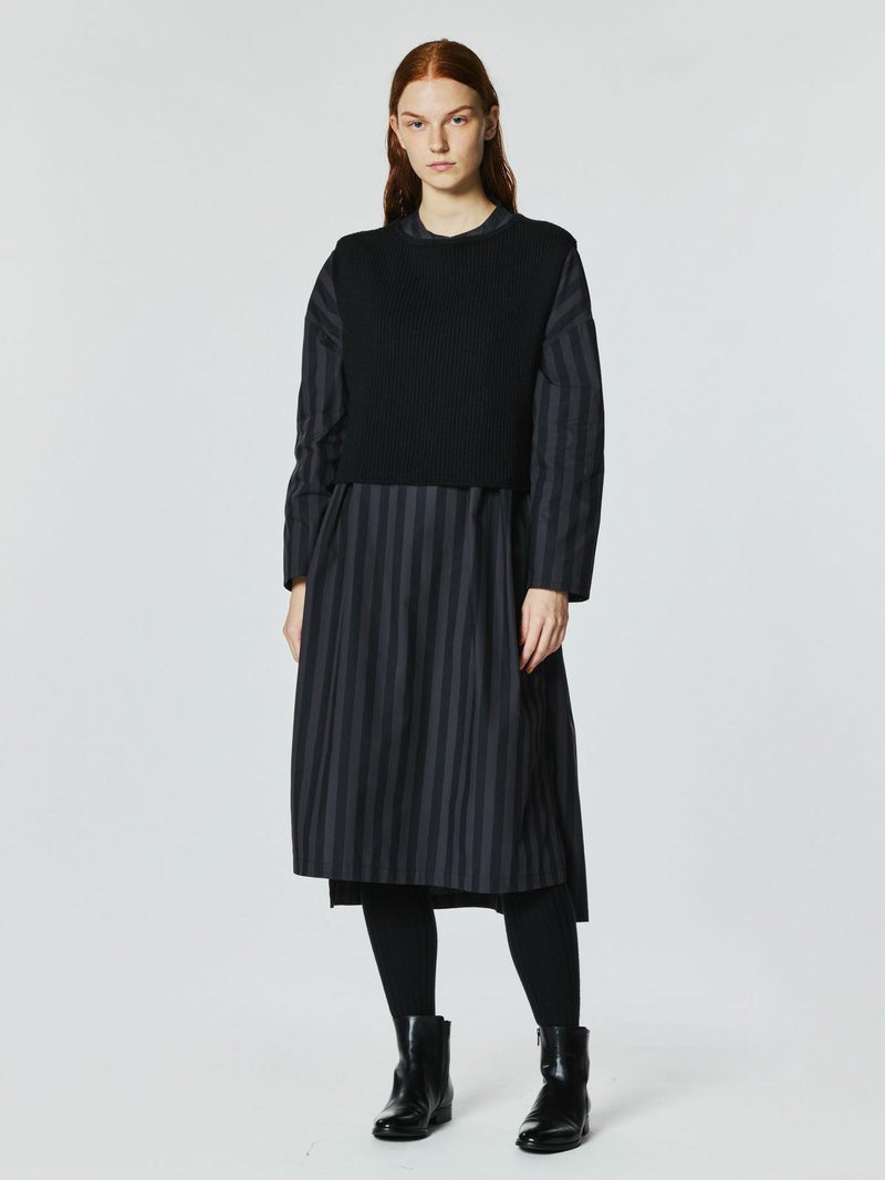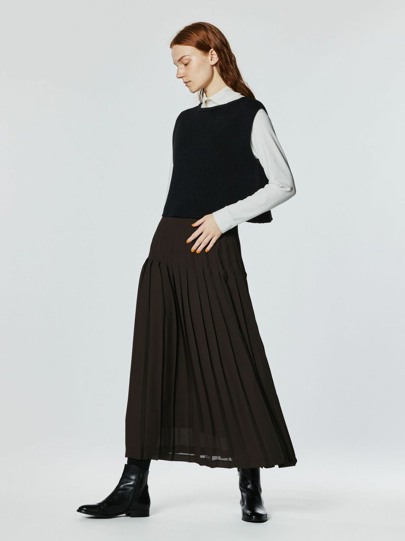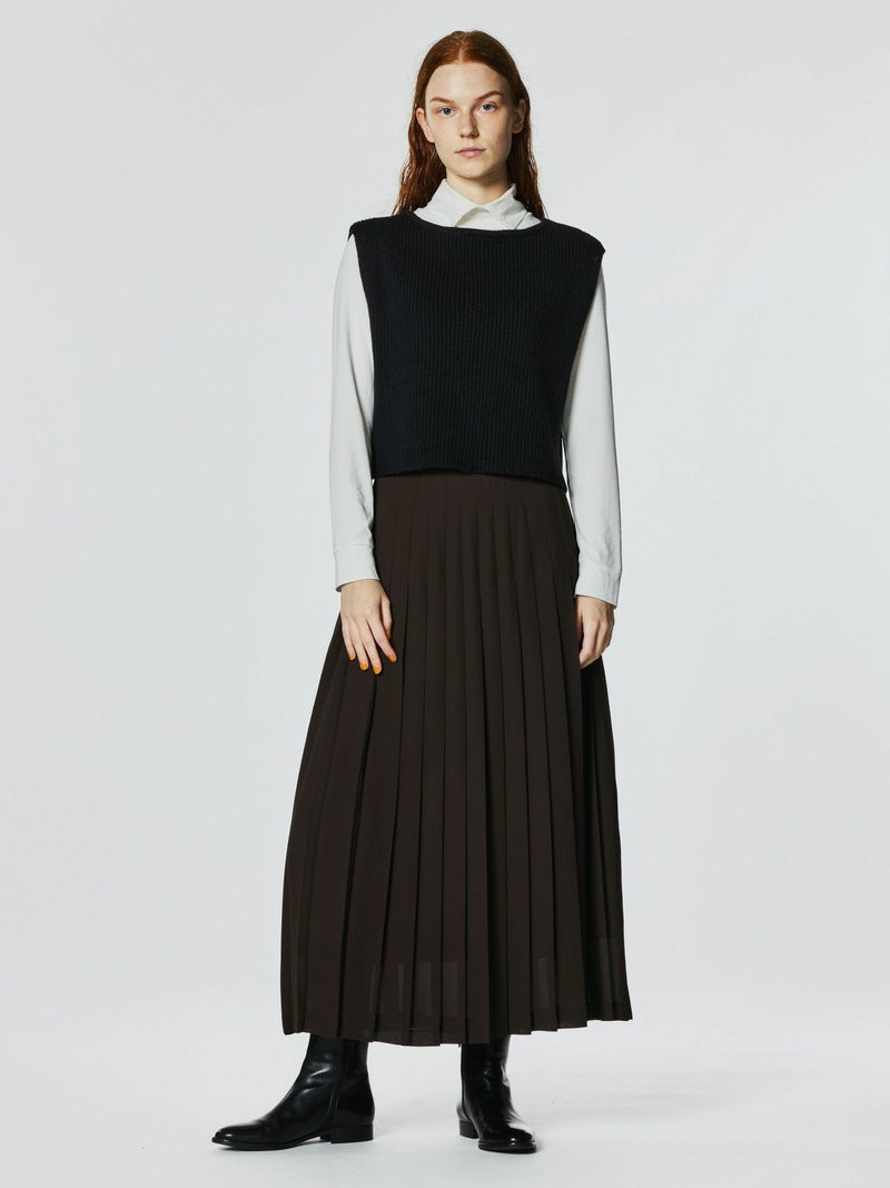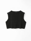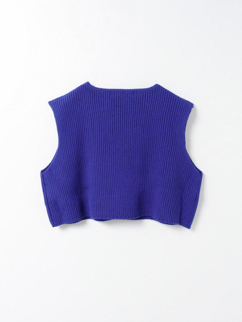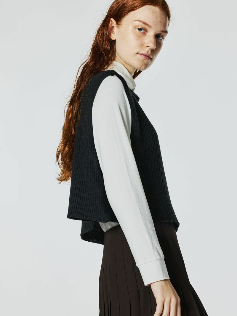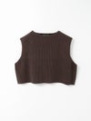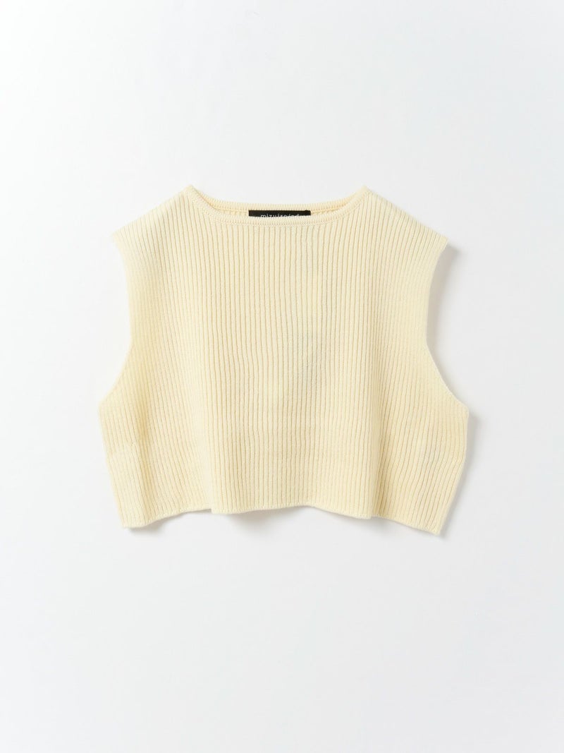 リブ編みの清楚なボートネックショートベストです。コンパクトなサイズ感が特長でレイヤードアイテムとしてお勧めの1枚。肩に優しく馴染むボートネックのシルエットが女性らしく着こなせるデザインに仕上がっています。アームは袖を通しやすいゆとりのある袖口を表現。ワンピースやシャツ等フレアの効いたシルエットとの相性も良く、上品にレイヤードができるベストです。