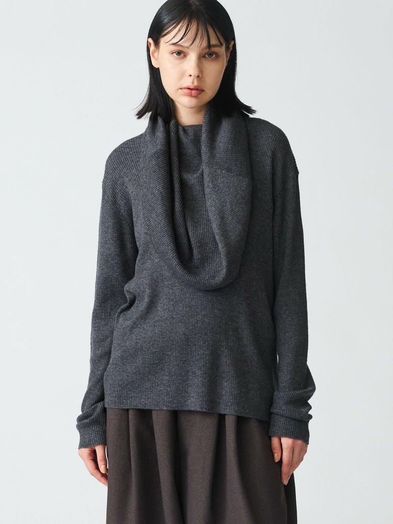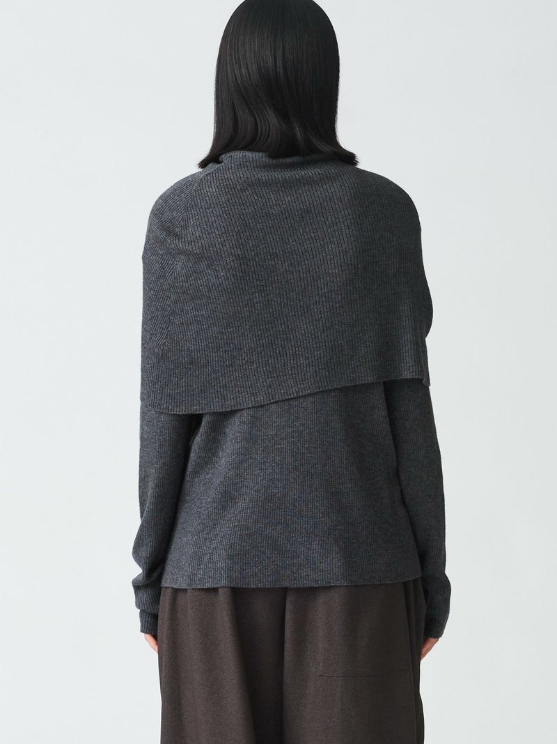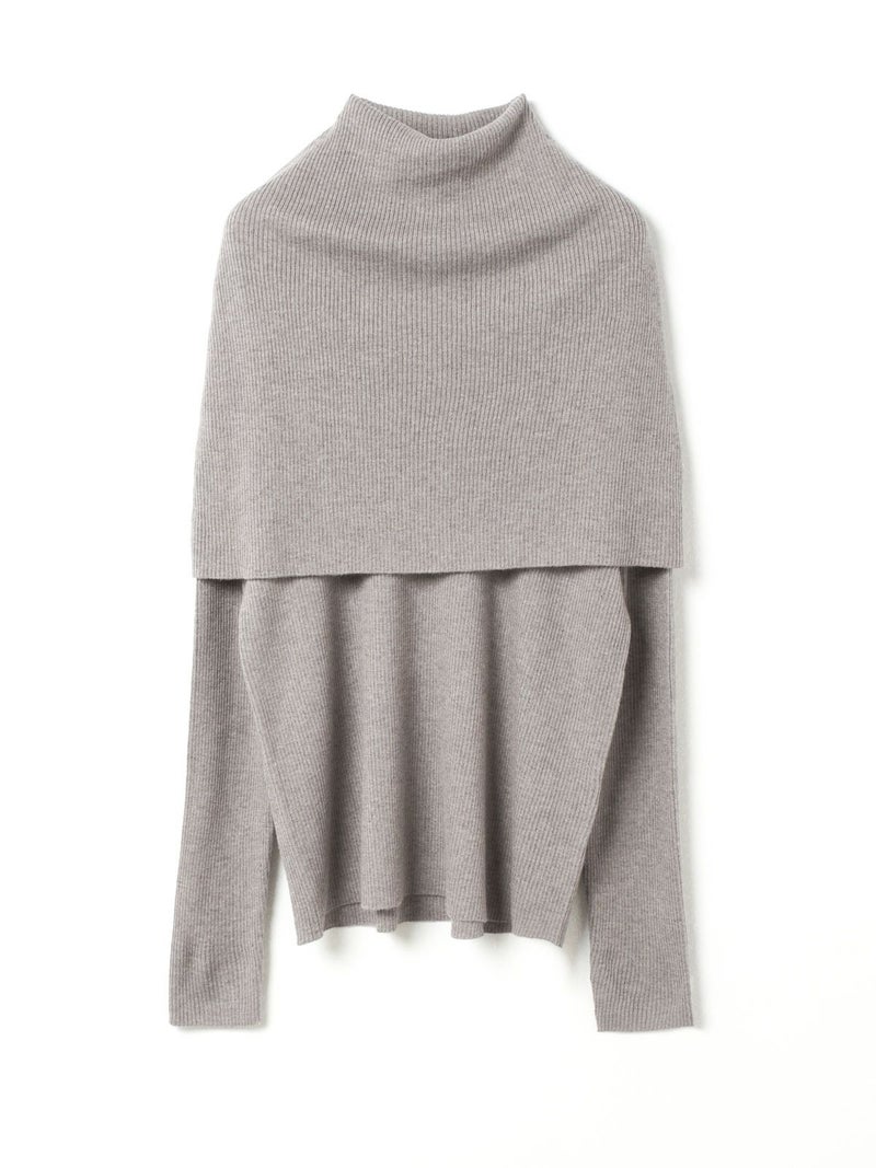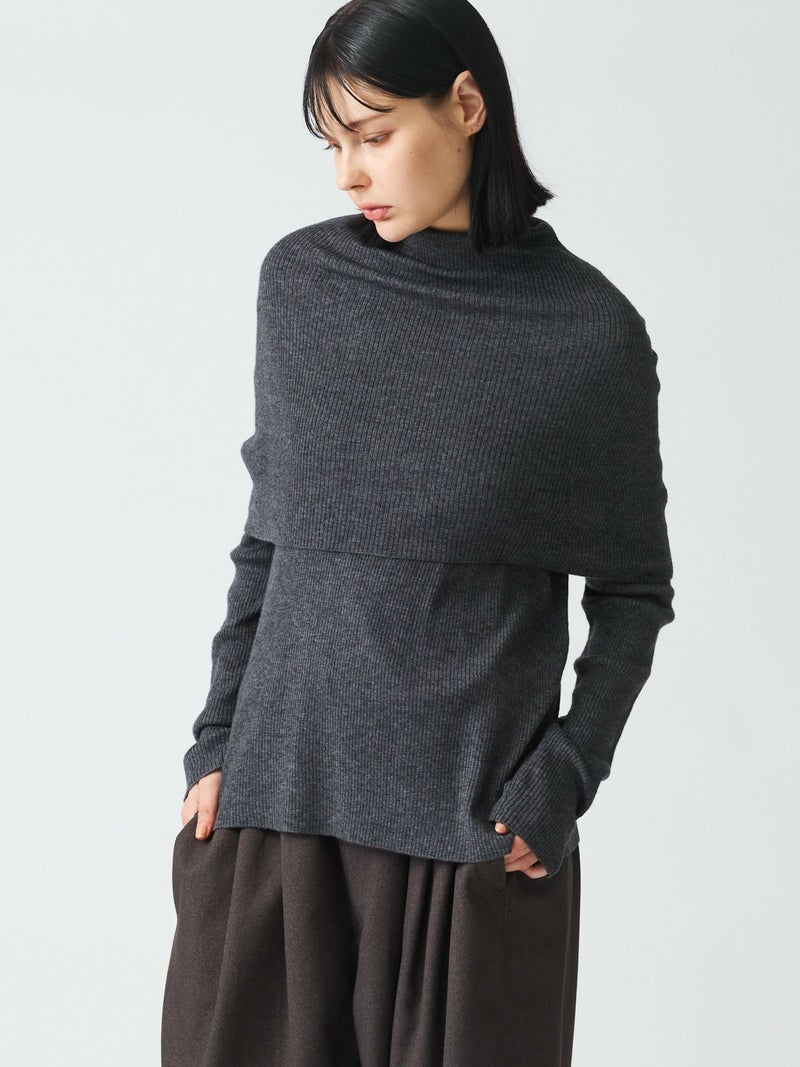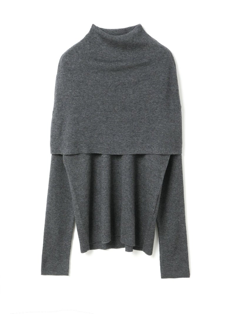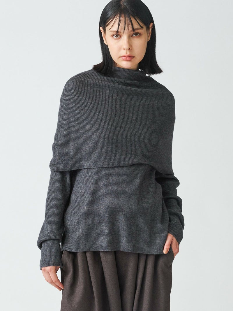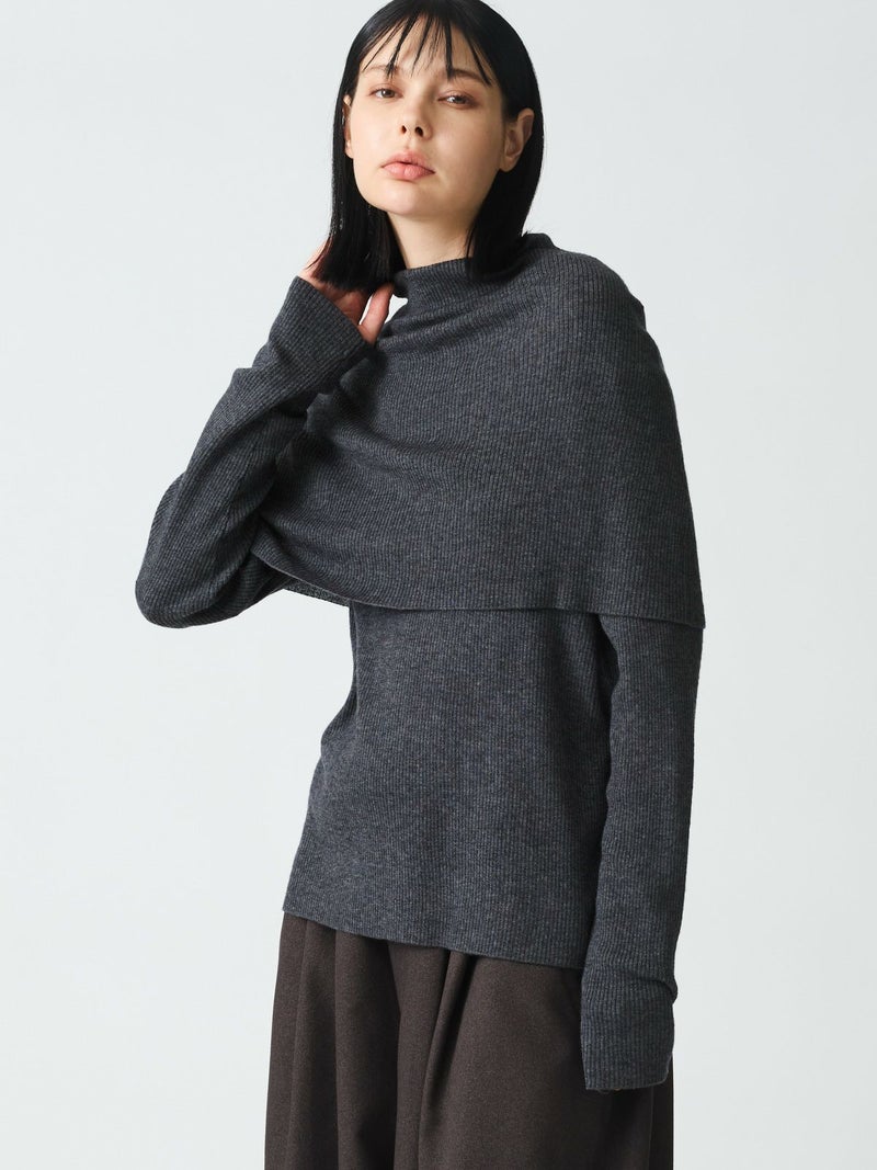 mizuiro indのNEWアイテム、ケープカラーリブプルオーバーです。肩から胸元に重なる温かなデザインが特徴的。上品な雰囲気で新鮮なデザインニットとして今季お勧めの1枚です。ケープ部分を襟元に寄せてスカーフのような着こなしも可。インナー使いをしながら小物使いができる着回しアイテムです。コーディネートするアイテムによって自由自在にオシャレを楽しんでいただけます。手洗い可能。