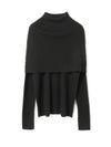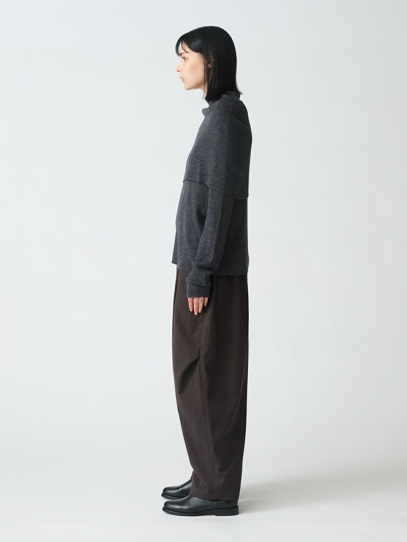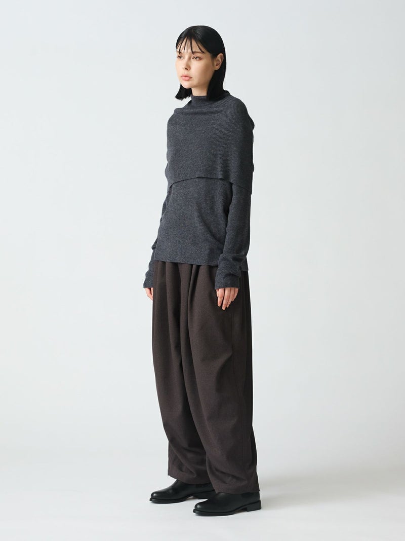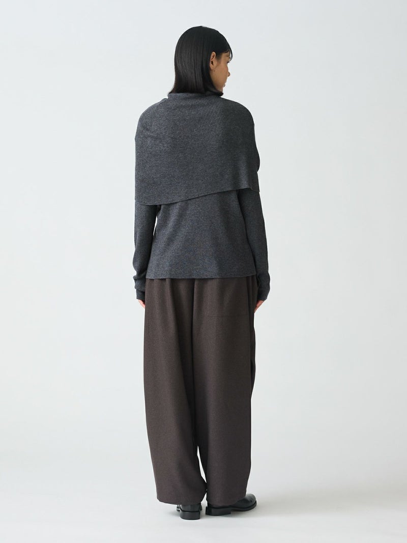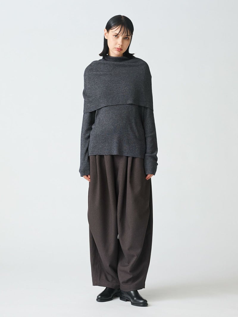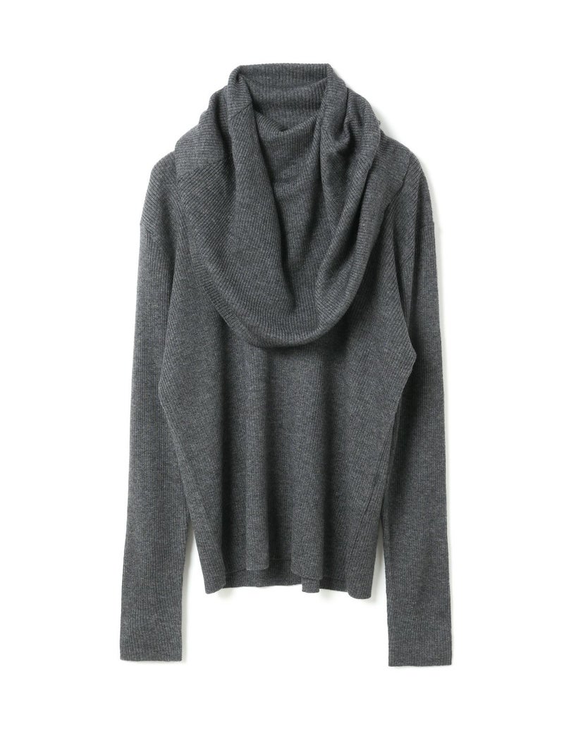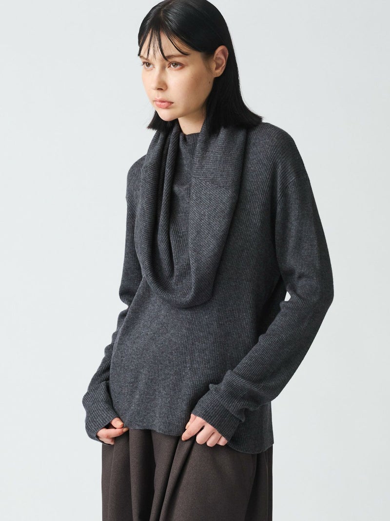 mizuiro indのNEWアイテム、ケープカラーリブプルオーバーです。肩から胸元に重なる温かなデザインが特徴的。上品な雰囲気で新鮮なデザインニットとして今季お勧めの1枚です。ケープ部分を襟元に寄せてスカーフのような着こなしも可。インナー使いをしながら小物使いができる着回しアイテムです。コーディネートするアイテムによって自由自在にオシャレを楽しんでいただけます。手洗い可能。