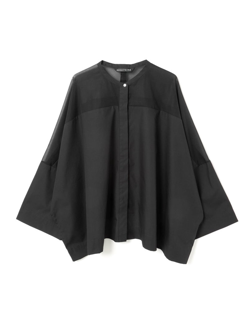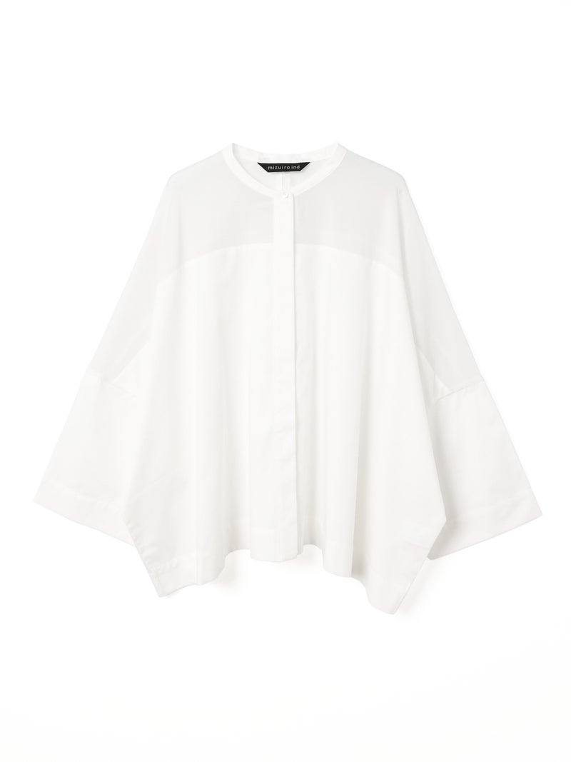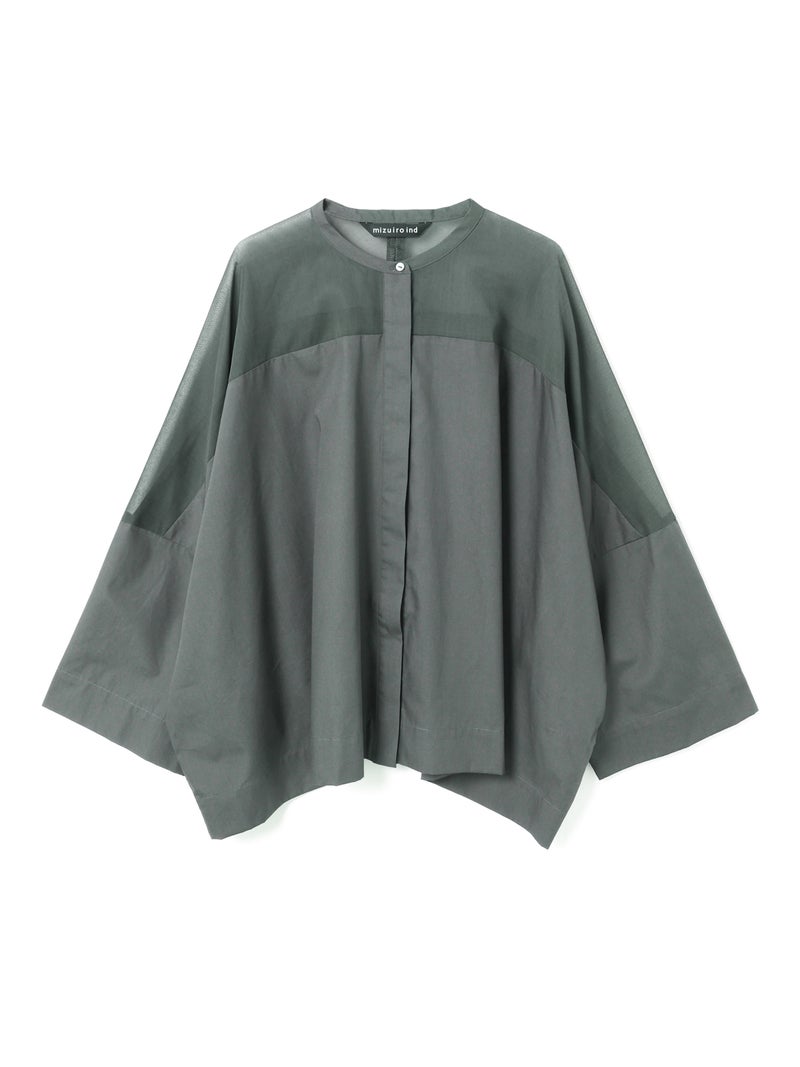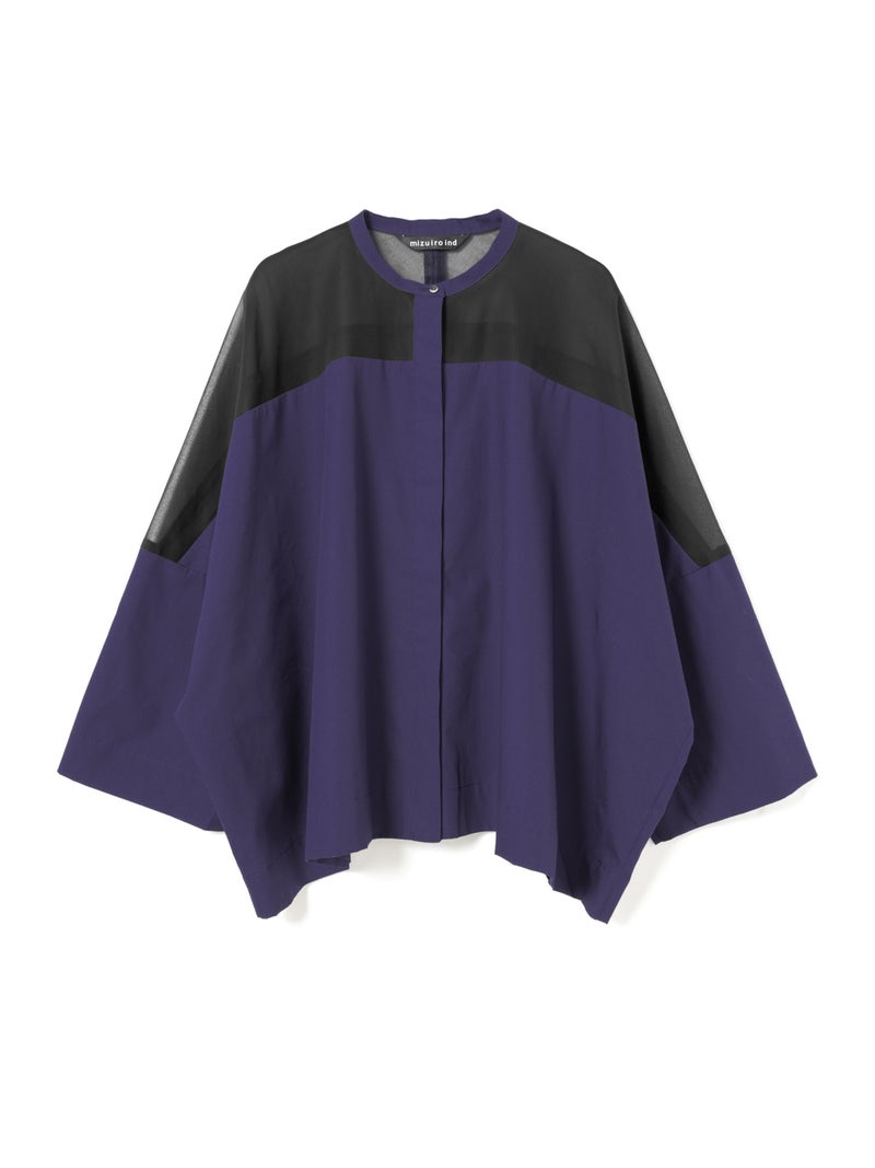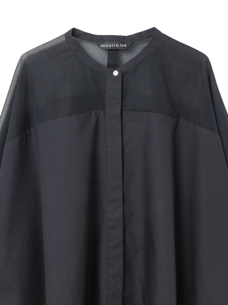 mizuiro ind定番アイテムでもあるシアーショルダースタンドカラーワイドシャツが新色を追加し再入荷しました。透け感を上品にミックスしたデザインが特徴的で、肩のヨーク部分をシアー素材で仕上げた魅力的な1枚。袖口や身幅にゆとりがあり、夏も涼しく着用していただけます。首元はすっきりとしたバランスの良いシルエットを表現しています。清楚でベーシックな雰囲気の4色のカラー展開に加え今季はパープルを追加しました。新鮮さも加わったおすすめの1枚です。2-250101/シアーショルダーワンピースも展開。