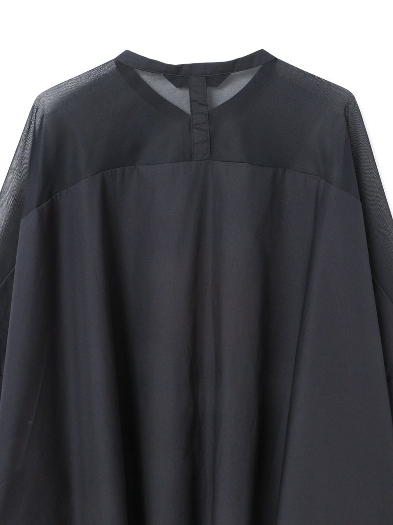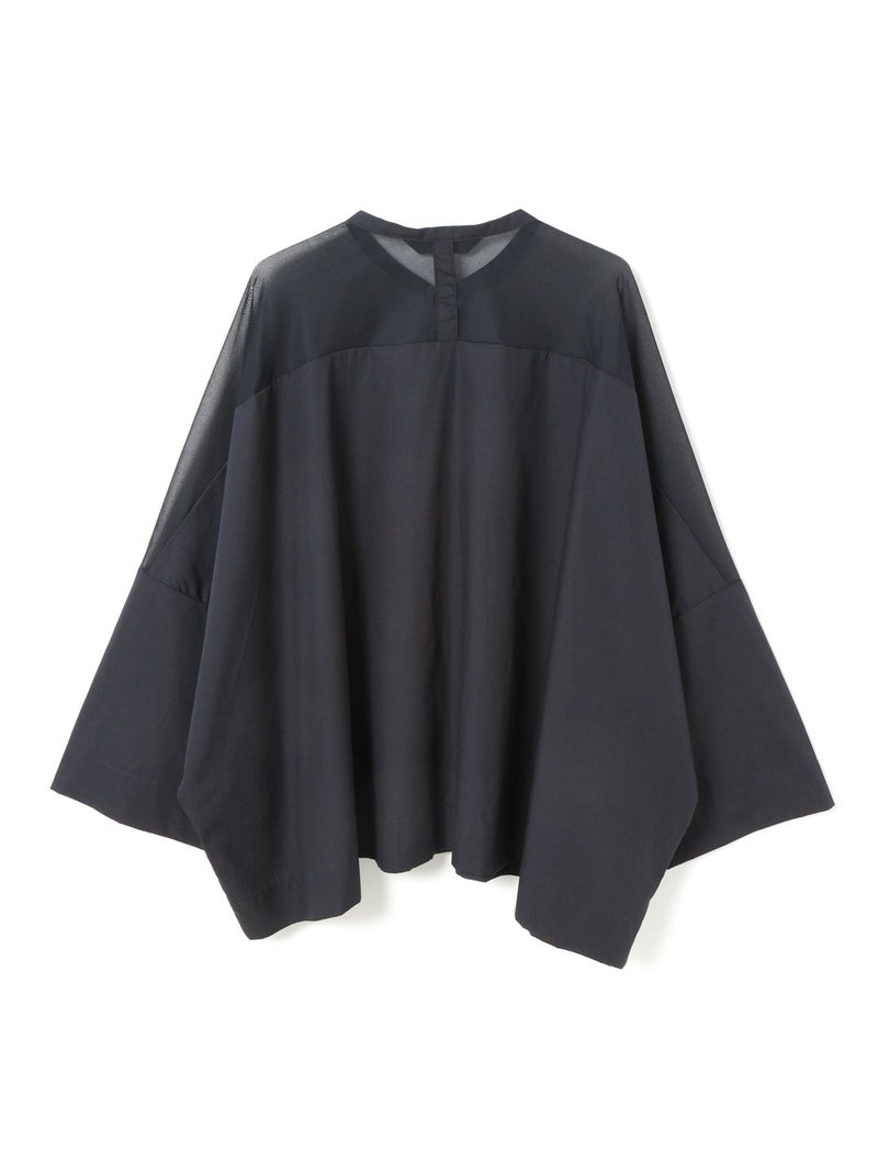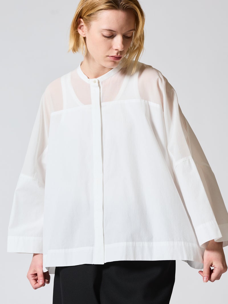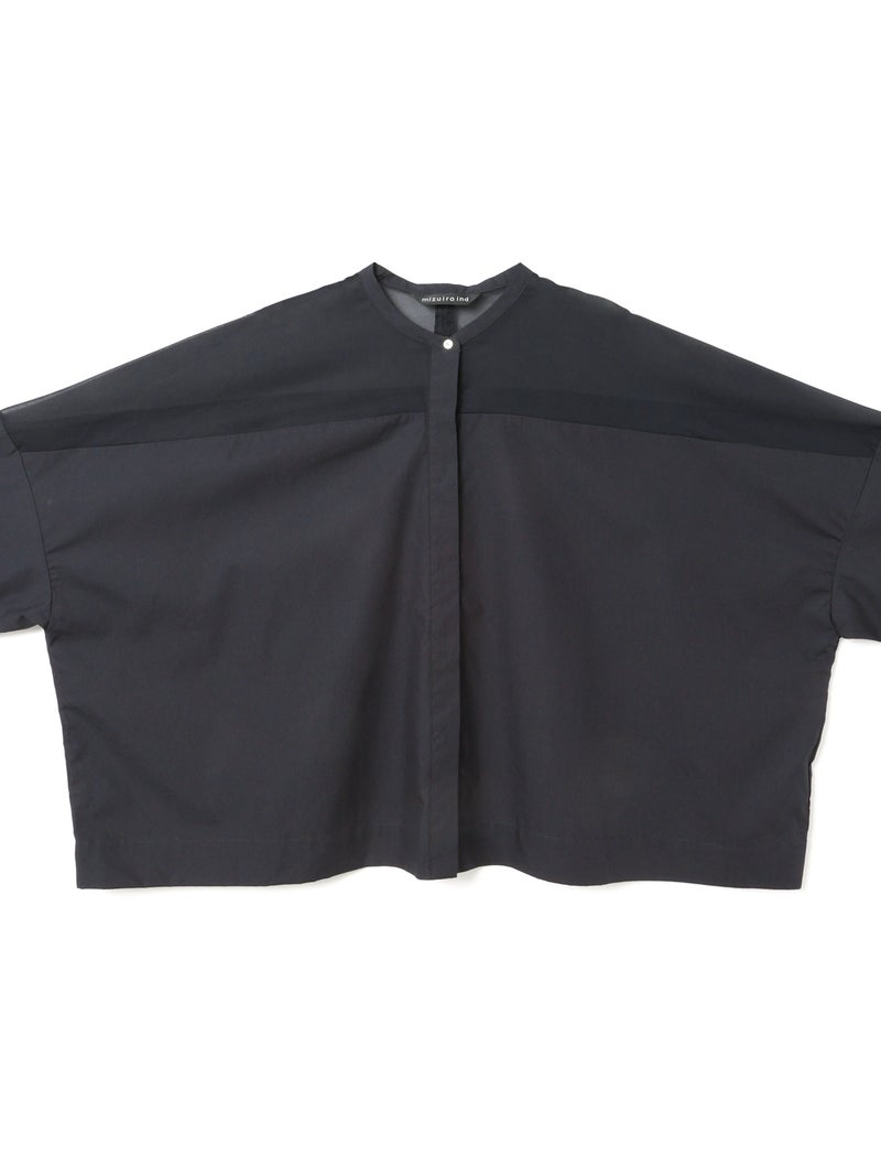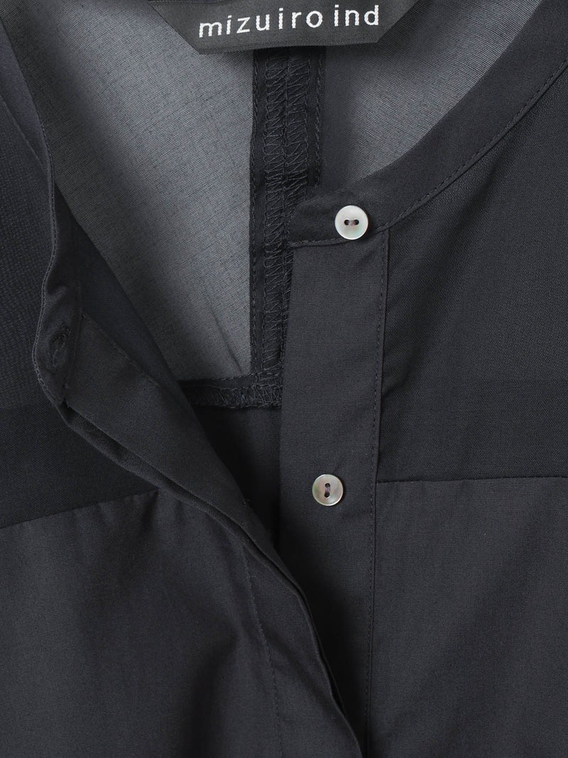 mizuiro ind定番アイテムでもあるシアーショルダースタンドカラーワイドシャツが新色を追加し再入荷しました。透け感を上品にミックスしたデザインが特徴的で、肩のヨーク部分をシアー素材で仕上げた魅力的な1枚。袖口や身幅にゆとりがあり、夏も涼しく着用していただけます。首元はすっきりとしたバランスの良いシルエットを表現しています。清楚でベーシックな雰囲気の4色のカラー展開に加え今季はパープルを追加しました。新鮮さも加わったおすすめの1枚です。2-250101/シアーショルダーワンピースも展開。