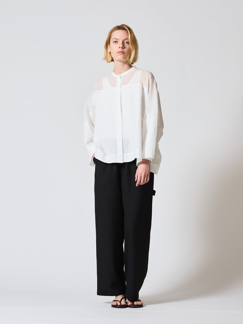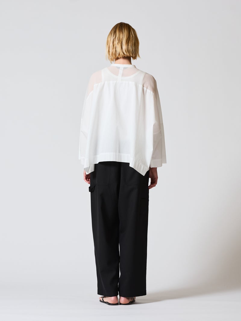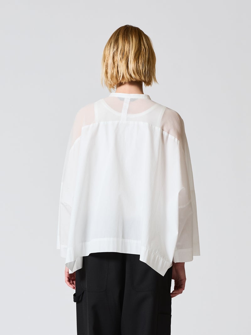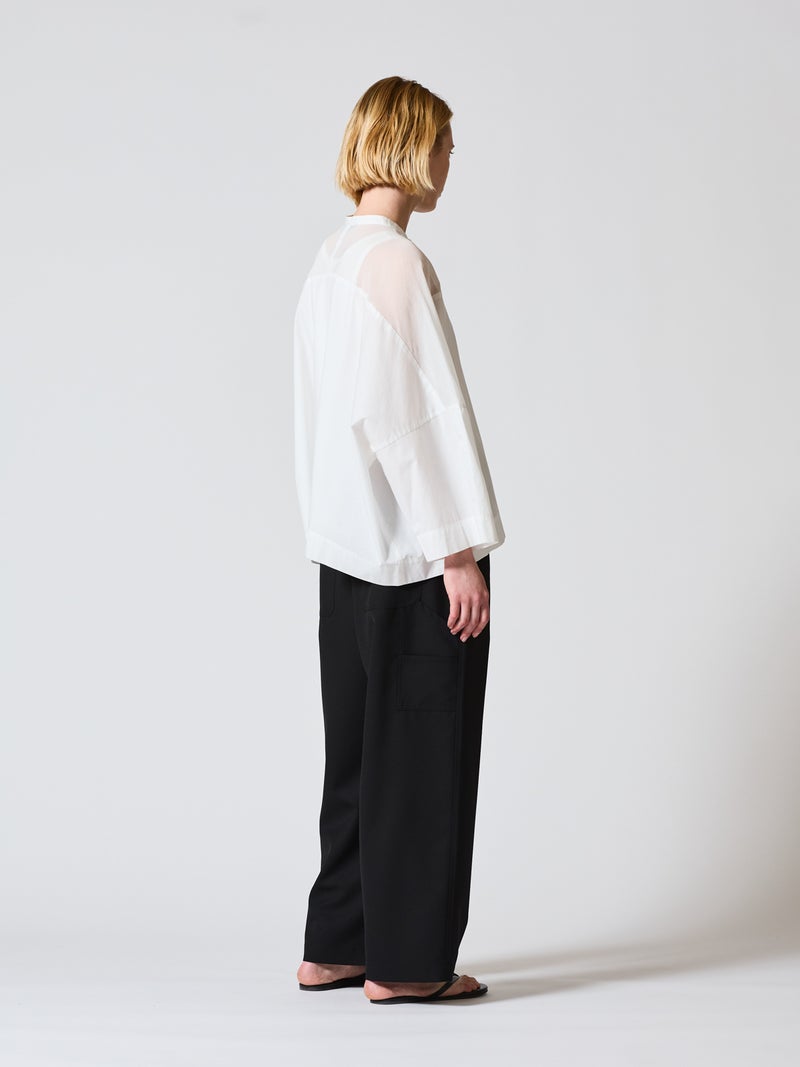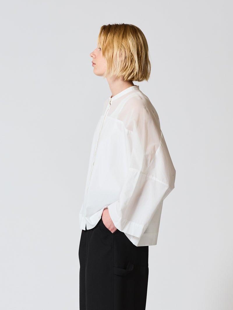 mizuiro ind定番アイテムでもあるシアーショルダースタンドカラーワイドシャツが新色を追加し再入荷しました。透け感を上品にミックスしたデザインが特徴的で、肩のヨーク部分をシアー素材で仕上げた魅力的な1枚。袖口や身幅にゆとりがあり、夏も涼しく着用していただけます。首元はすっきりとしたバランスの良いシルエットを表現しています。清楚でベーシックな雰囲気の4色のカラー展開に加え今季はパープルを追加しました。新鮮さも加わったおすすめの1枚です。2-250101/シアーショルダーワンピースも展開。