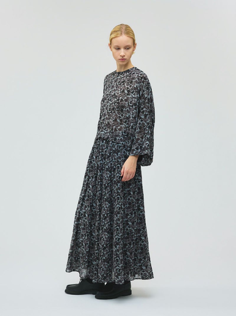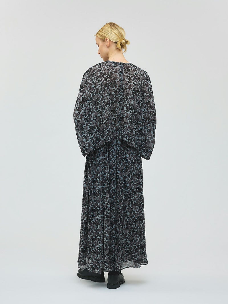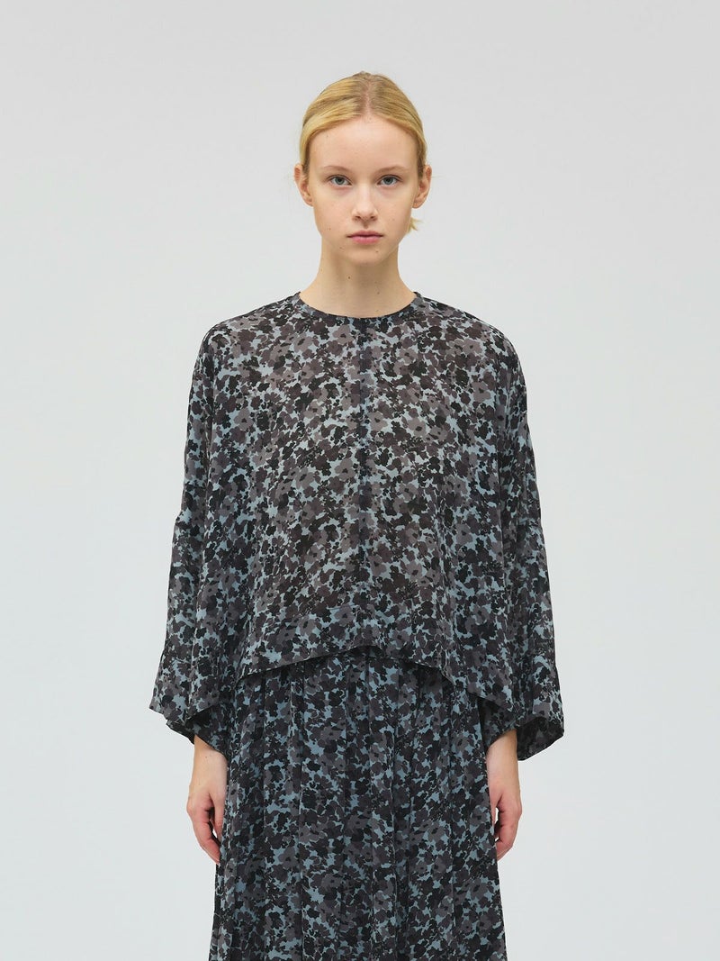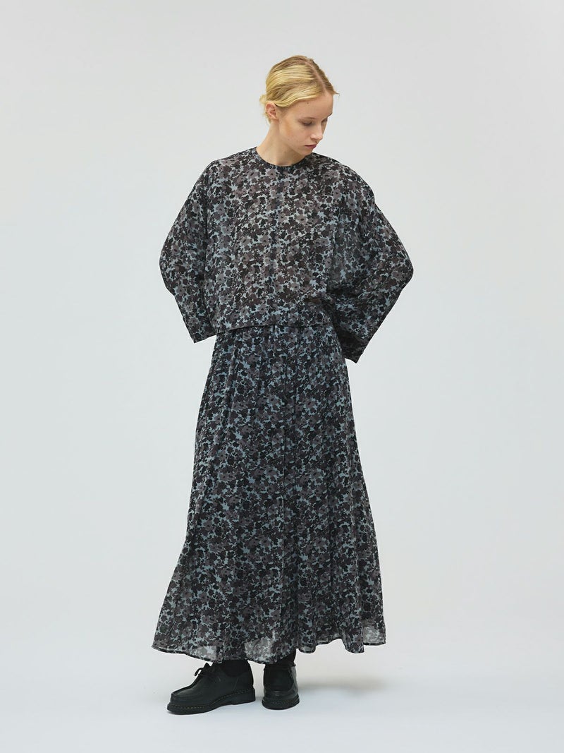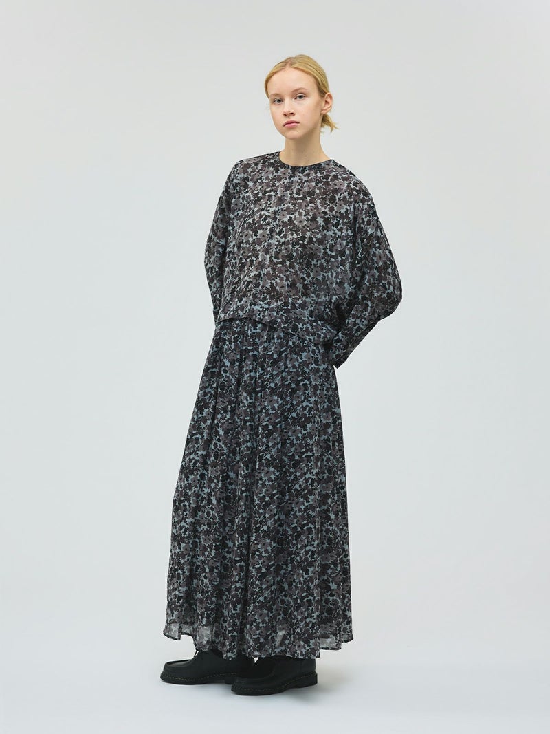 肌触りの良い軽やかなジョーゼット生地を使用したフラワープリントワイドプルオーバーです。ブラックのみの1色展開でシックな柄プリントシリーズとしてご提案。フロント丈はすっきりしておりますが、ワイドな身頃で中に重ねやすいサイズ感が特徴。サイドに落ち感のあるデザインなので、シャツのしなやかな動きを表現したシルエットが魅力的。透け感があるのでインナー使いが必須で、寒い時期はタートルを合わせても素敵です。バックネックにボタンが付いているので着脱のしやすいプルオーバーです。同シリーズの4-260069/フラワープリントロングスカートとセットアップでの着用もおすすめ。4-250047/フラワープリントシャツワンピースも合わせた3型で展開してます。
