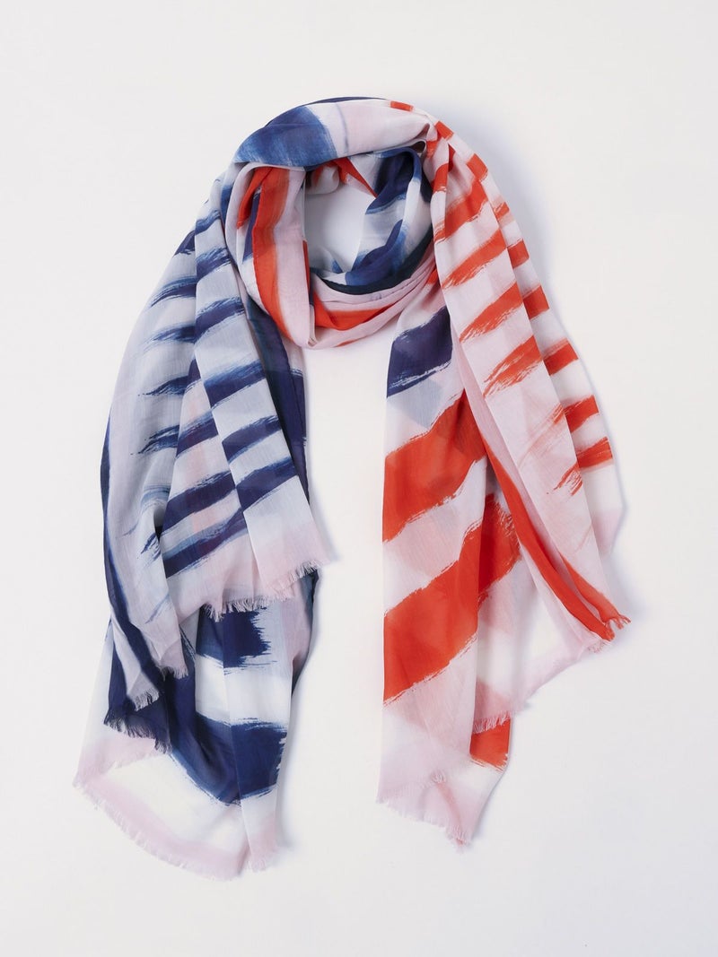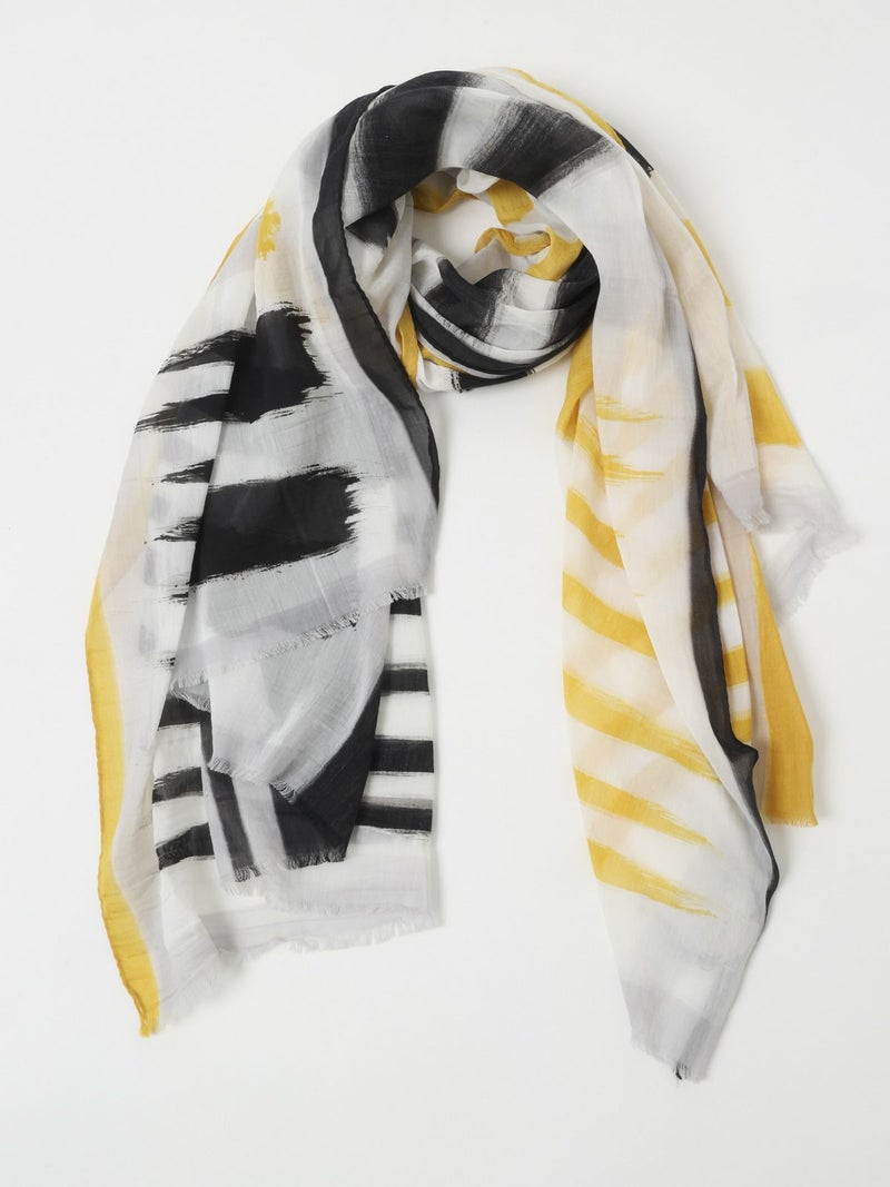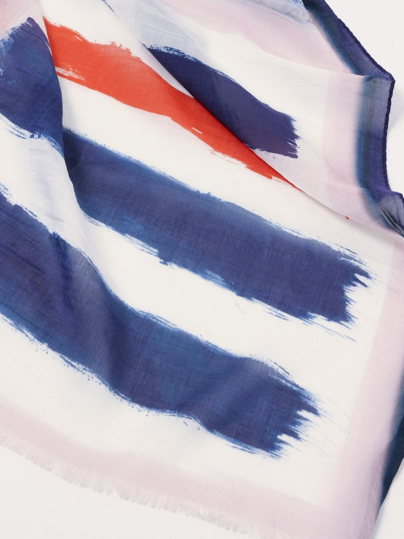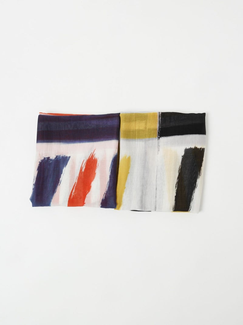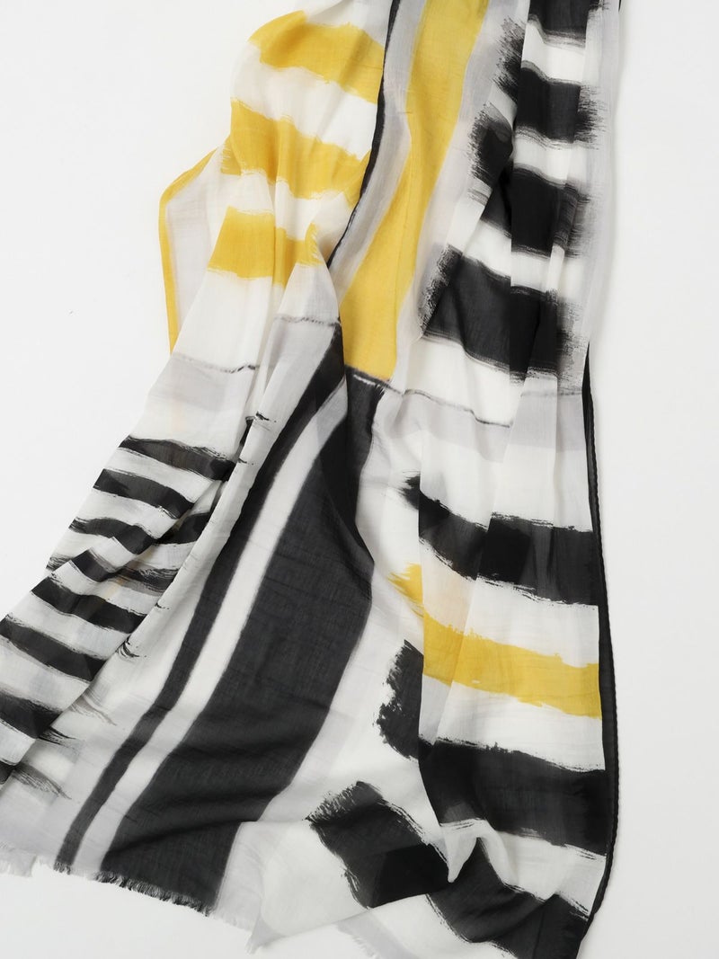 大胆に筆で描いたような柄が印象的な薄手のストール。長さ、幅の十分あるサイズ感で日焼け・冷房対策にも最適。職人の手作業により仕上げられた一枚で、コットンの優しい肌触りとシルクの高級感が程よく暑い季節も快適な着け心地です。