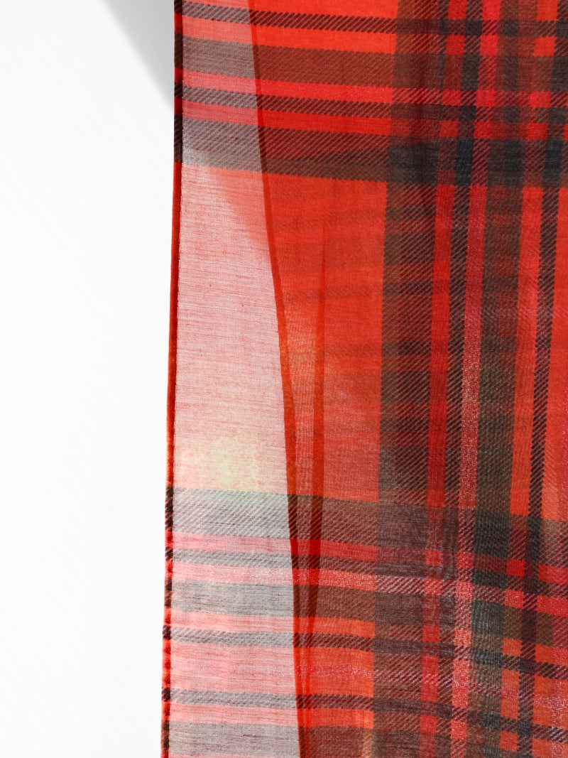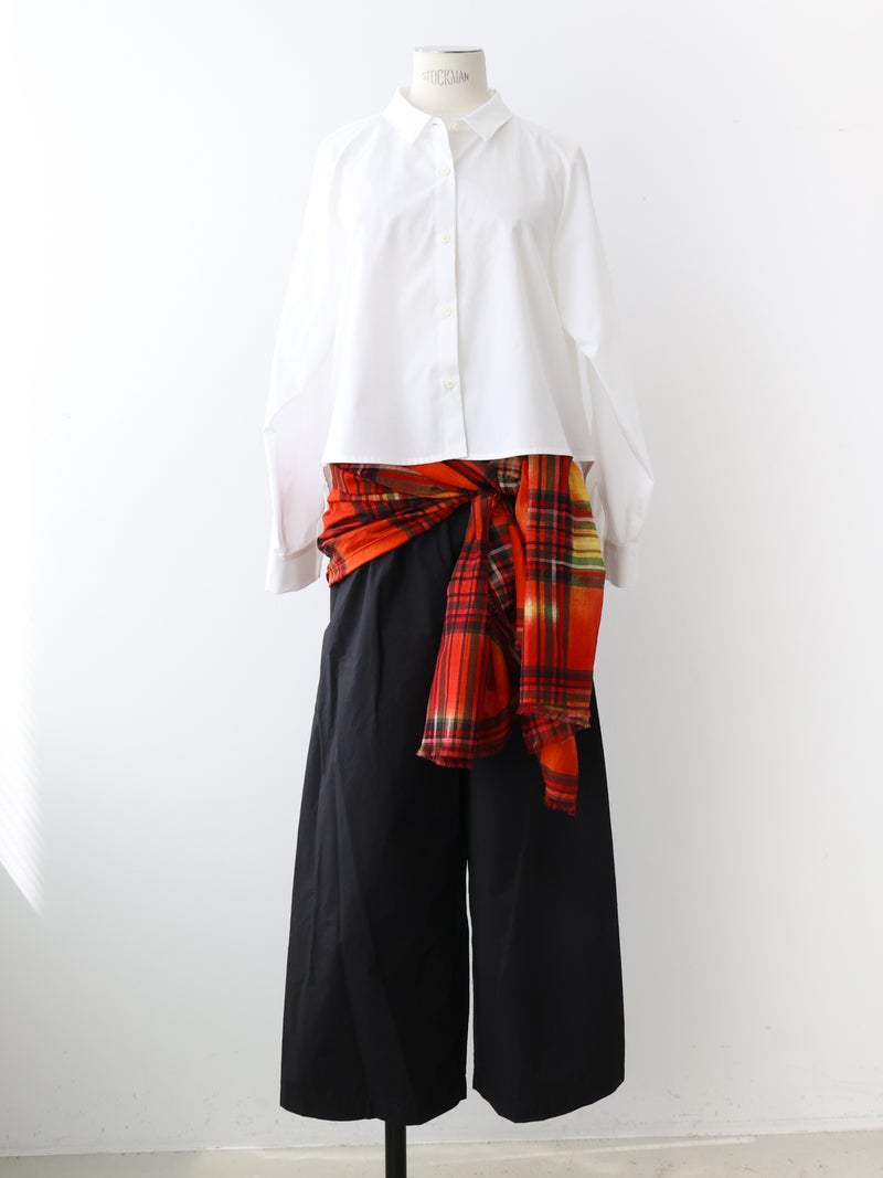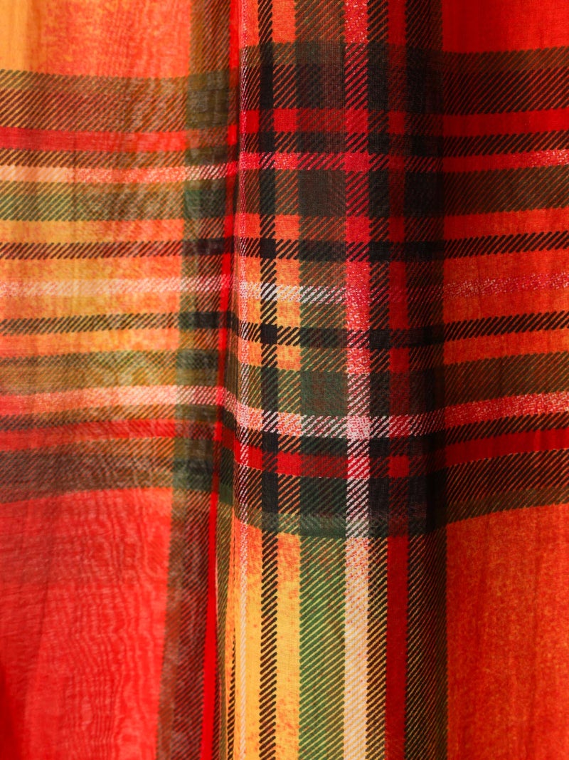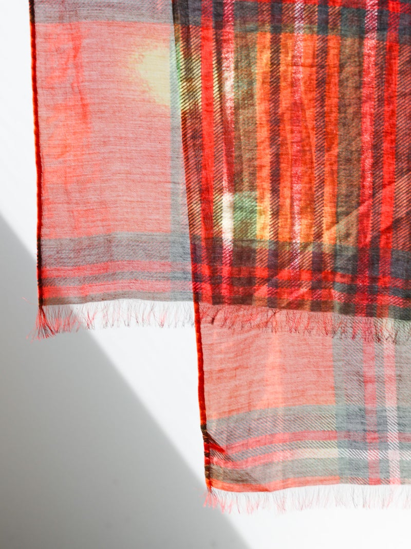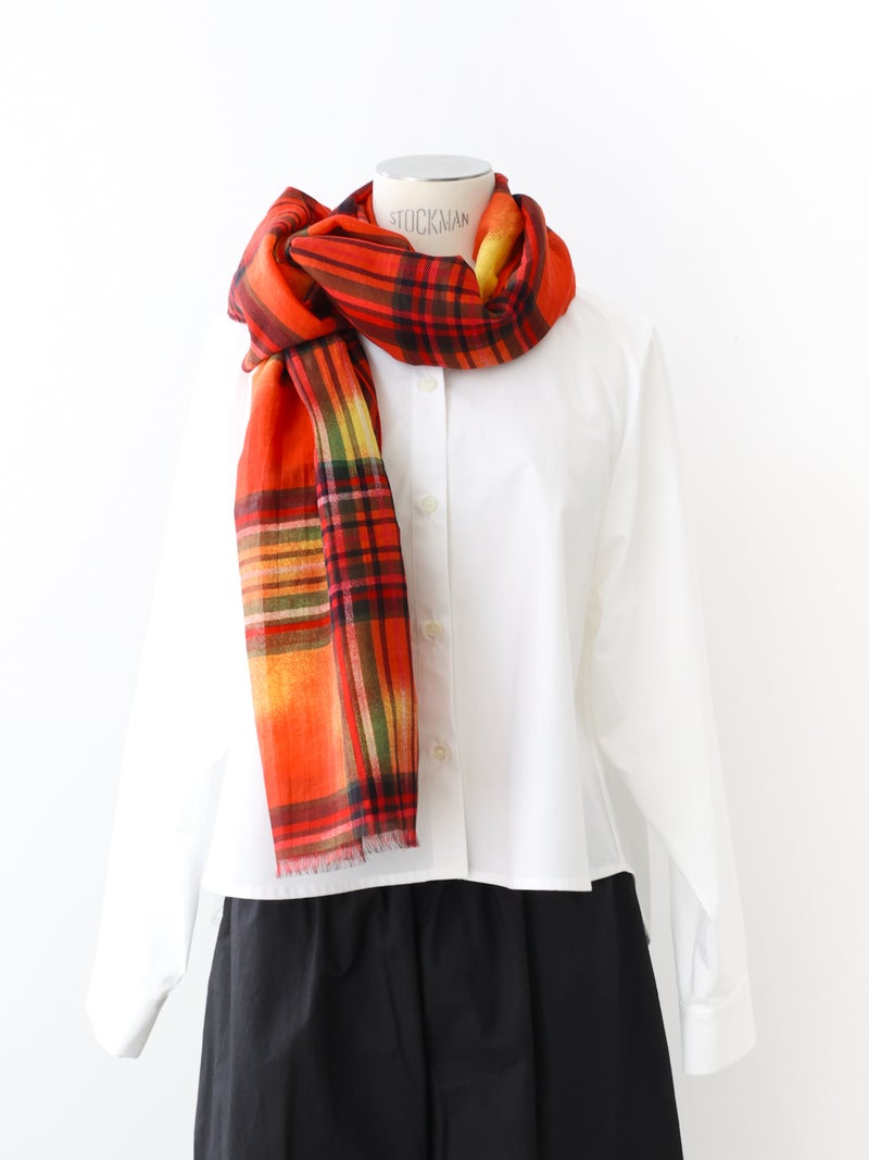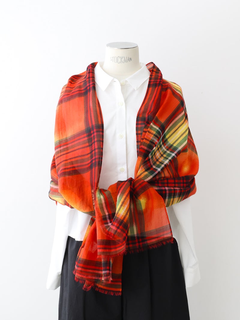 コットン×シルク素材を使用した、軽やかな透け感のあるストール。やわらかな肌触りと、発色の美しいチェック柄がコーディネートのアクセントに。さらりと巻くだけでスタイリングにニュアンスをプラスし、春夏の冷房対策や日除け、秋口の軽い防寒など季節の変わり目にも活躍します。