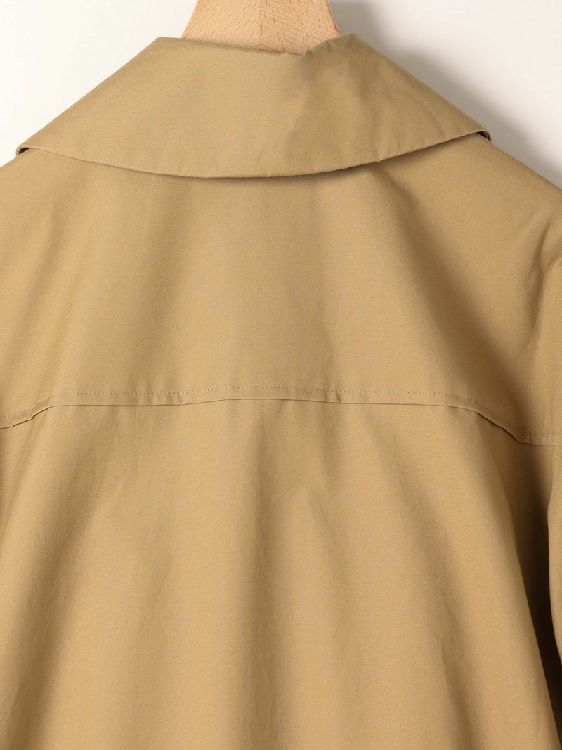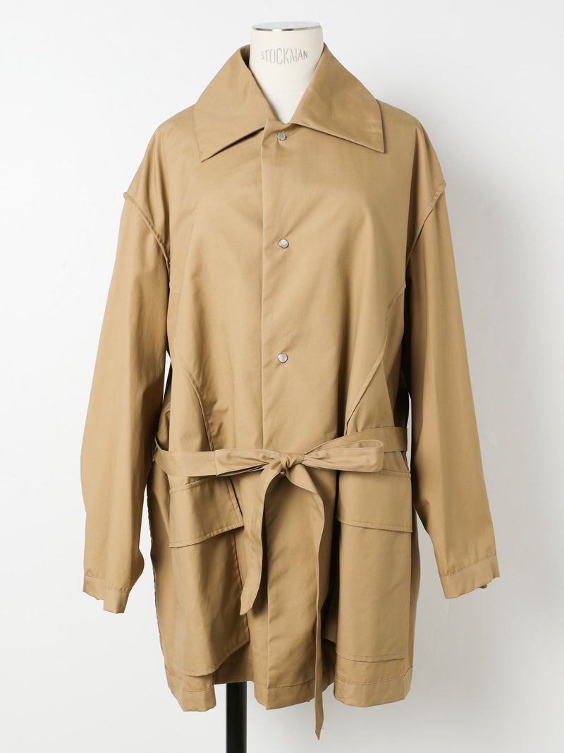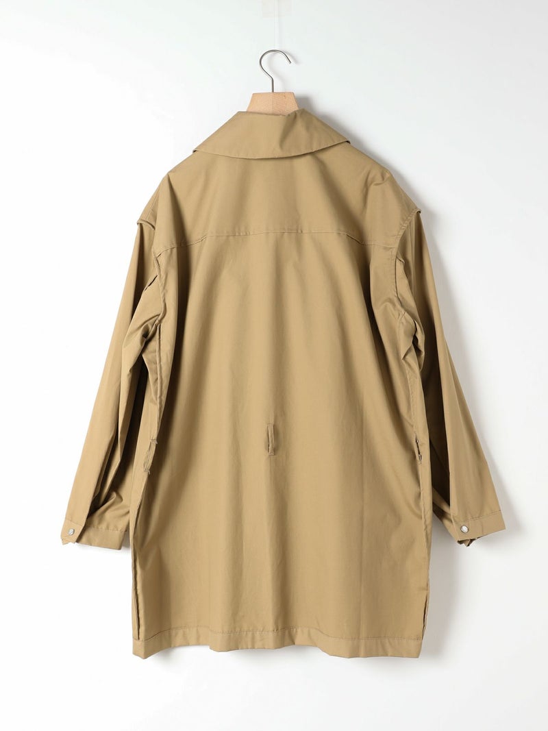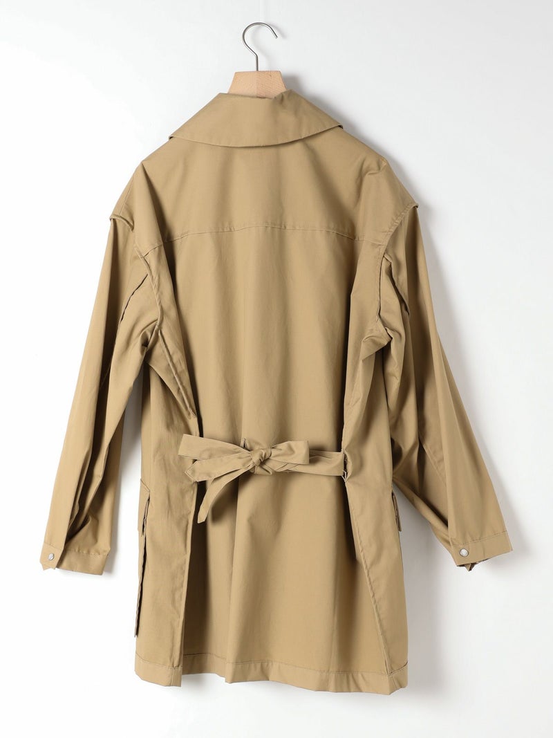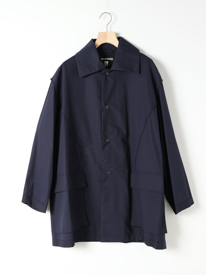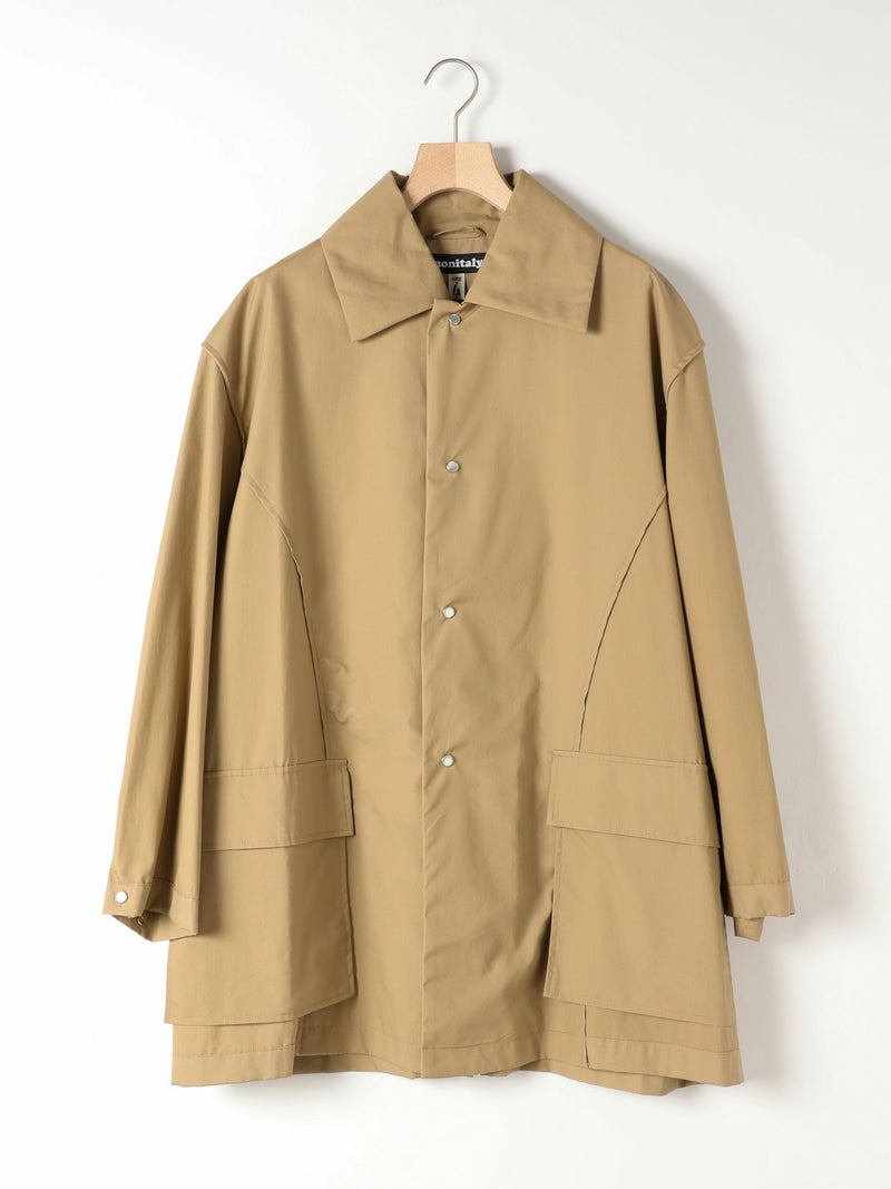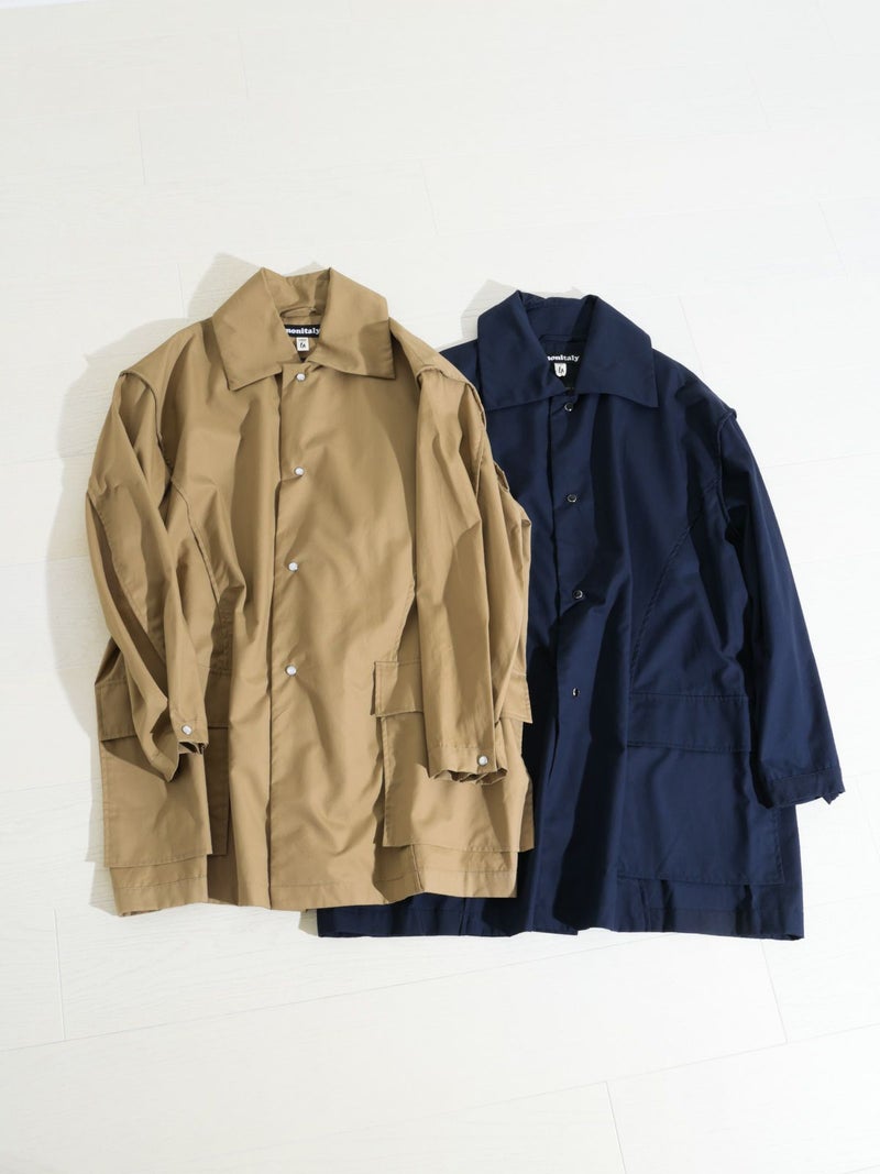 モニタリーの「URA JUTE COAT(ウラジュートコート)」。「URA」とは、あえて衣服を「裏返した」ように見せるインサイドアウトのデザイン手法。通常は隠れる縫製や構造をあえて表に見せることで、独自の存在感を演出しています。「JUTE COAT」は、1940 50年代のアメリカ軍やヨーロッパのワークウェアから着想を得た一着。ラグランスリーブや大きなパッチポケット、ボタンフロントなどのヴィンテージディテールを踏襲しつつ、シングルボタンとウエストベルトによって洗練された佇まいに仕上げられています。素材には、程よい光沢と滑らかな手触りをもつオリジナルの「Vancloth Oxford」を使用。耐久性にも優れ、都会的な日常着としての実用性も兼ね備えています。クラシックなユーティリティウェアを、現代の感性で再構築したモダンなコートです。