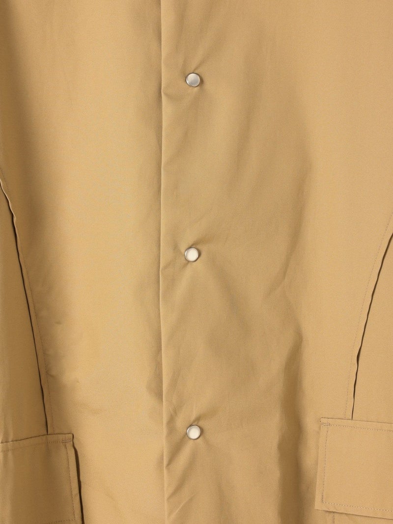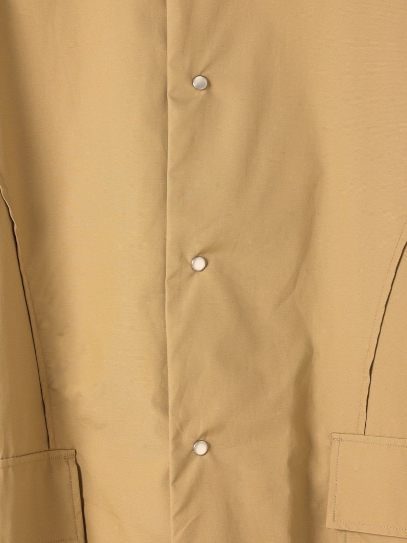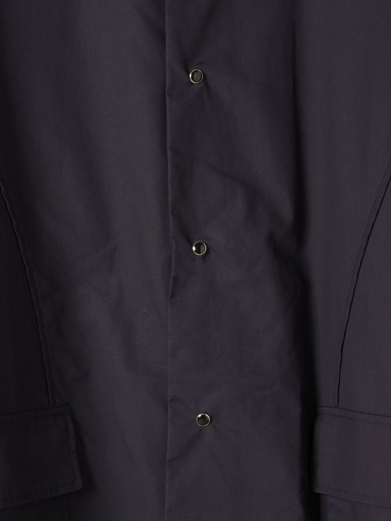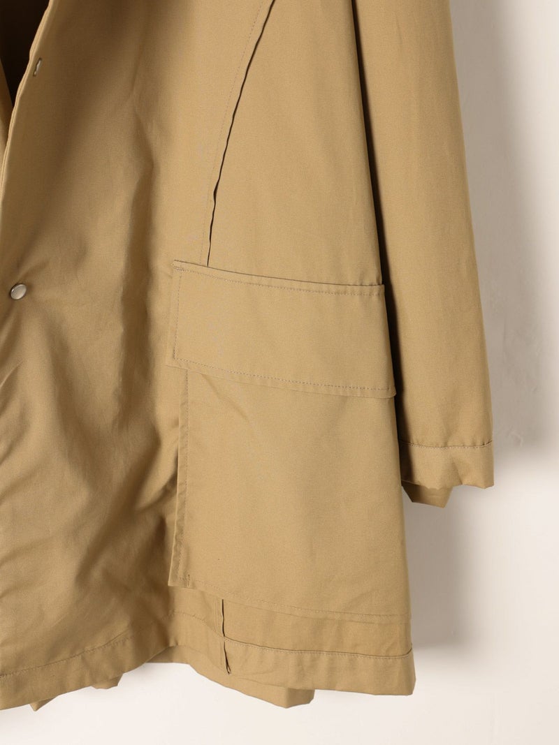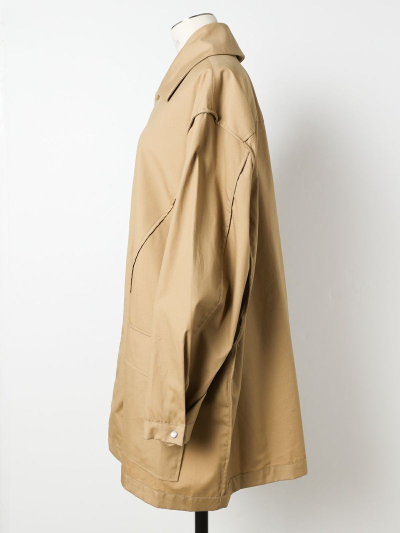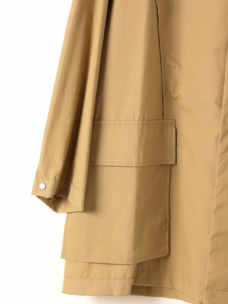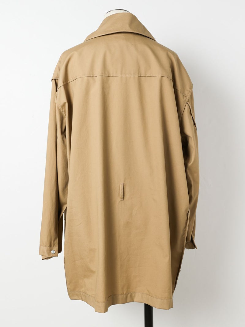モニタリーの「URA JUTE COAT(ウラジュートコート)」。「URA」とは、あえて衣服を「裏返した」ように見せるインサイドアウトのデザイン手法。通常は隠れる縫製や構造をあえて表に見せることで、独自の存在感を演出しています。「JUTE COAT」は、1940 50年代のアメリカ軍やヨーロッパのワークウェアから着想を得た一着。ラグランスリーブや大きなパッチポケット、ボタンフロントなどのヴィンテージディテールを踏襲しつつ、シングルボタンとウエストベルトによって洗練された佇まいに仕上げられています。素材には、程よい光沢と滑らかな手触りをもつオリジナルの「Vancloth Oxford」を使用。耐久性にも優れ、都会的な日常着としての実用性も兼ね備えています。クラシックなユーティリティウェアを、現代の感性で再構築したモダンなコートです。