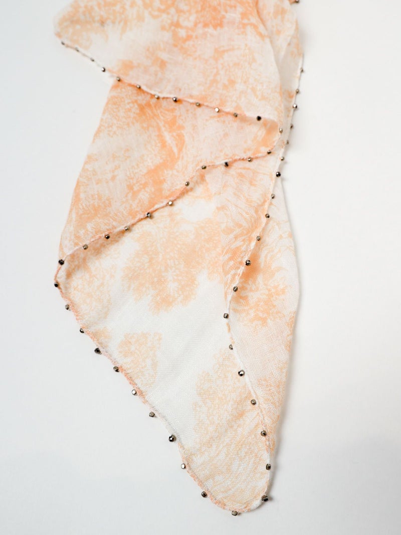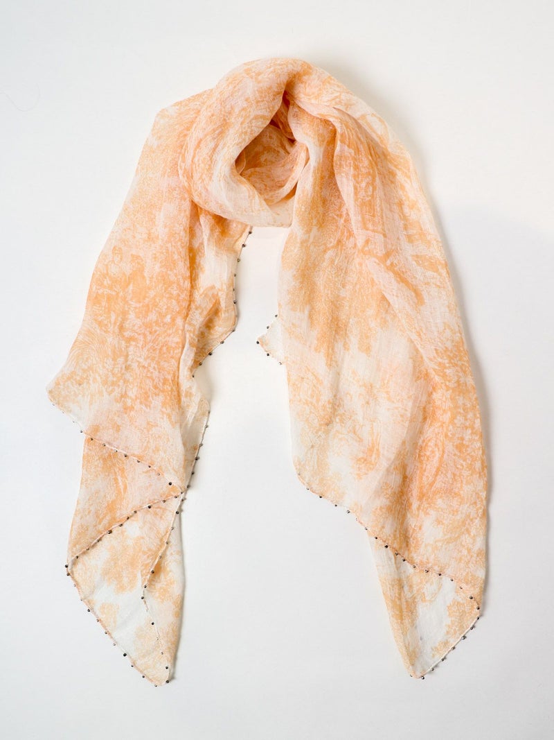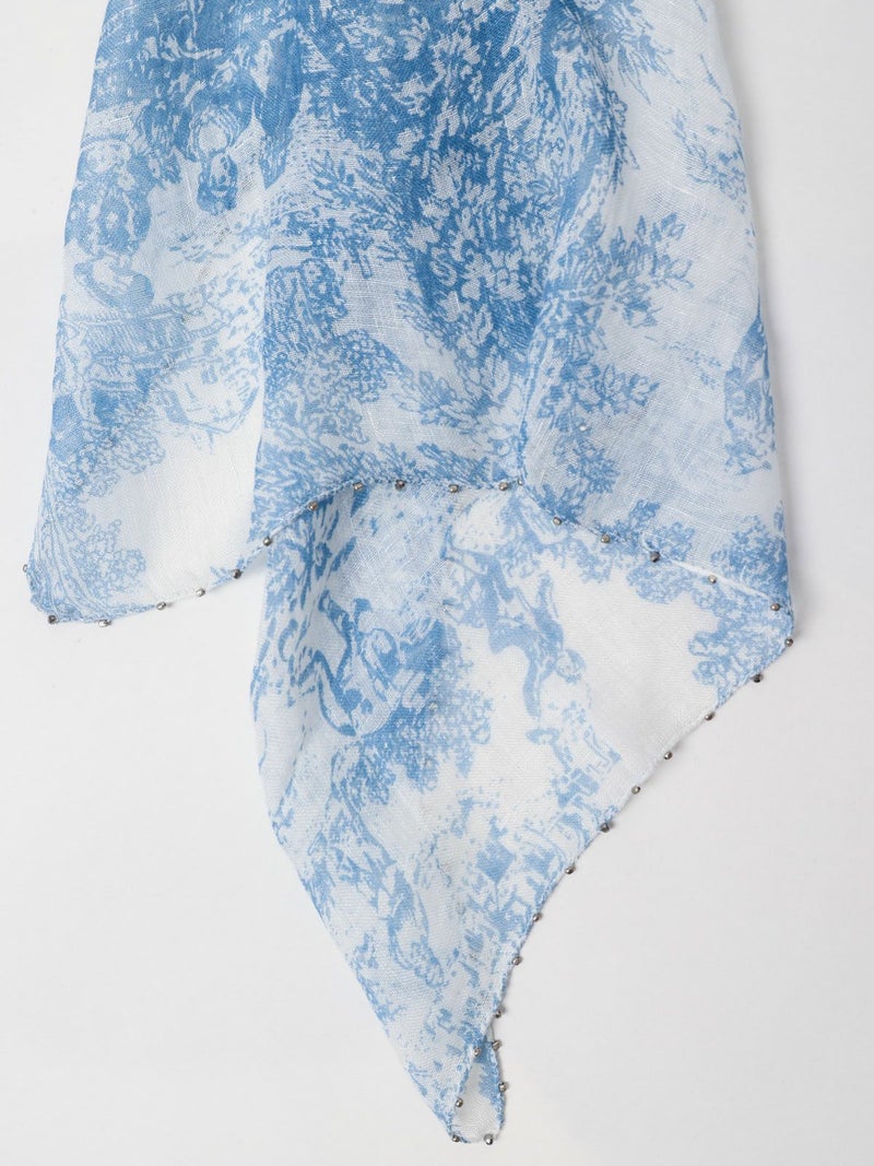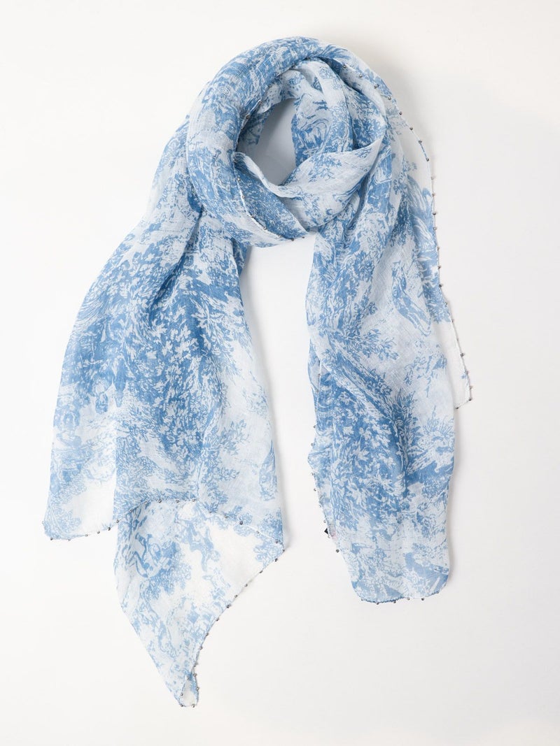 シルバービーズがアクセントのヨーロピアンの風景画がモチーフになったリネンストール。色鮮やかな2色のカラーとビーズのきらめきがカジュアルにもフォーマルにも合わせやすい使い勝手の良いアイテムです。