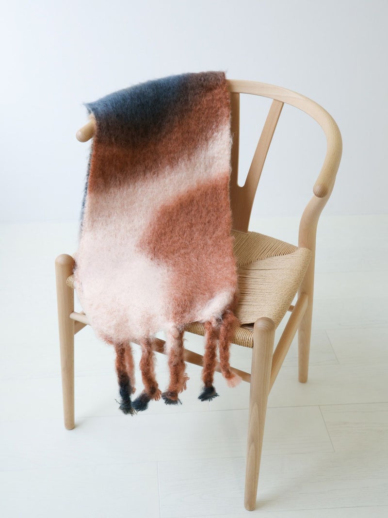 もこもことしたボリュームのあるストール。やわらかい色の移り変わりが美しくやさしい印象。ころんとした太めに編まれたフリンジがポイント。見た目も体感も暖かい、冬に重宝する一枚です。