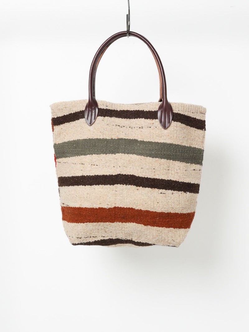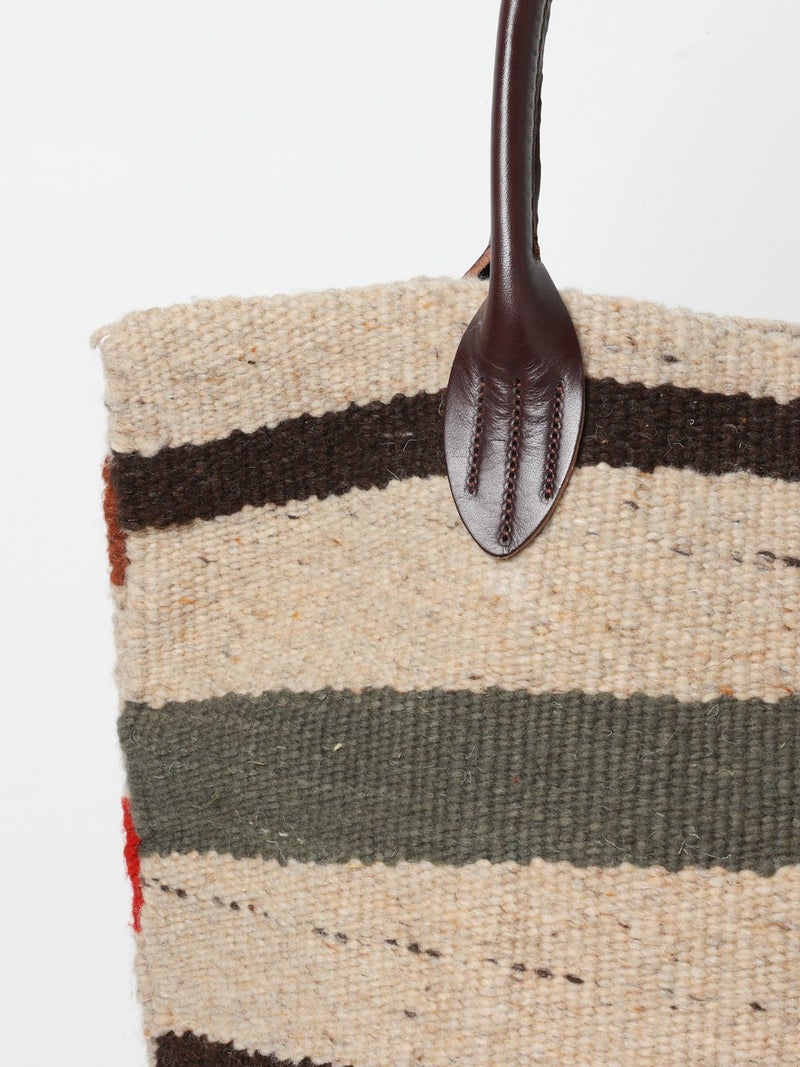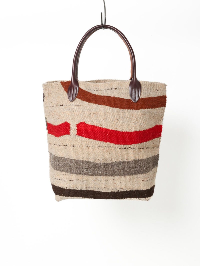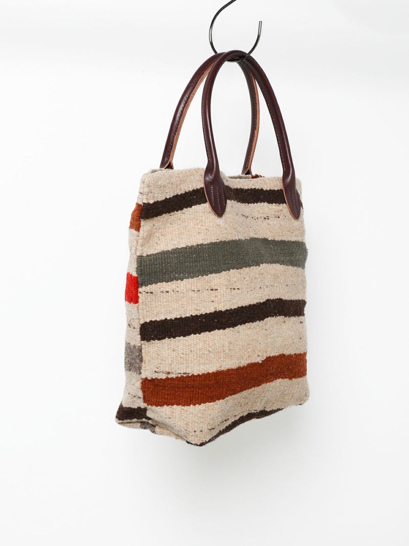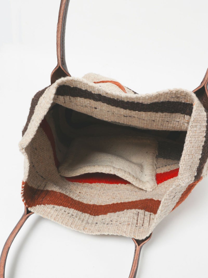 最高級のメリノウールを使用したトートバッグ。伝統的な技法で 一つ一つ織られた色・柄は他に類を見ない商品に。大振りのサイズ感と肩に掛けれる持ち手の長さは男女問わず使える万能なサイズ感に。また持ち手はレザーを使用しており長く愛用できる1点に。