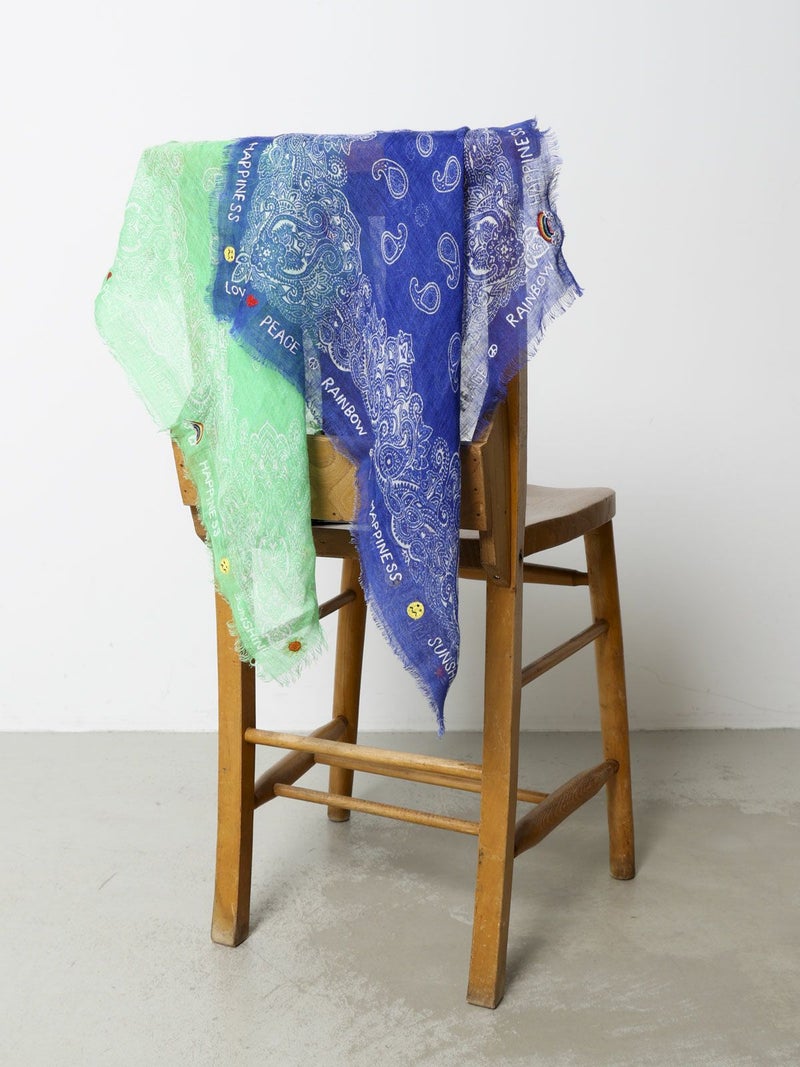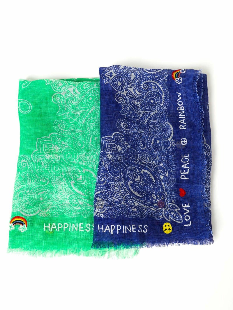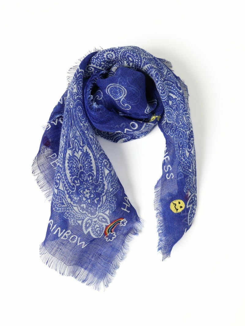 ポップな刺繍とペイズリー柄のスクエア型スカーフです。縁のフリンジがポイント。リネンのざっくりとした爽やかな肌心地と透け感で暑い季節のコーディネートで活躍します。