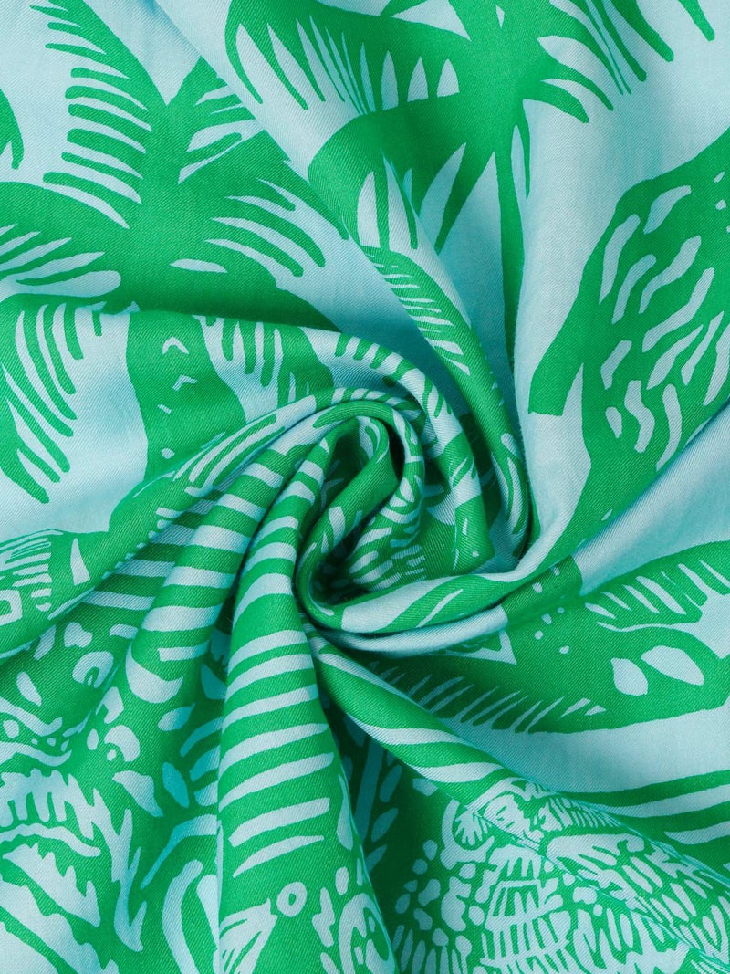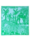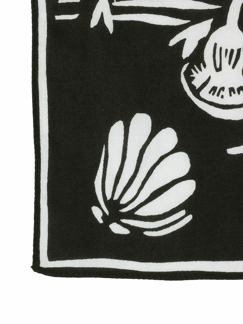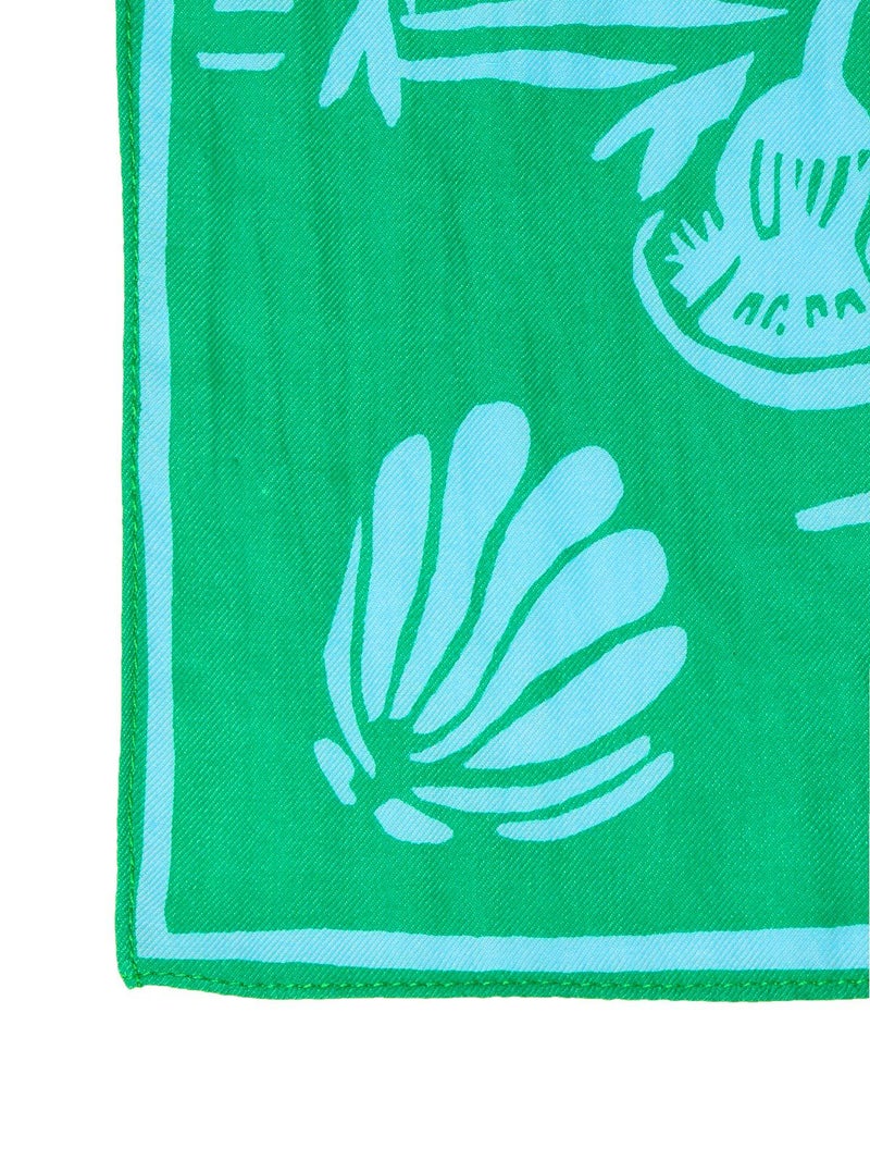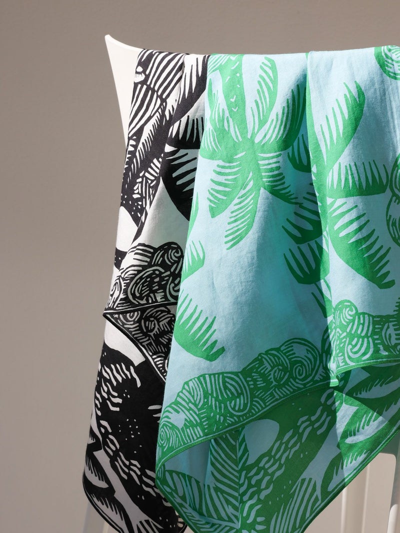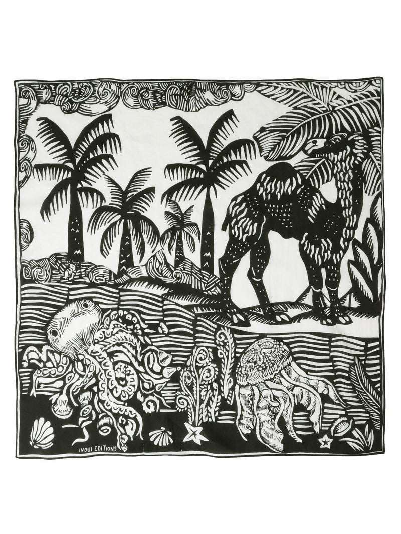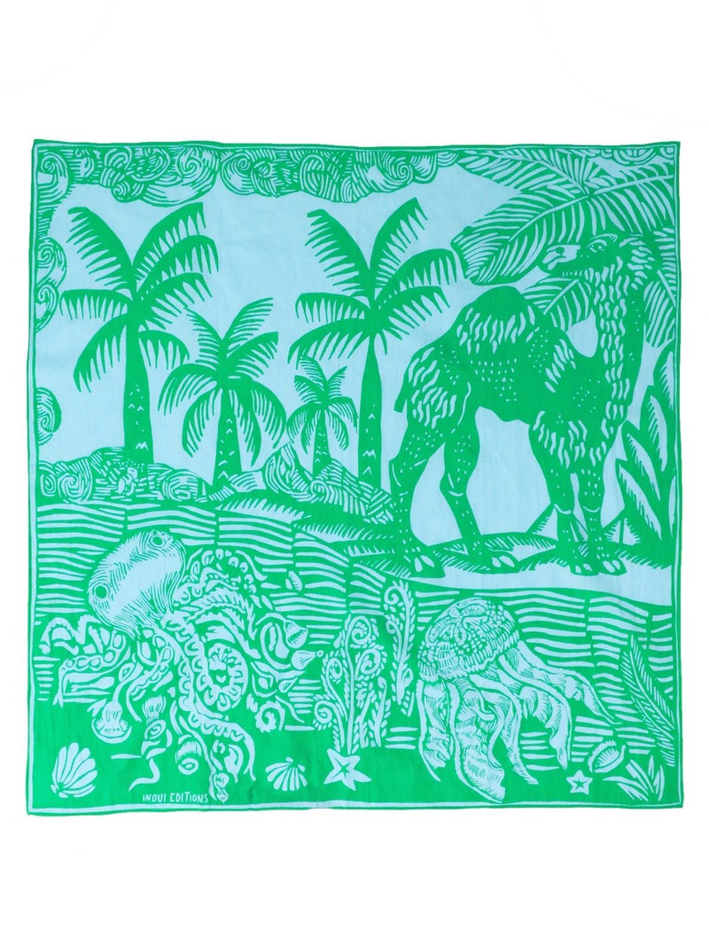 ラクダやヤシの木が描かれたユニークなデザイン。アクセントになるブルーグリーンとブラックの2色展開。コットンメインの素材で柔らかい肌触りが特徴です。鞄に巻いたり肩にかけたり様々な用途でお使いいただけます。