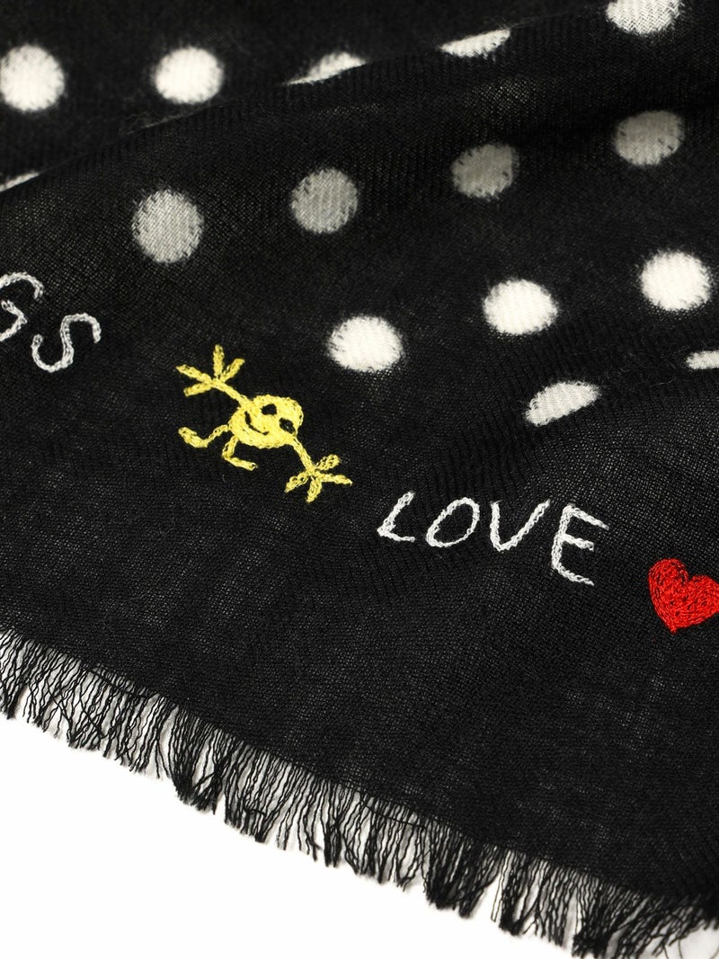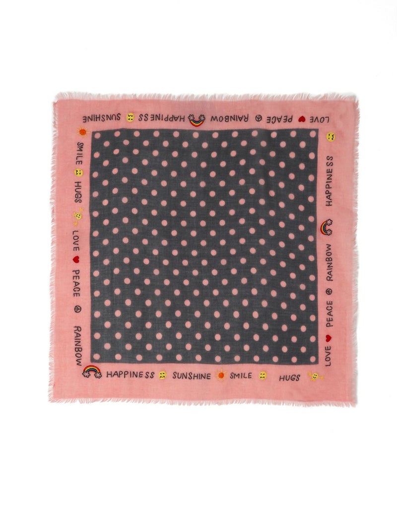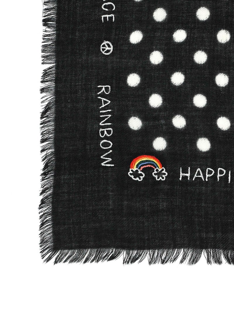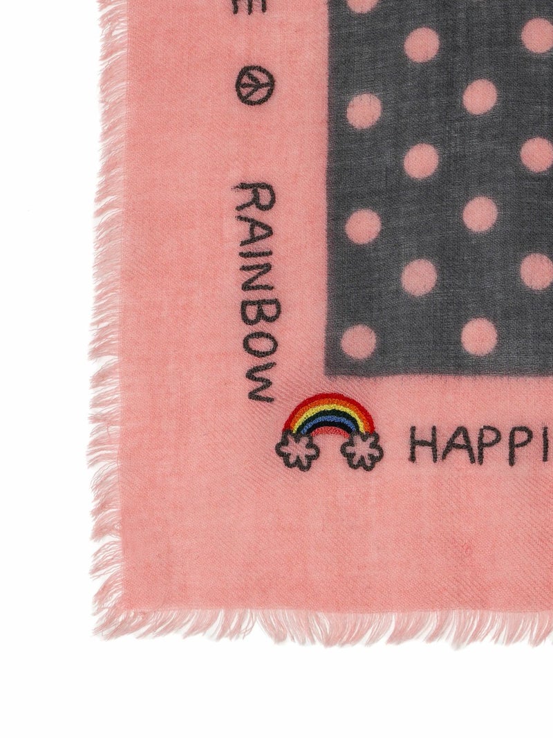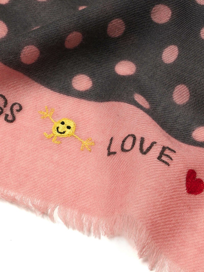 軽やかな素材感に、ドット柄プリントを施した遊び心あるストール。“LOVE”“PEACE”“RAINBOW” などのポジティブワードや虹・スマイルマークが散りばめられ、CITRUS(シトラス)らしい華やかさと柔らかな風合いが魅力の一枚です。