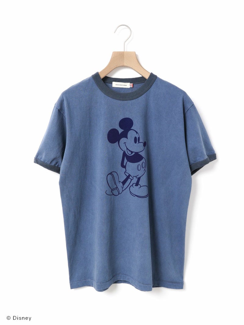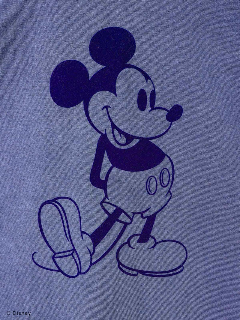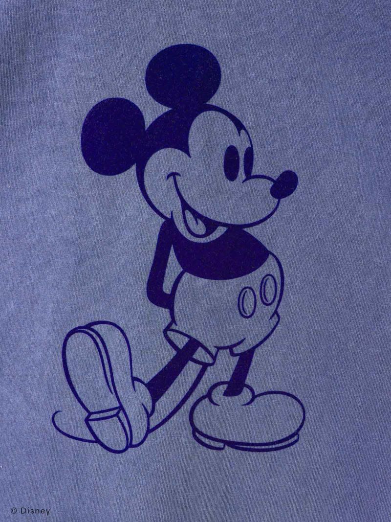 「ミッキーマウス」のフロッキ―プリントが印象的なTシャツ。古着のように着古した加工でしっかりとしたコットン素材ながらシャリ感があり柔らかな風合いが特徴。ネックと袖口のリブもポイントです。ユニセックスサイズで、ゆったりとしたシルエットがこなれた雰囲気を演出。リラックス感のある着心地で、さりげないスタイルを楽しめる一枚です。