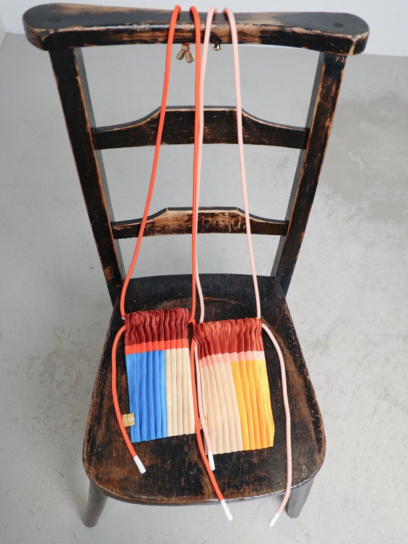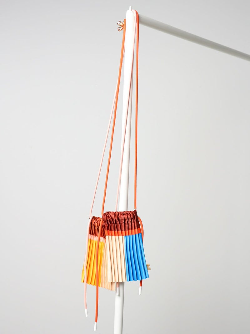 サテンプリーツクロスボディミニバッグ。プリーツ加工されたファブリックはシルクのような質感の合成サテン素材を使用。鮮やかな色合いでコーディネートに華やかさを加えます。スマートフォンやお財布などが入るサイズ感です。調整可能なショルダーストラップとドローストリング(絞り紐)で閉じることができます。カジュアルから特別な日まで幅広いシーンで活躍しMULTITUDESの洗練されたデザイン哲学を体現しています。