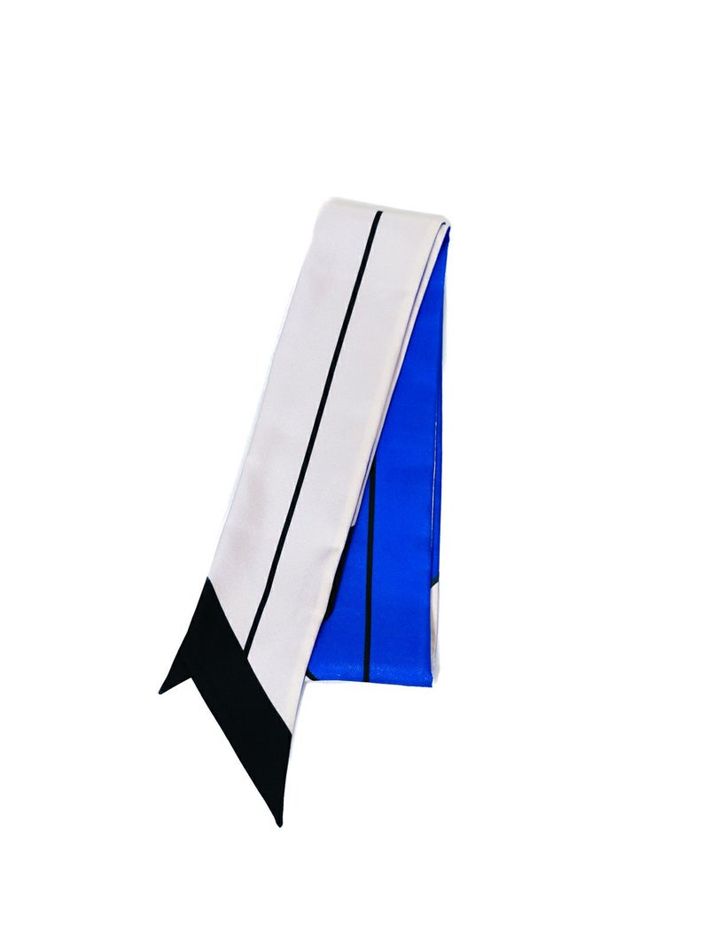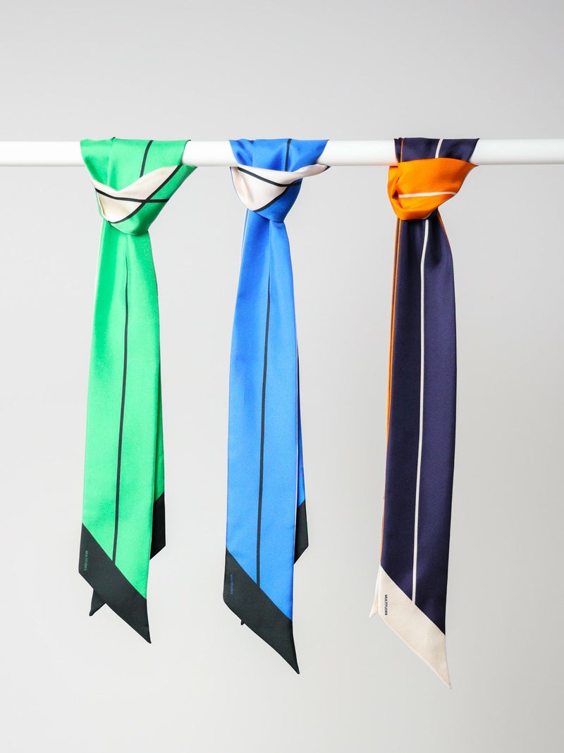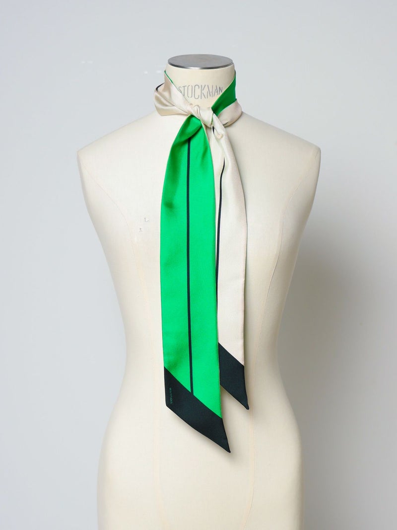 シルク製のタイスカーフです。カラーブロックのグラフィックが特徴で、シンプルながらも存在感のあるデザインが魅力です。シルクの光沢感が上品な印象を与え、コーディネートのアクセントになります。シンプルなスタイリングにさりげなく巻くだけでコーディネートが華やぎます。