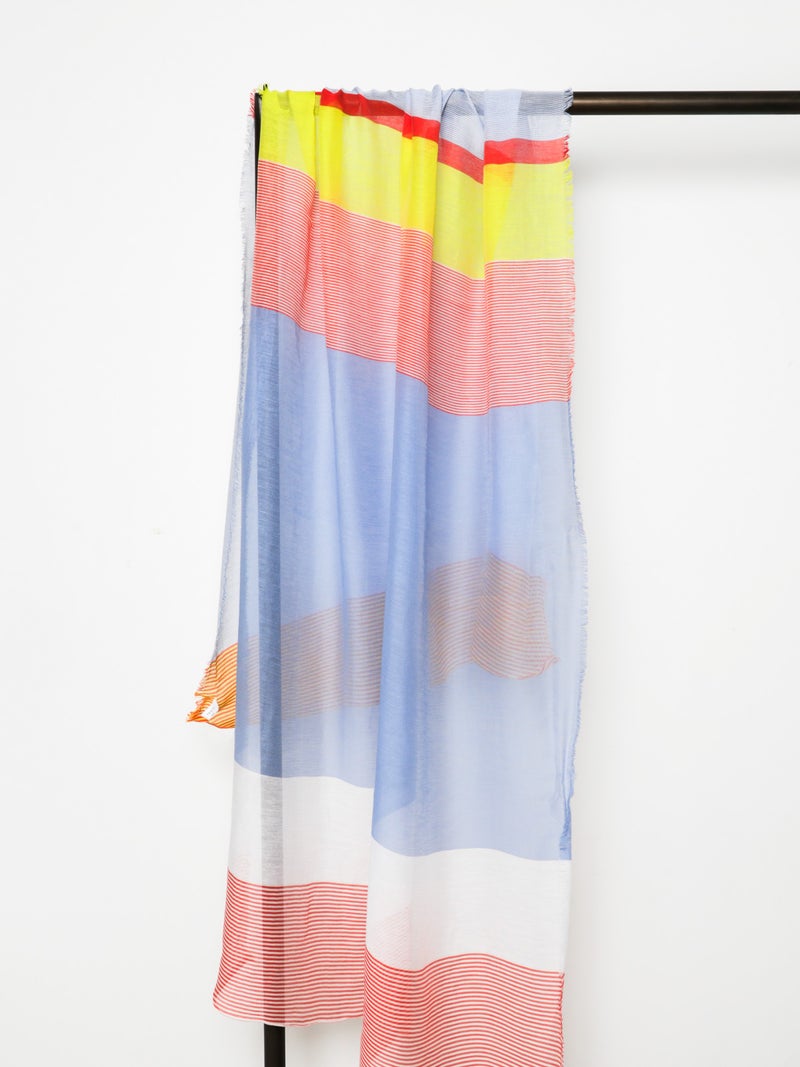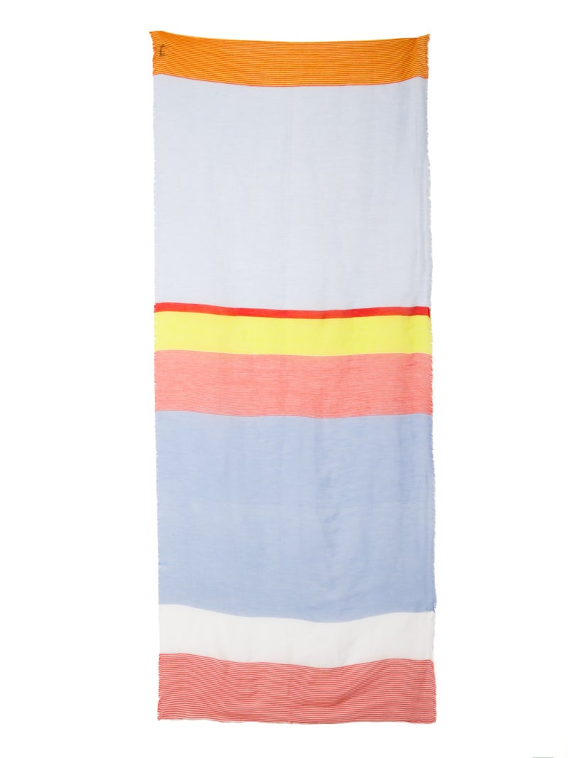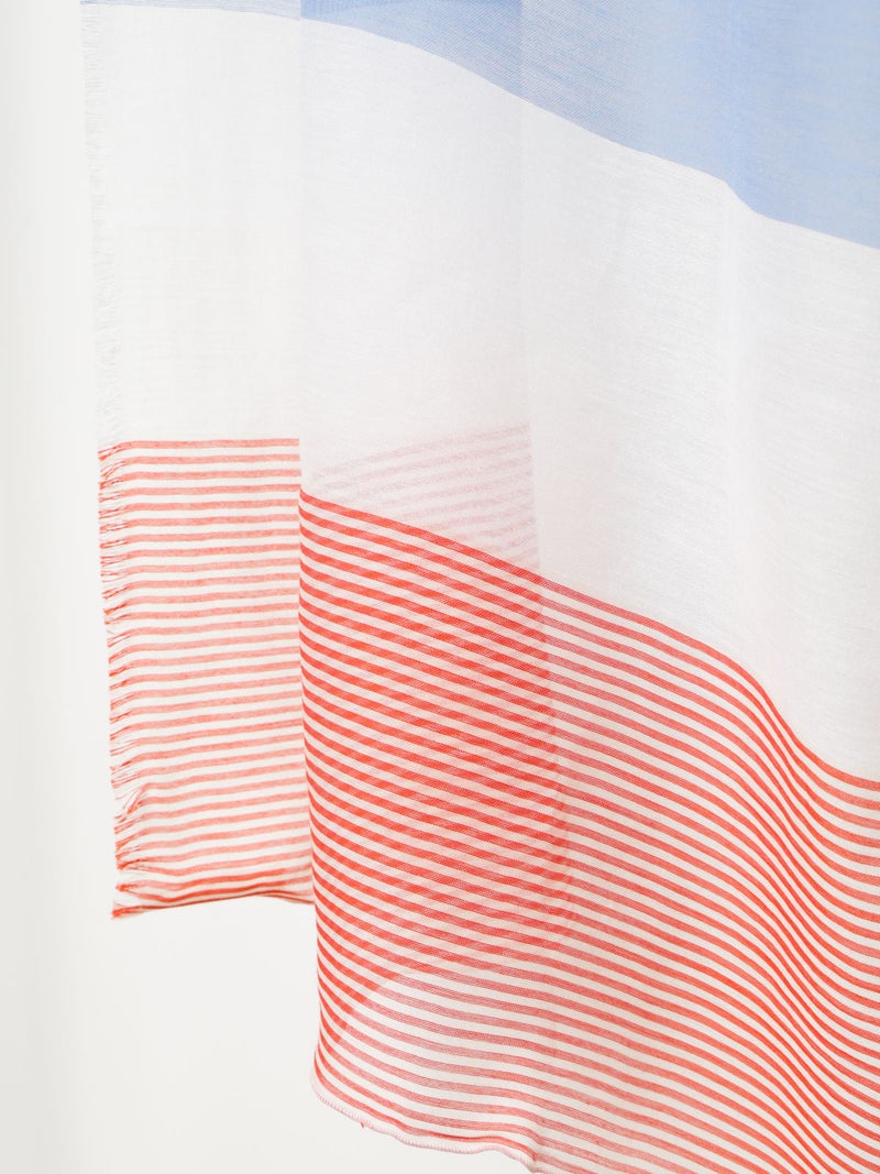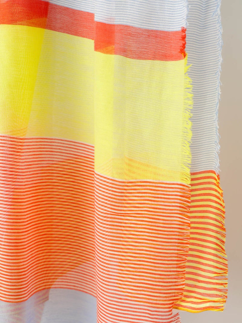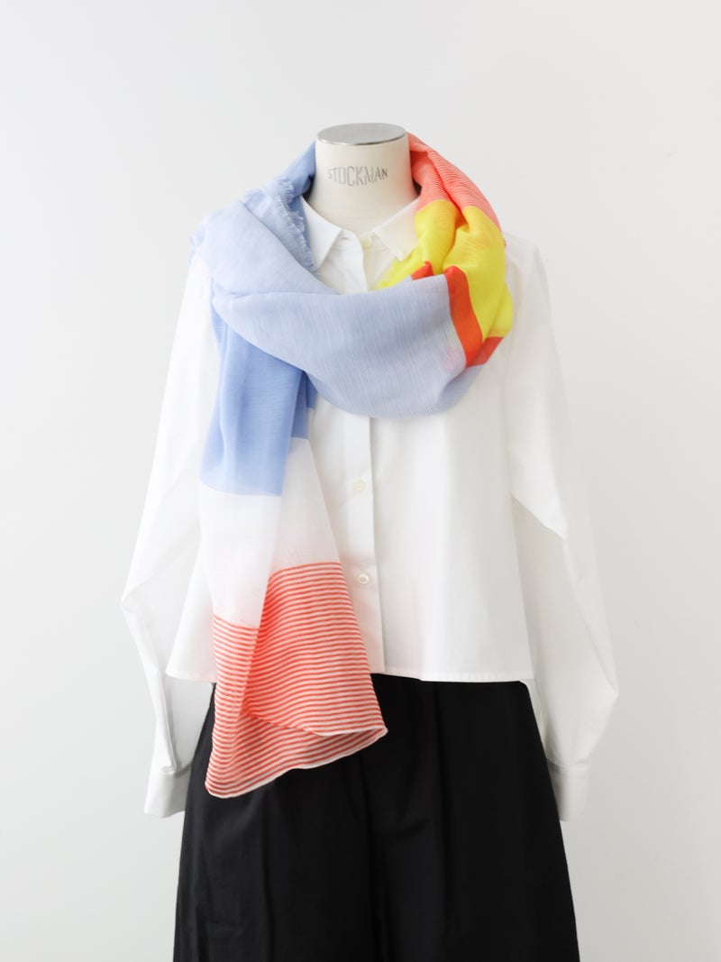 コットン×シルク素材を使用した、繊細で軽やかなフリンジストール。透け感のあるやわらかな風合いが魅力の上品な仕上がりです。赤・白・ブルー・イエロー・オレンジのカラーが重なり合い、単色のようにもストライプのようにも見える、フランスらしい感性が光る絶妙なデザインバランスが印象的。巻くだけでスタイリングにさりげない彩りと洗練された雰囲気をプラスします。春夏の冷房対策や日除け、秋口の軽い防寒にもおすすめです。