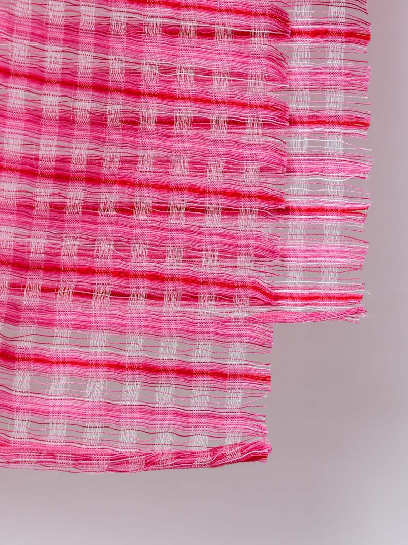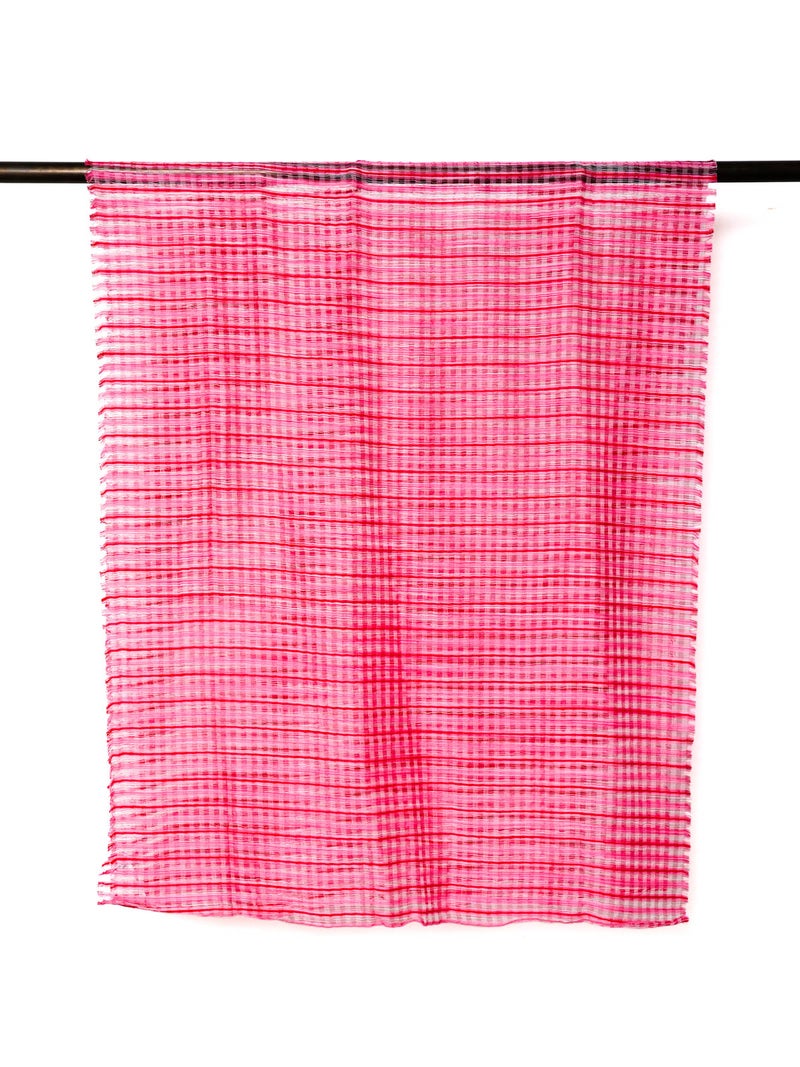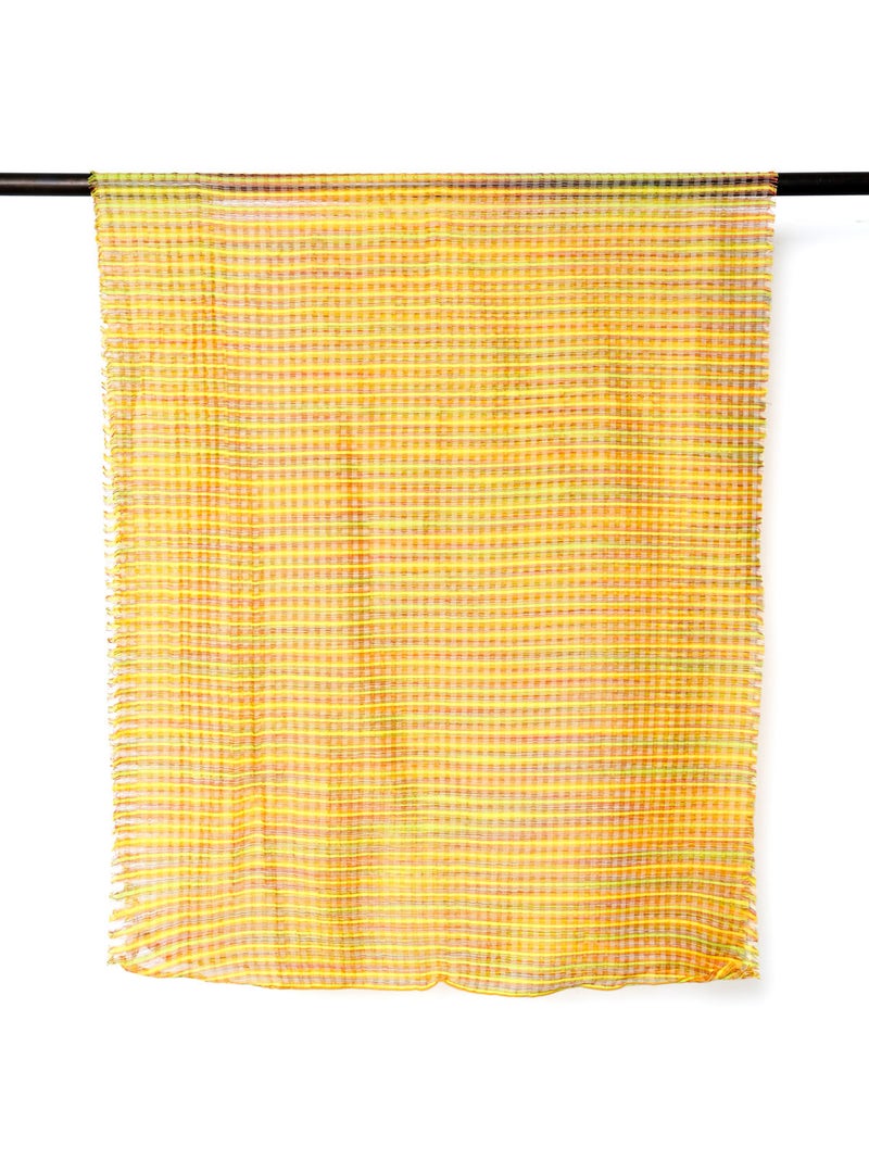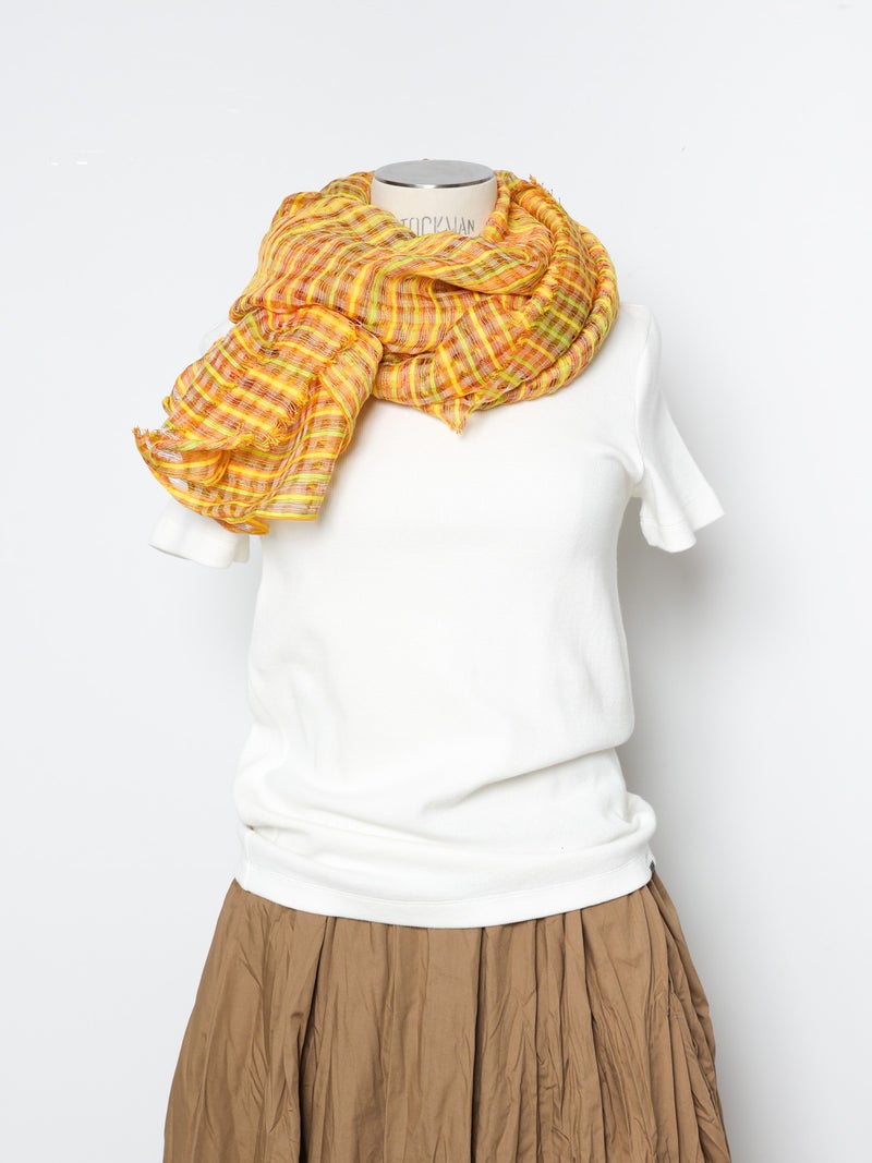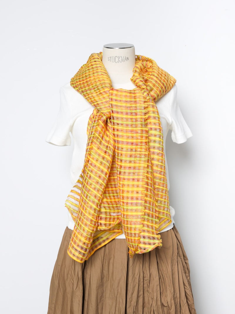 コットン×シルク素材を使用した、軽やかで繊細なフリンジストール。糸と糸の隙間を活かした独特の織りで柄を表現し、糸のコントラストによるストライプが印象的な一枚です。ピンク系とイエロー系をベースに、同系色の濃淡で奥行きを持たせたカラーリングが特徴。フランスらしい感性が漂う、絶妙なバランスのデザインがスタイリングにさりげない華やかさを添えます。春夏の冷房対策や日除け、秋口の軽い防寒にもおすすめです。