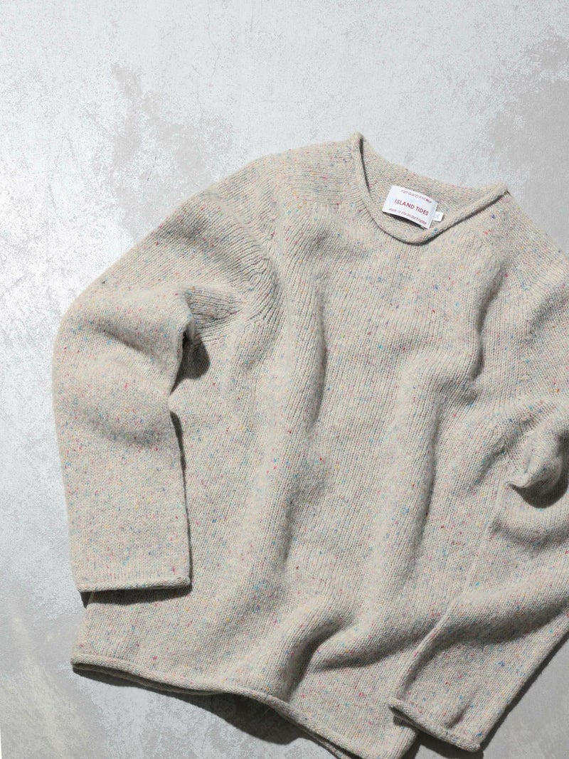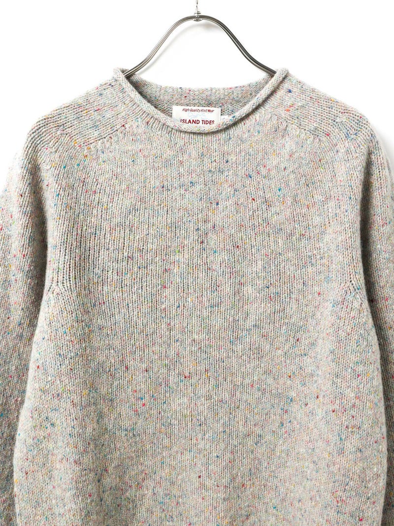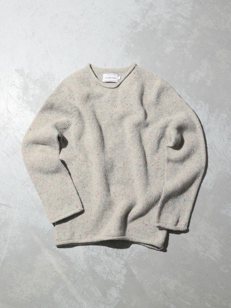ISLAND TIDESらしい柔らかで温かみのある風合いが魅力のクルーネックニットプルオーバー。表面には細かなカラーネップが散りばめられており、シンプルながら豊かな表情を持つ1着です。肩周りはラグラン仕様で動きやすく、リラックス感のあるシルエットが日常使いにぴったり。軽やかな着心地ながらしっかりと暖かく、秋冬のワードローブに頼れるアイテムです。