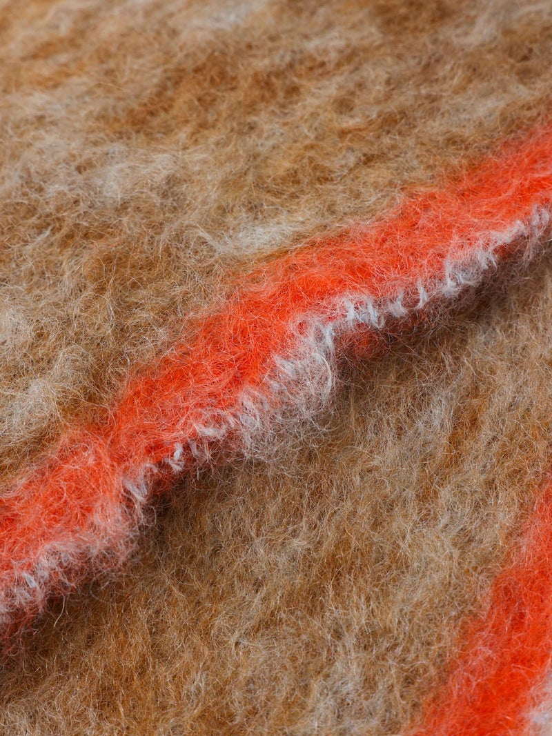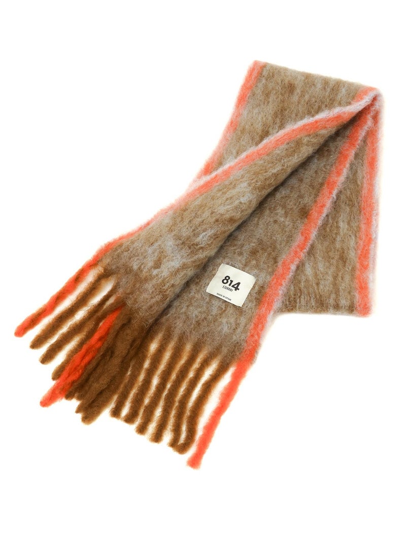 スペイン製の高品質モヘア素材を使用し、柔らかくふんわりとした肌触りが特徴。職人の丁寧な手仕事によって仕上げられた生地は、ふんわりとした軽さと保温性を兼ね備えています。ベージュをベースにオレンジのラインがアクセントになった上品で温かみのあるデザイン。シンプルなコーディネートにプラスするだけで華やかさを演出します。ユニセックスで使える万能アイテムとしてギフトにもおすすめです。