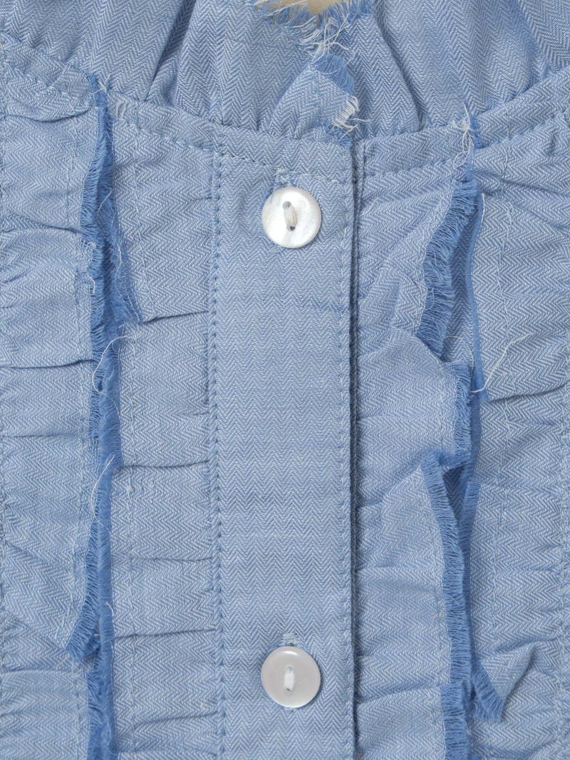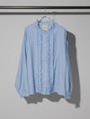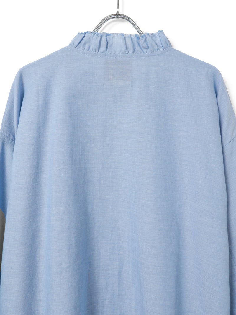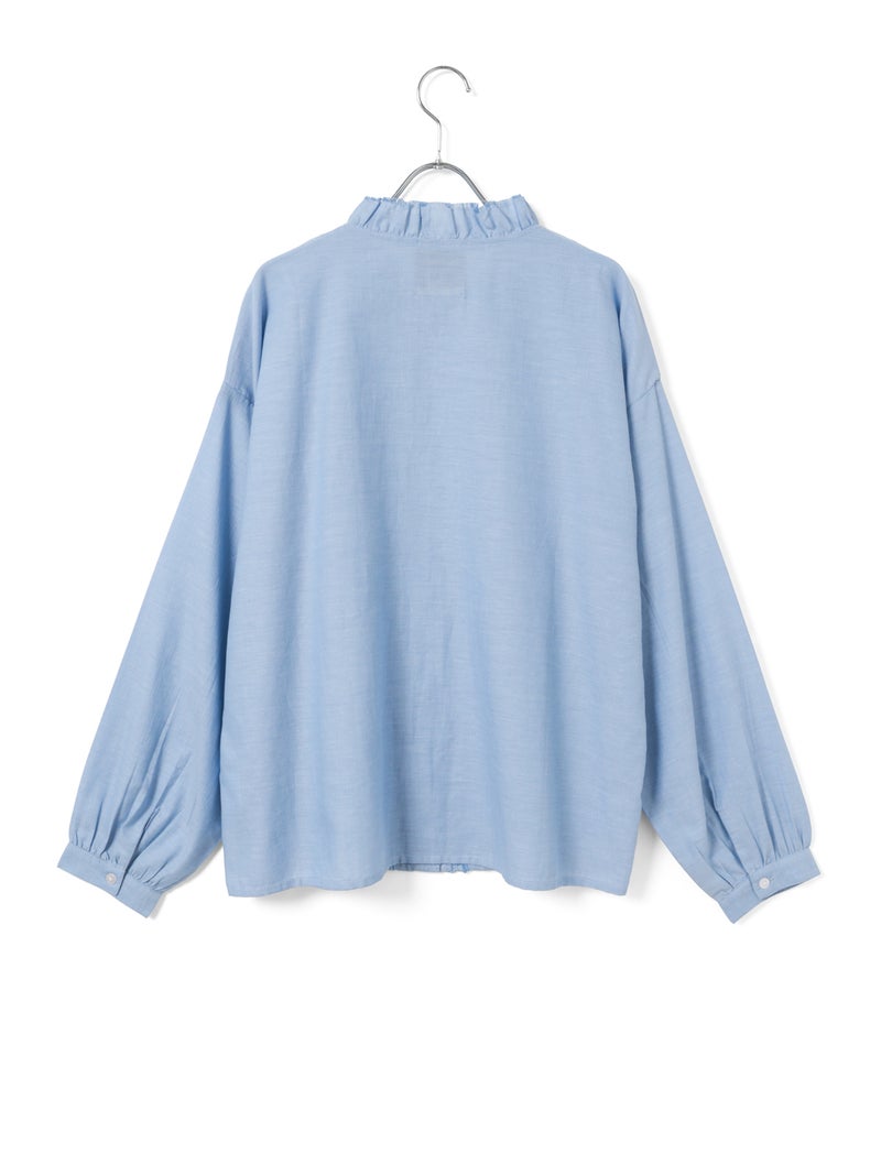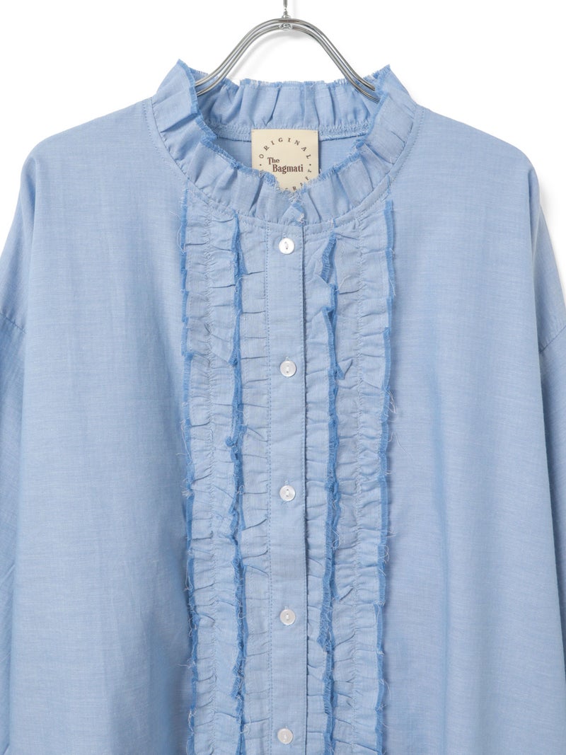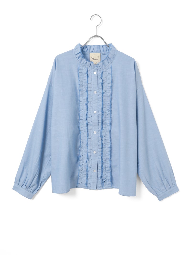 フロントにあしらったフリルが印象的なブラウス。襟元にもさりげなくフリルを施し、やわらかく女性らしい雰囲気に仕上げました。切りっぱなし風のディテールがほどよい抜け感を生み出し、甘くなりすぎないバランスもポイント。さらりとした軽やかな素材感で、季節の変わり目にも取り入れやすい一枚です。ゆったりとしたシルエットでリラックス感があり、デニムやワイドパンツなどカジュアルなボトムとも好相性。一枚でコーディネートの主役になるアイテムです。
