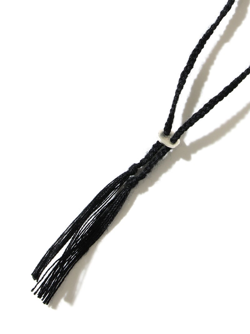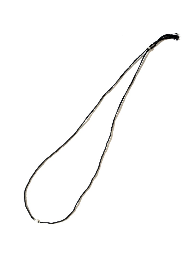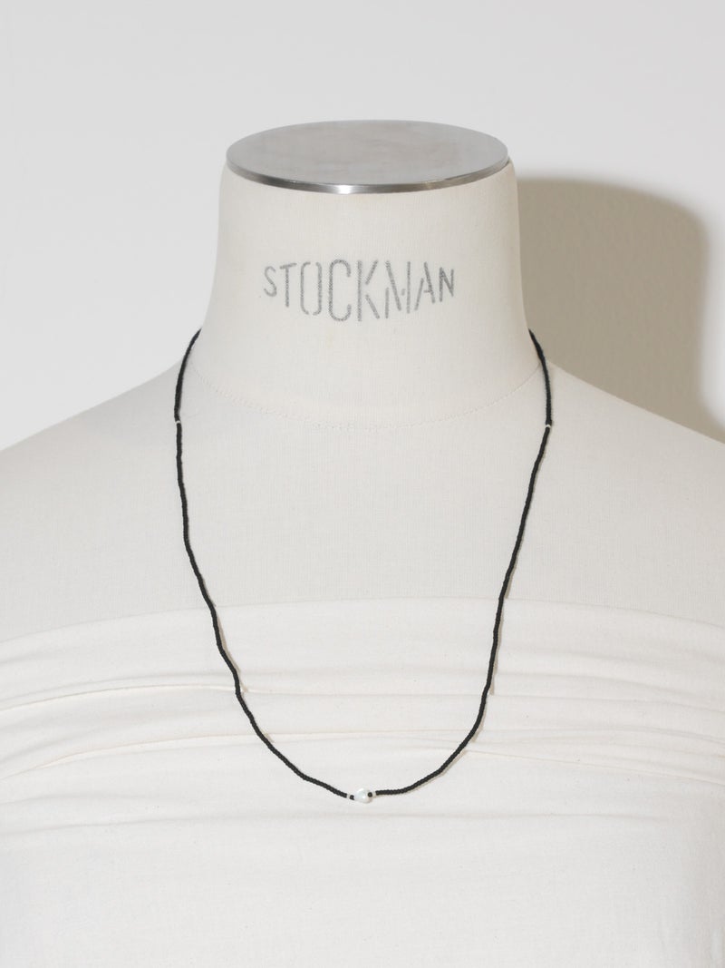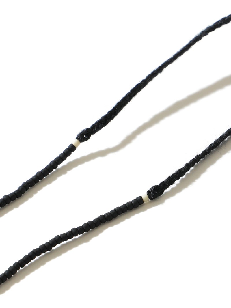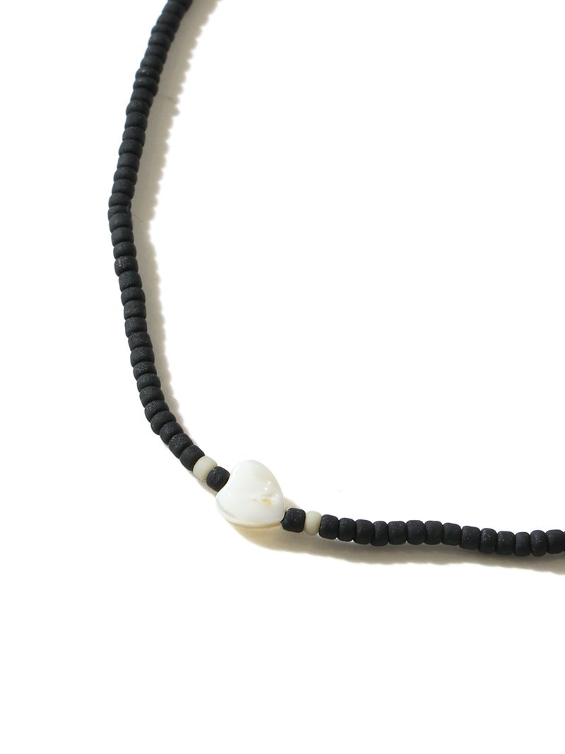 ブラックのビーズに、フロントアクセントにはホワイトハートモチーフを配した軽やかなデザイン。細やかなビーズがさりげない表情を生み、コーディネートに彩りを添えながらもシックで大人な印象に仕上げてくれるアイテムです。長さは調整可能です。
