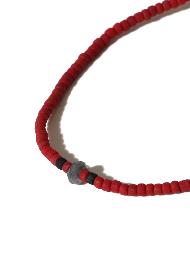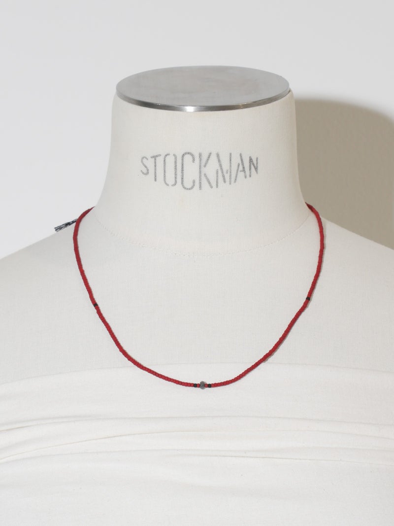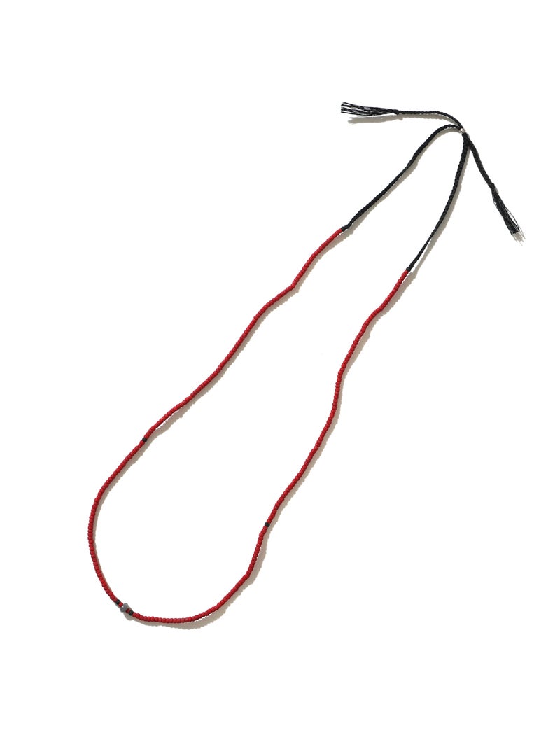 レッドのビーズをあしらい、フロントにはアンティークゴールドをアクセントに配した軽やかなデザイン。細やかなビーズがさりげない表情を生み、コーディネートに彩りを添えながらもシックで大人な印象に仕上げてくれるアイテムです。長さは調整可能です。