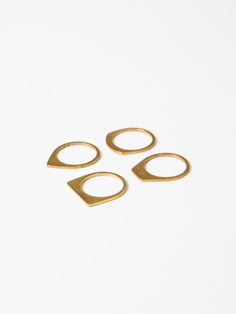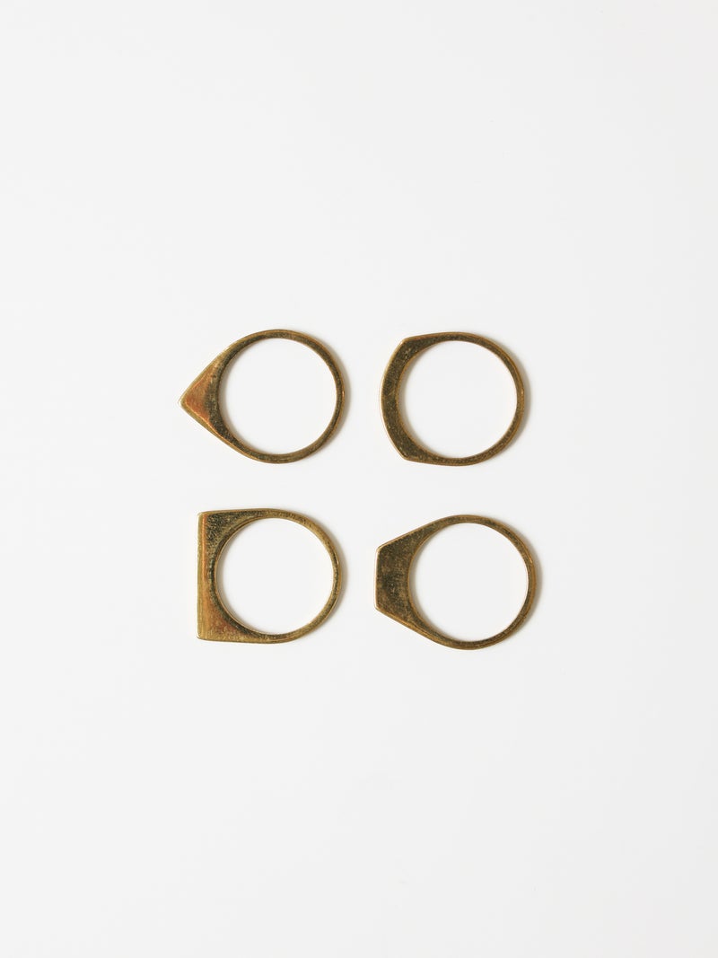 モードな印象が際立つ、ゴールドカラーの4連リング。それぞれ形の異なるリングを重ねたデザインが特徴で、指元に奥行きと立体感をもたらします。シンプルながらも存在感があり、ひとつでスタイリングのアクセントになるアイテム。モードな装いにはもちろん、ミニマルなコーディネートに取り入れるだけで、手元に洗練されたニュアンスをプラスしてくれます。
