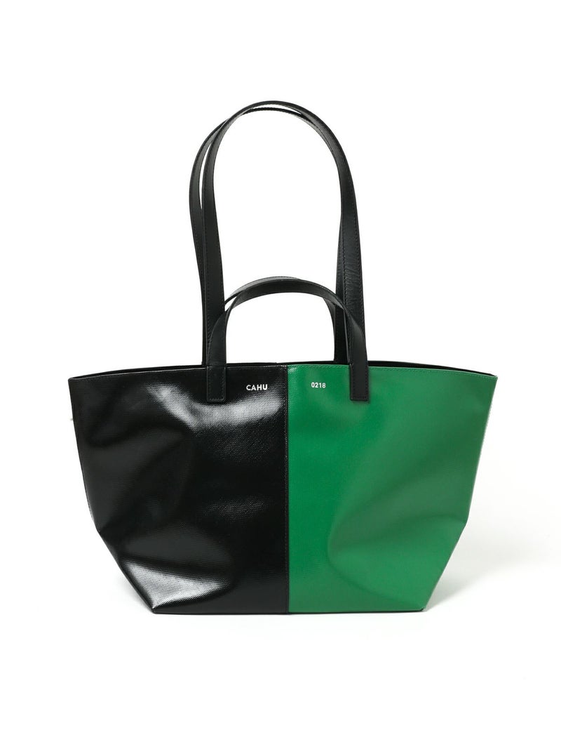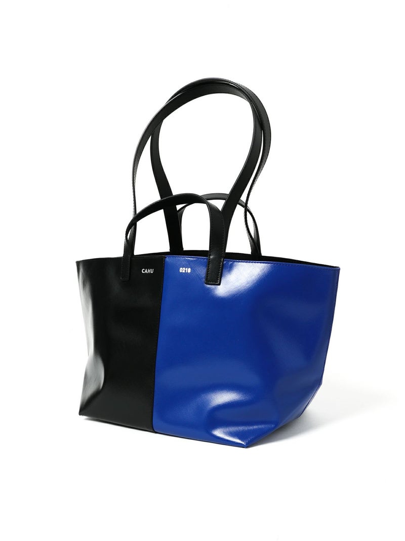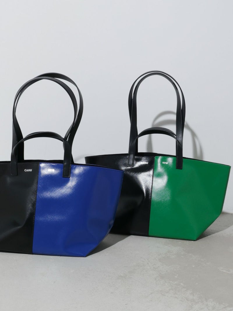 CAHUを代表する定番トートバッグ。PVCキャンバスの撥水性とレザーハンドルの上品さを兼ね備え、デイリーから通勤・一泊旅行まで活躍します。A4がゆったり入る実用的なサイズに、長さの異なる2種類のハンドルで手持ち・肩掛けの両方に対応。使い勝手の良さと存在感をのあるデザインが魅力。鮮やかなブルー×ブラック、グリーン×ブラックの2色展開で、コーデをさりげなく格上げします。