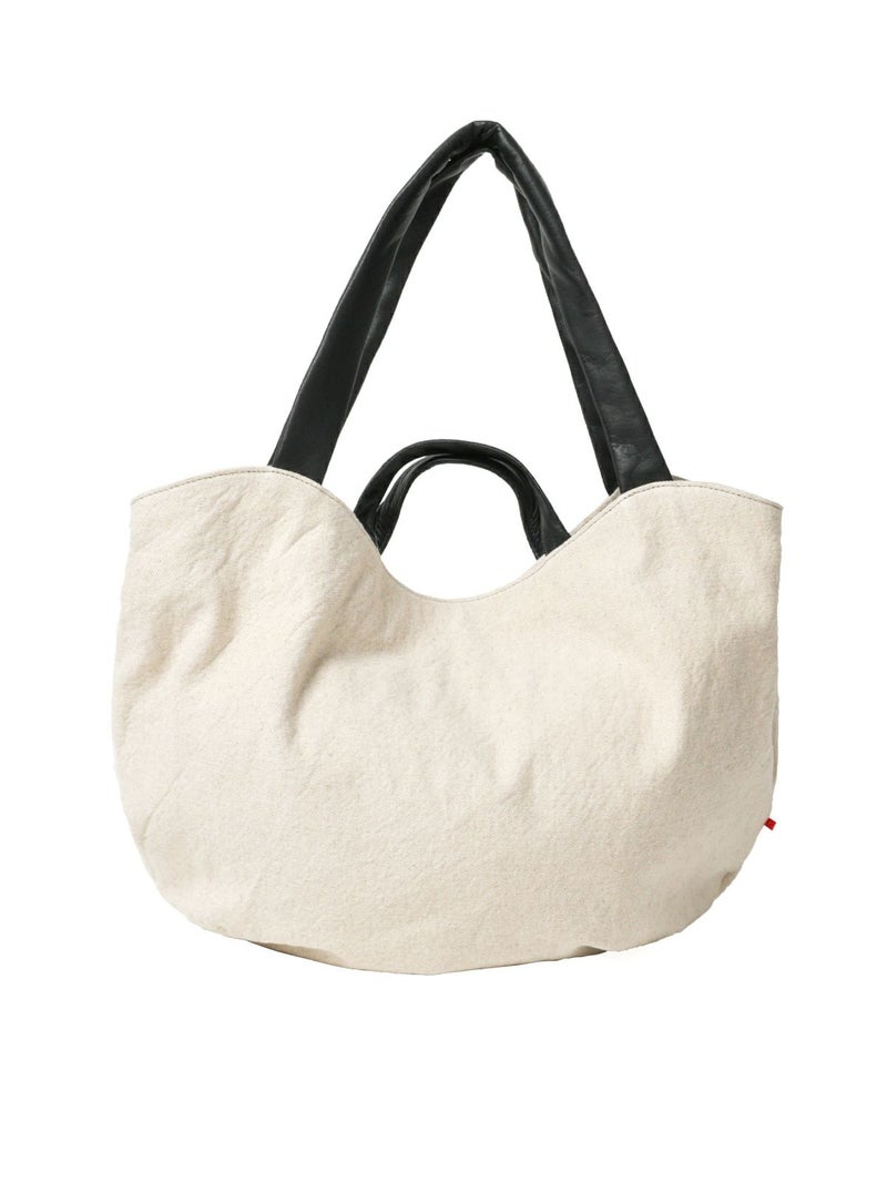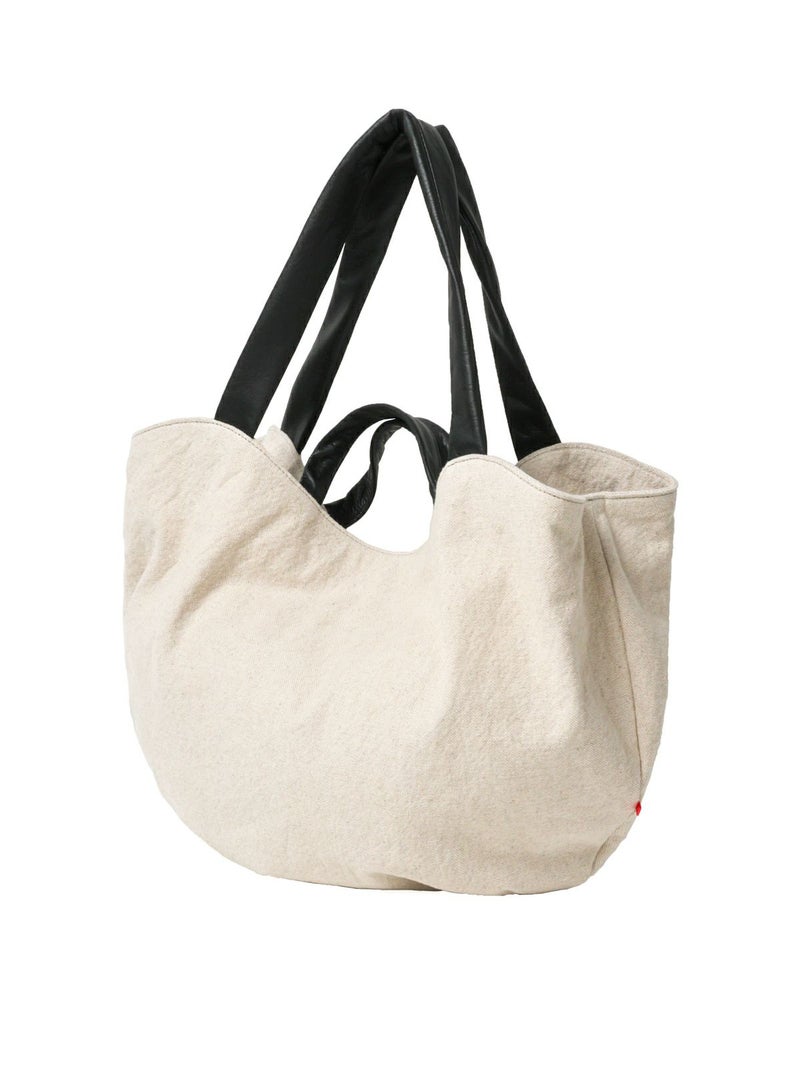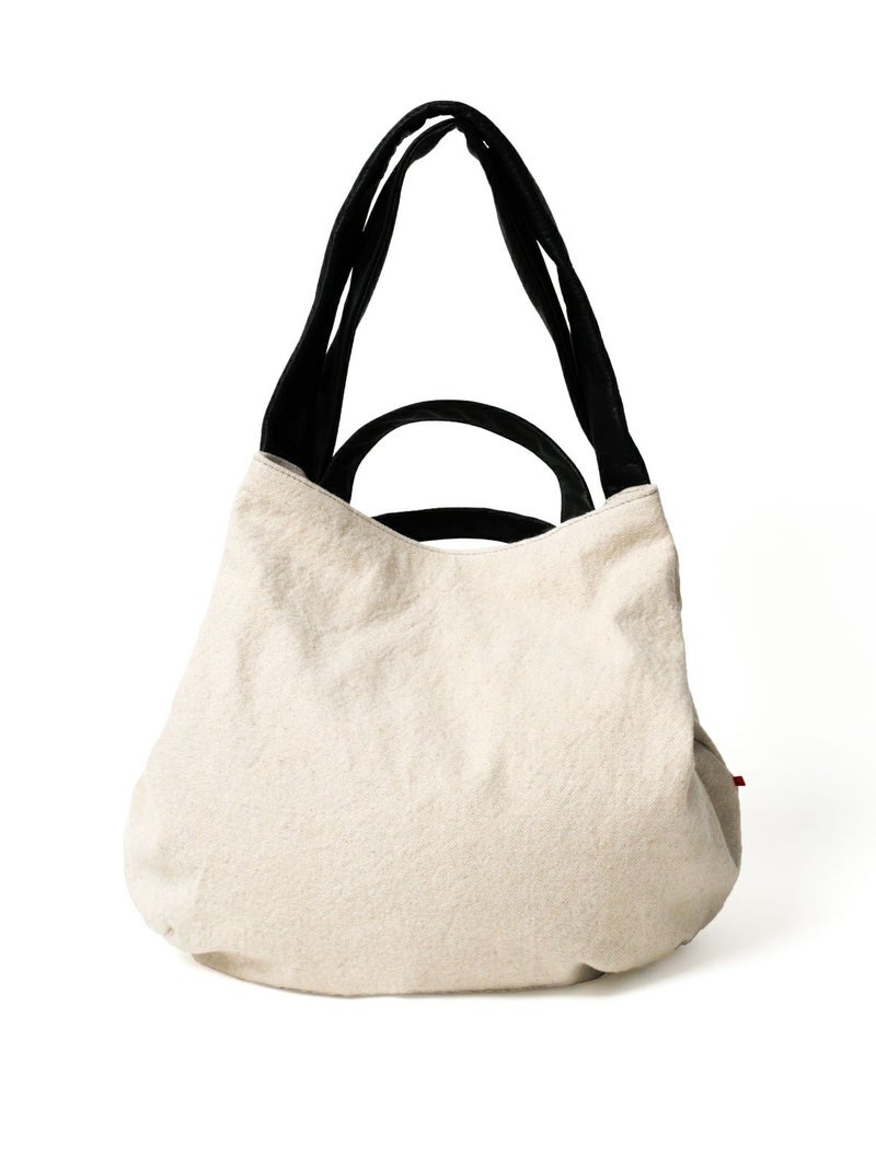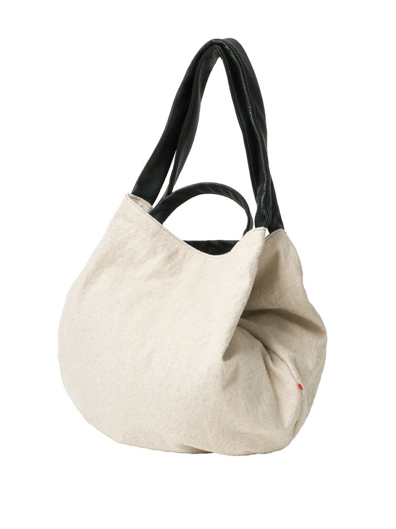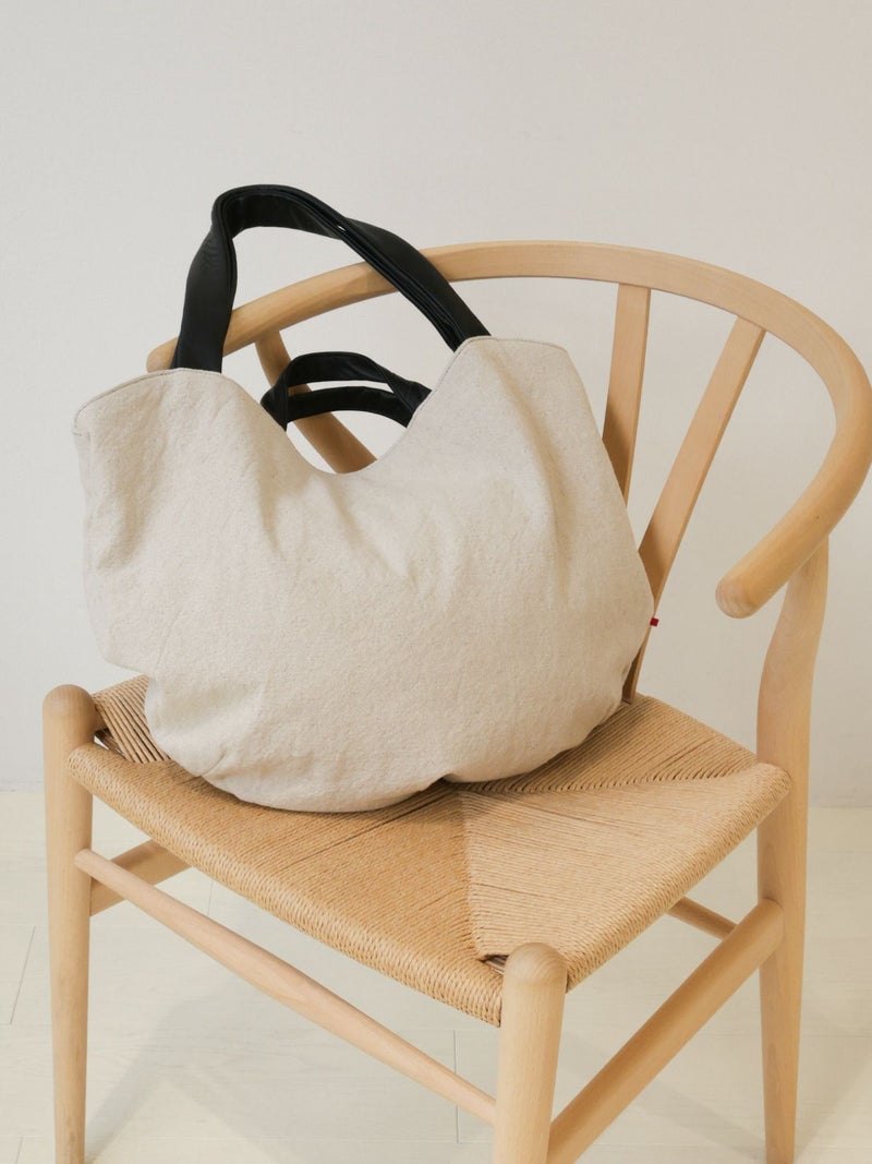 表情豊かな綿麻生地と、もっちり感のあるシュリンクレザーを組み合わせた2WAYバッグです。やわらかな丸みを帯びたデザインが印象的で、開閉はマグネットボタン仕様。マグネットの留め方によってシルエットが変わるため、気分や荷物量に合わせてフォルムを楽しめます。バッグの内側は使いやすい2層構造で、両サイドには小物の収納に便利なポケットも備えています。肩掛け可能なショルダーとA4サイズも収まる実用的なサイズ感で、通勤やお出かけにも活躍します。使い込むほど深まる風合いを楽しめます。