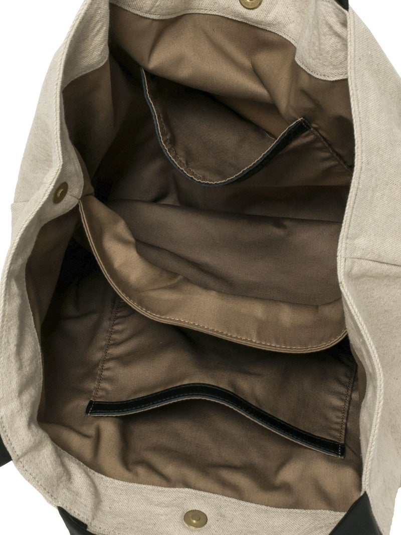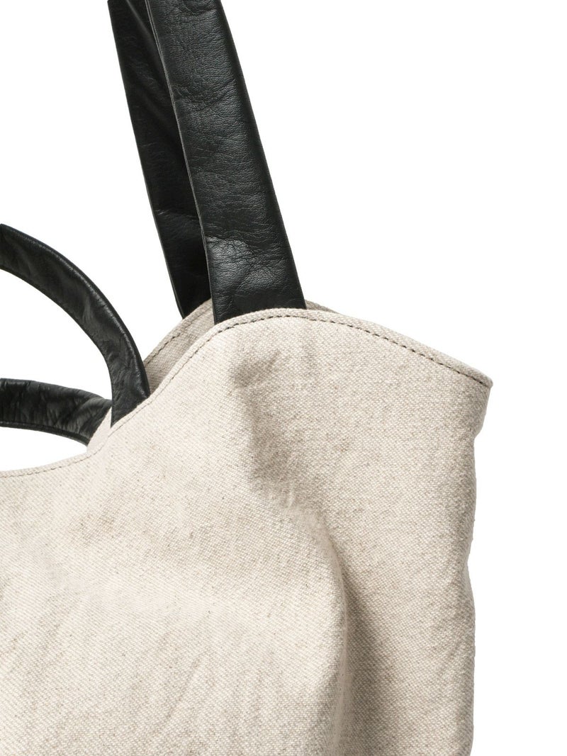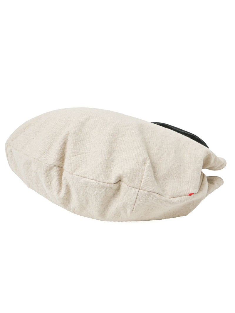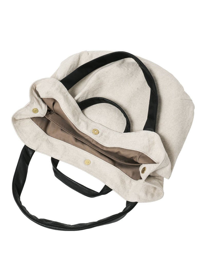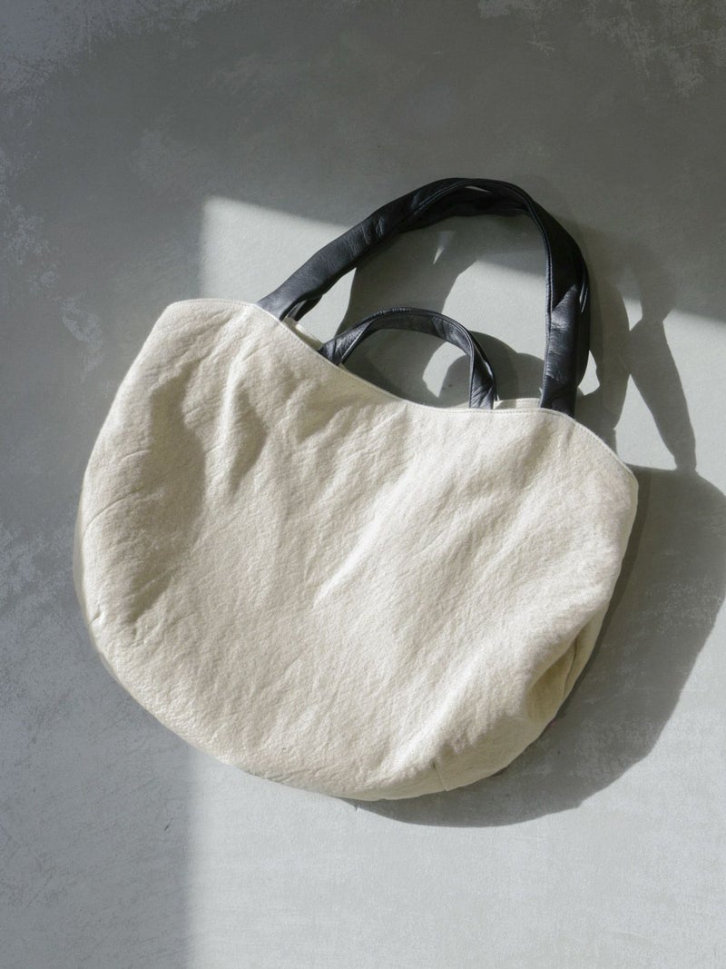 表情豊かな綿麻生地と、もっちり感のあるシュリンクレザーを組み合わせた2WAYバッグです。やわらかな丸みを帯びたデザインが印象的で、開閉はマグネットボタン仕様。マグネットの留め方によってシルエットが変わるため、気分や荷物量に合わせてフォルムを楽しめます。バッグの内側は使いやすい2層構造で、両サイドには小物の収納に便利なポケットも備えています。肩掛け可能なショルダーとA4サイズも収まる実用的なサイズ感で、通勤やお出かけにも活躍します。使い込むほど深まる風合いを楽しめます。