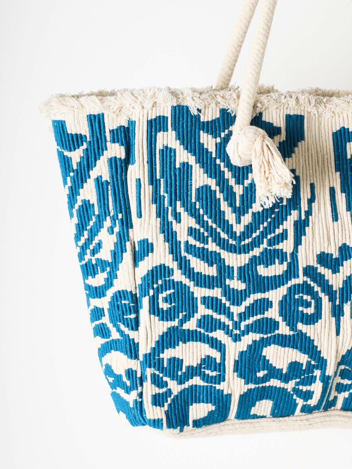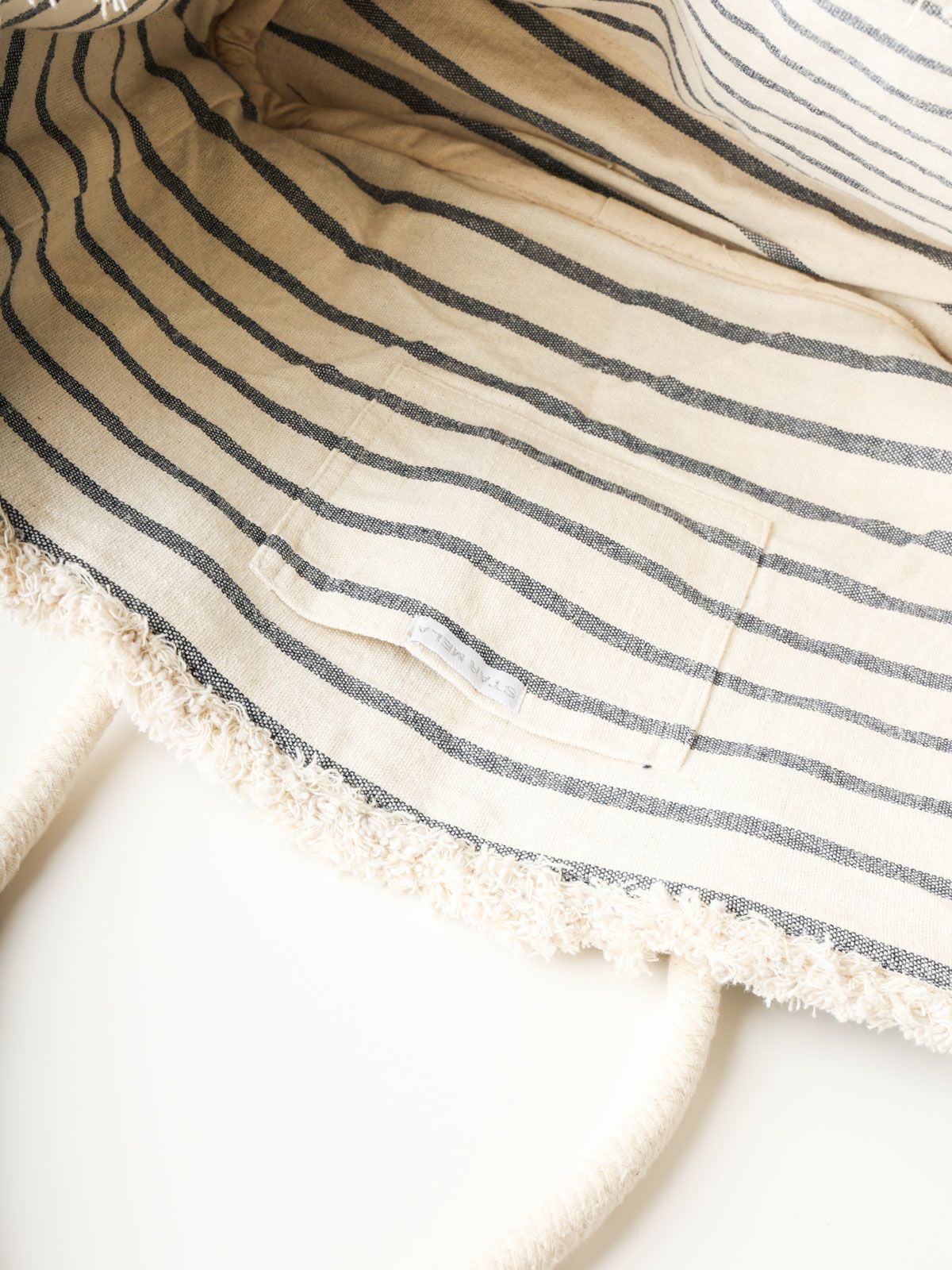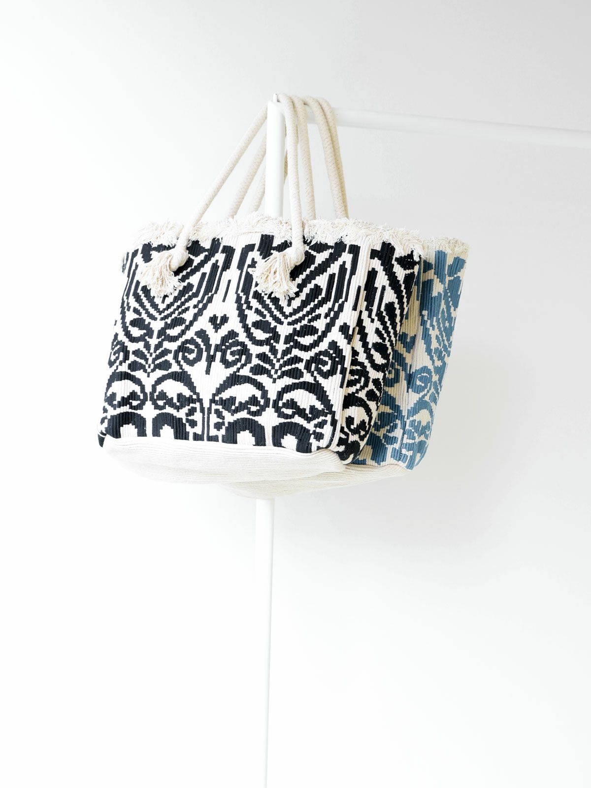 ロープ素材のしっかりとしたトートバッグです。エキゾチックな柄と内側はボーダー柄が爽やかなバッグ。オールシーズン合わせやすいスタイル。しっかりとした作りで大容量なので通勤・通学・お買い物とどんなシーンでも使いやすいバッグです。※ハンドメイドの1点ものです。天然素材を使用しているため、糸とび、色ムラ、小さなシミなどが見られます。