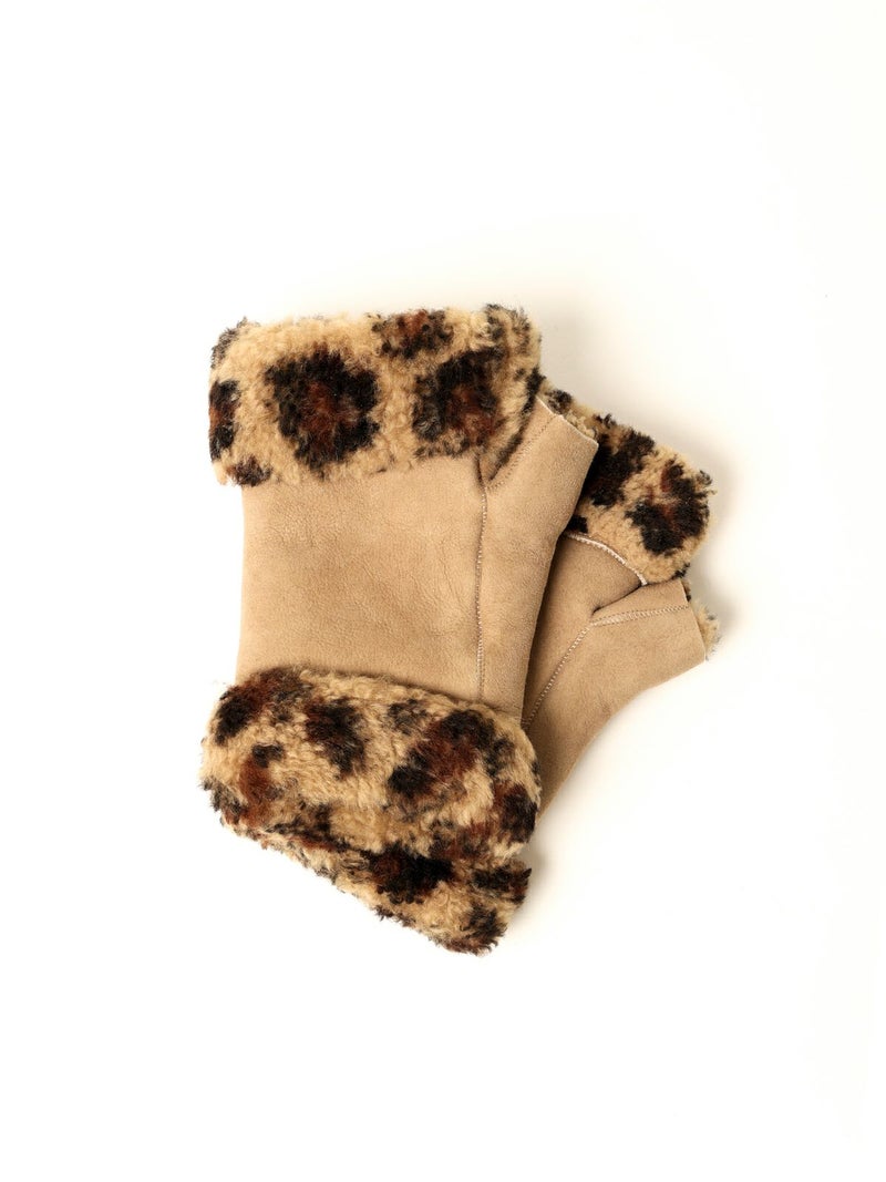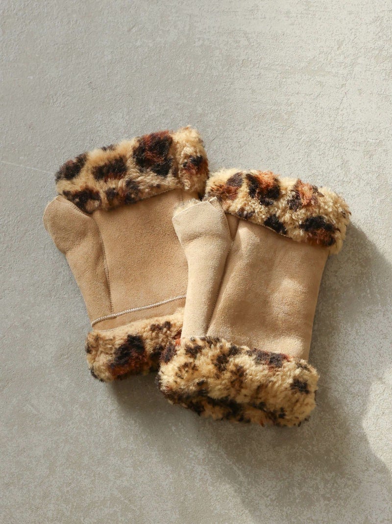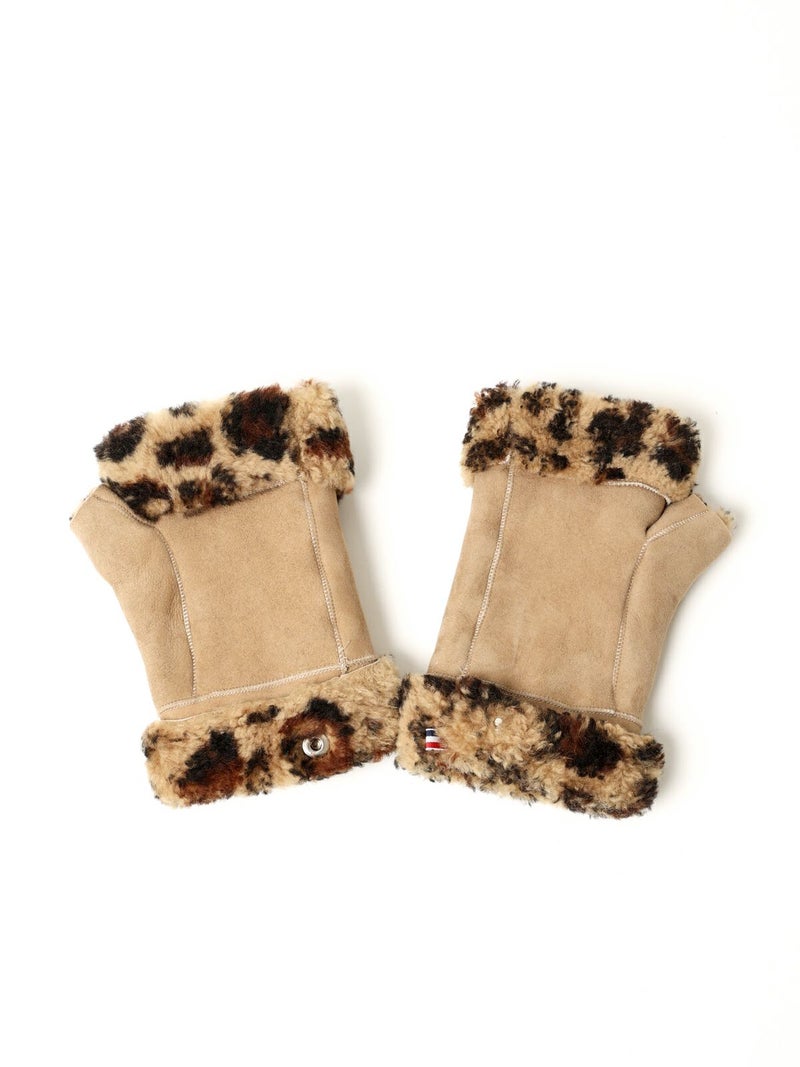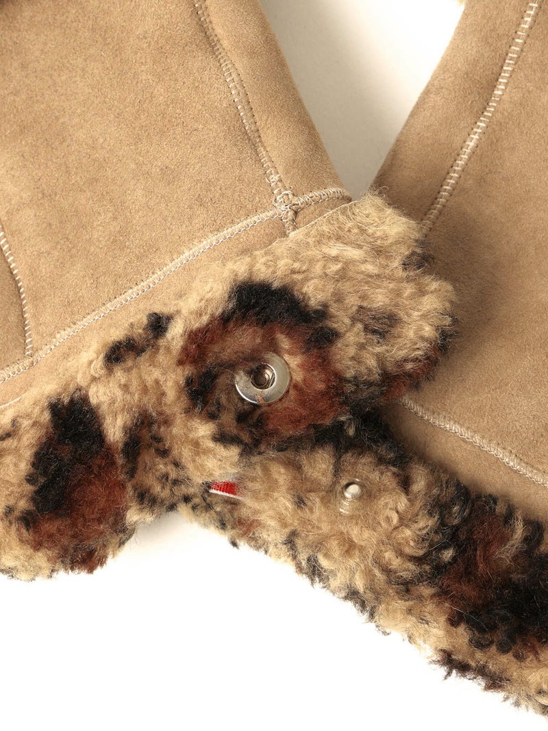 リサイクルメリノウールシープスキンを使用した、ミトン型グローブ。軽くて暖かい着け心地を実現。手首部分のレオパード柄ボアが華やかなアクセントとなり、ナチュラルなベージュスエードと柔らかなファーの組み合わせが上品さと遊び心を演出します。指先が自由に動くデザインで、スマートフォン操作や日常使いにも最適なアイテム。同シリーズもあわせてご覧ください。