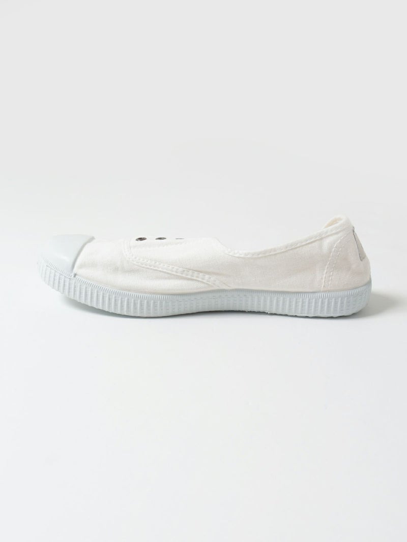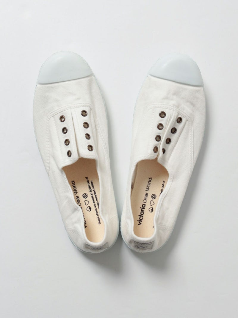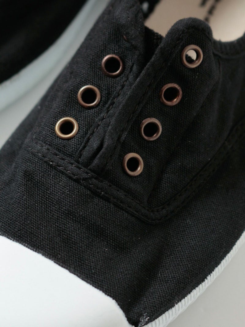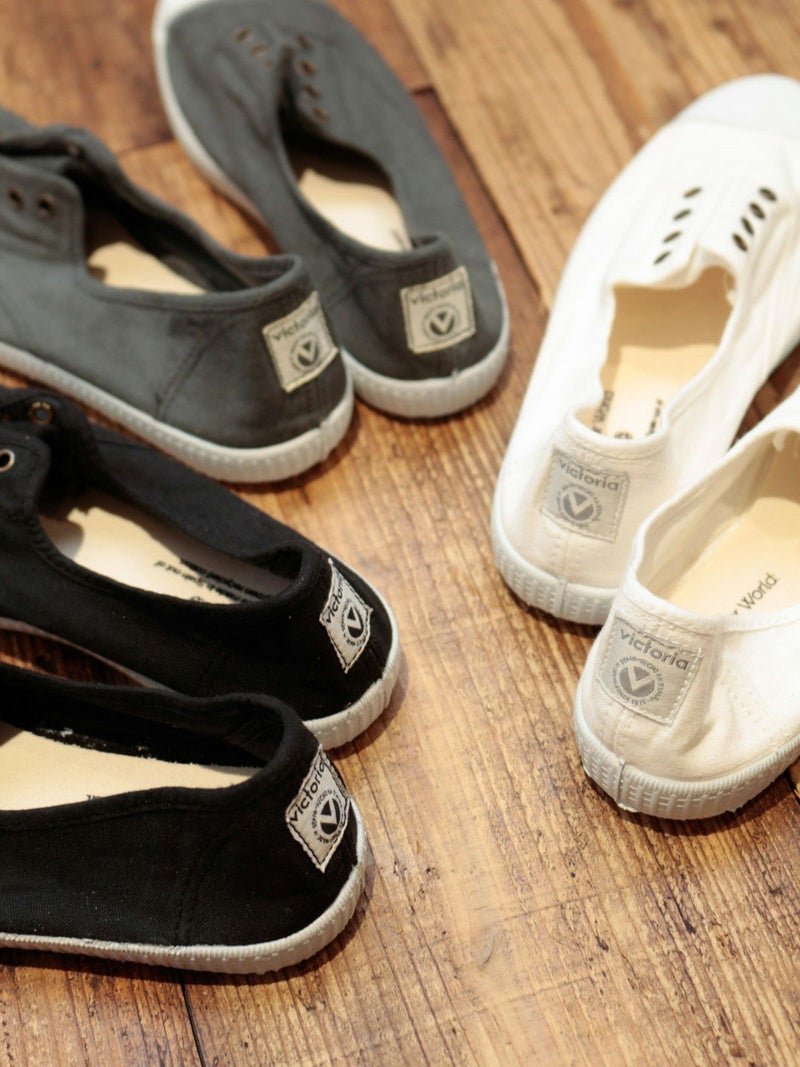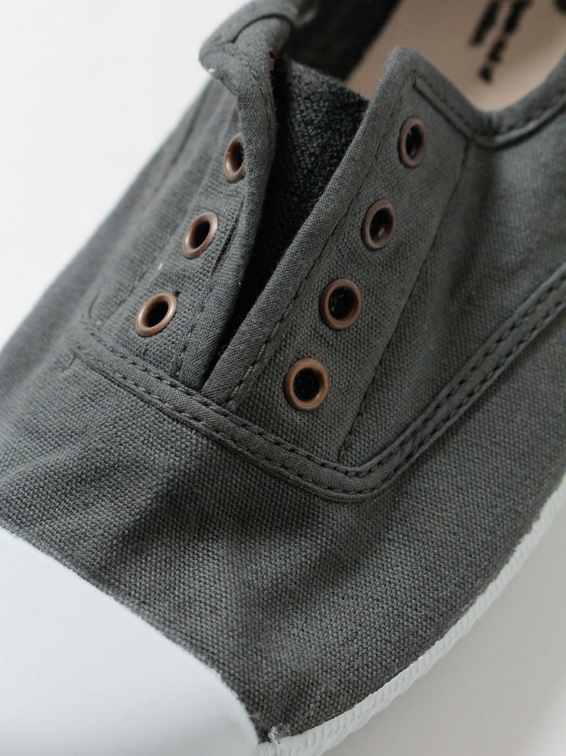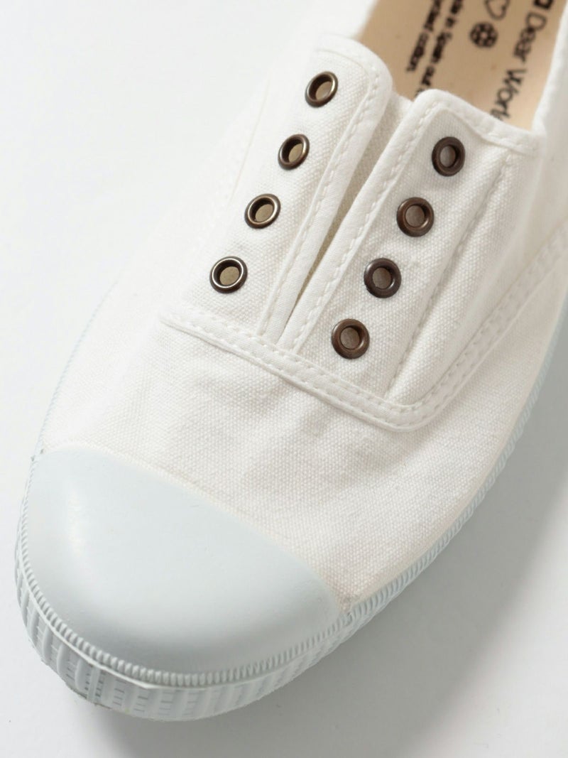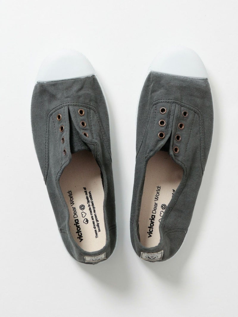 シンプルなキャンバス素材のスリッポンです。靴紐がなく、履き口がゴム仕様になっているので、楽に脱ぎ履きできます。カジュアルなスタイル、デイリー使いに良さそうです。