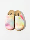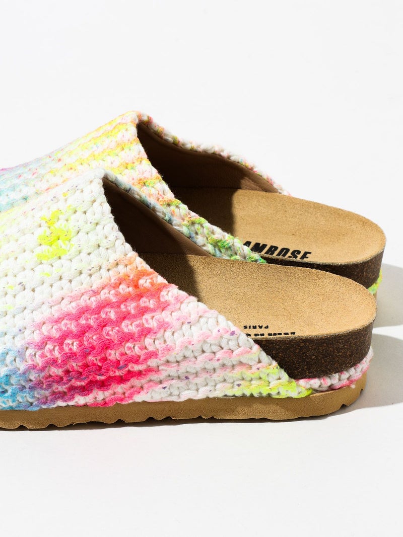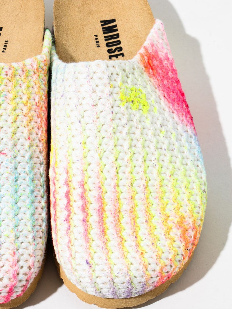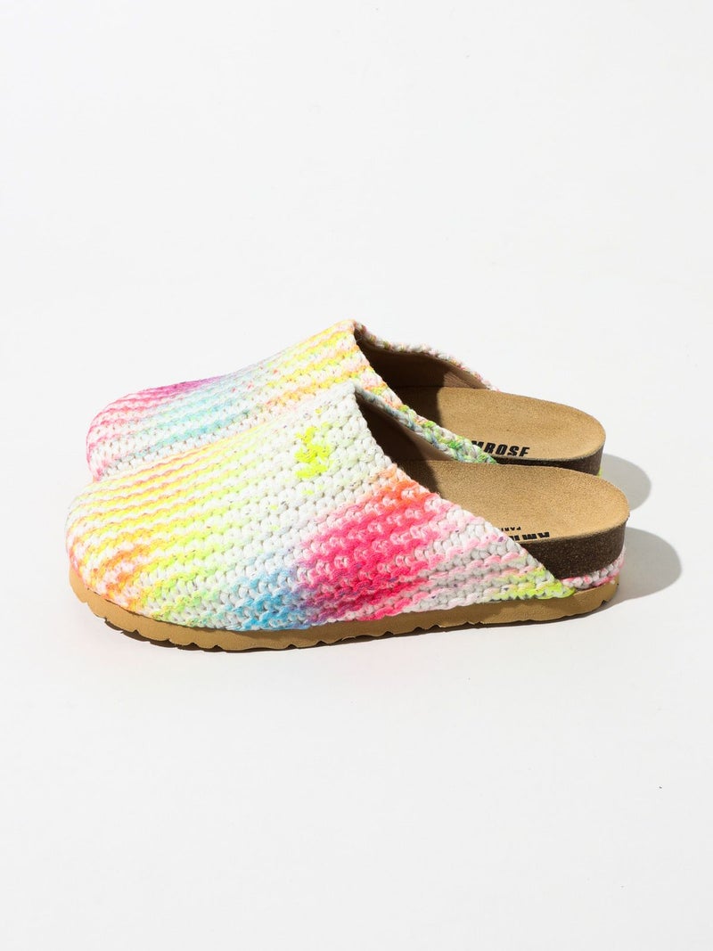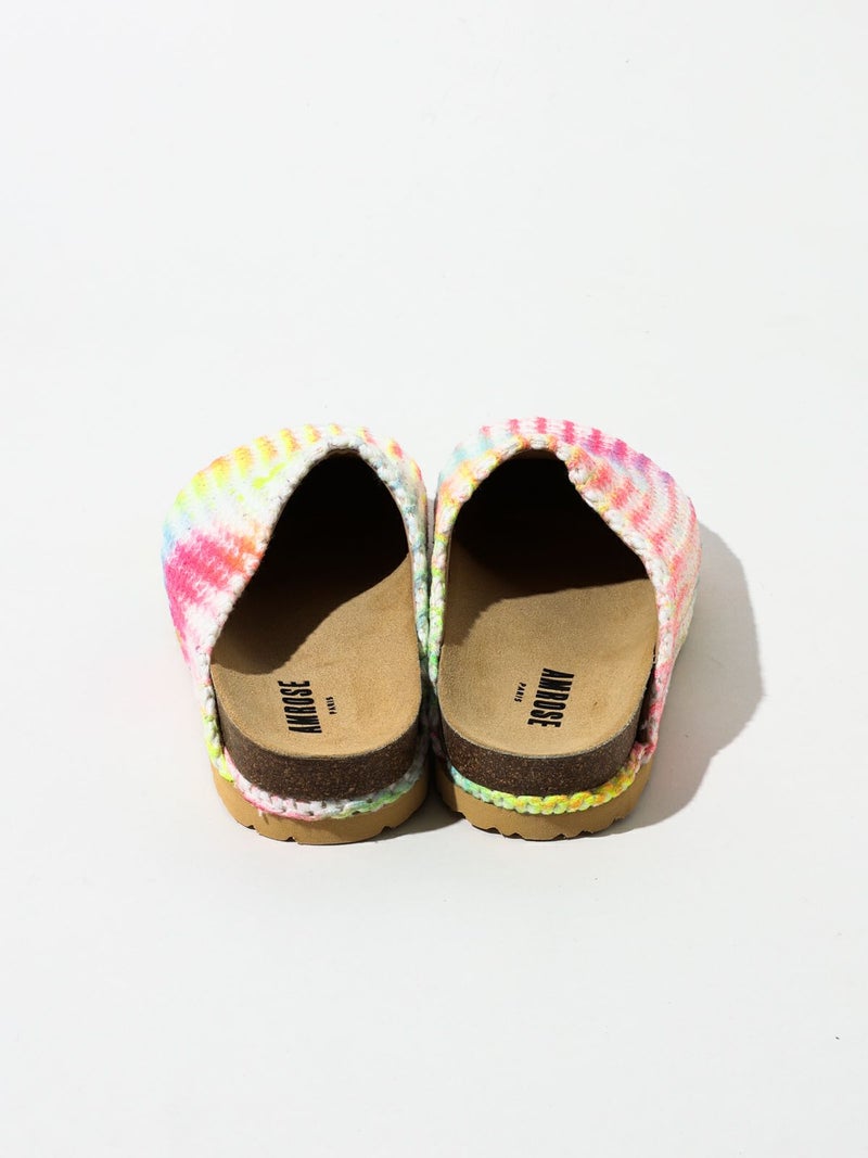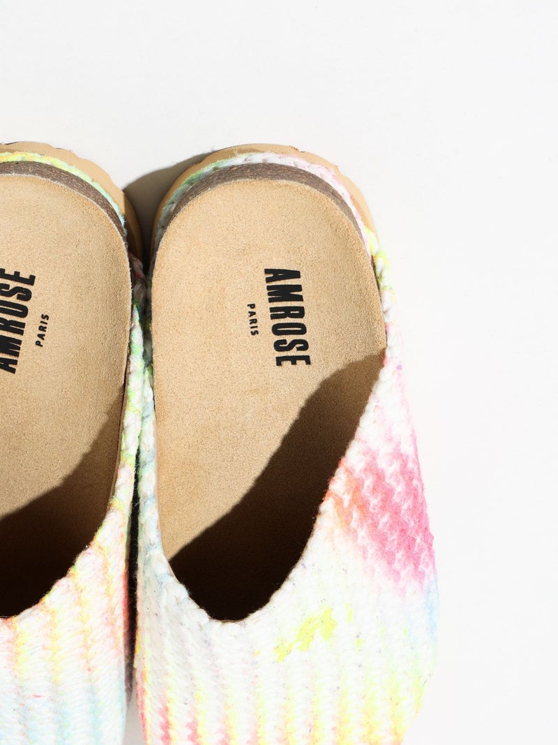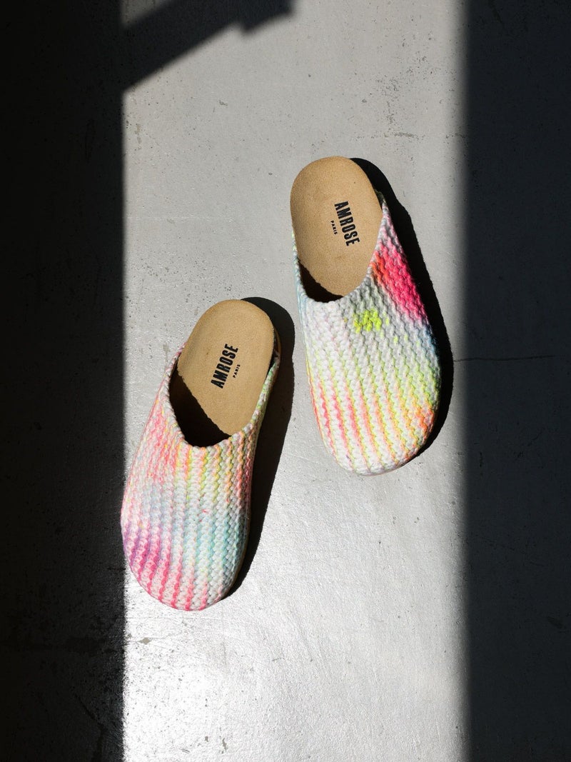 AMROSEのクロッグコレクションの中でも特に目を引くアイテムです。ホワイトのコットンアッパーに、ネオンカラーの刺繍とペイントが施され、まるでキャンバスに描かれたアートのような仕上がり、刺繍にはウールを使用し、立体感と温かみのある表情を持たせています。また、アッパーは100%オーガニックコットン(GOTS認証)で作られており、環境にも配慮されています。内側はレザーで仕上げられ、快適な履き心地。ソールには軽量で耐久性のあるEVA素材を使用し、長時間の歩行でも疲れにくい設計。これらのクロッグは、ポルトガルのアトリエで丁寧に製造され、1足1足がユニークな仕上がりとなっています。コットンの収納袋付き。とても軽くコンフォートな履き心地。日本サイズで約24.0〜24.5cm相当となります。サンダルスタイルのため、23cm〜24.5cm程度の方に履いていただけるサイズ感です。
